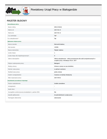Powiatowy Urząd Pracy w Białogardzie MAJSTER BUDOWY Identyfikacja oferty Numer oferty: StPr/17/0152 Ważna od: 2017-02-14 Ważna do: 2017-03-13 Czy zamknięta: Tak* Czy subsydiowana*: Tak Zgłaszane miejsce pracy Nazwa zawodu: Kierownik budowy Kod zawodu: 132301 Nazwa stanowiska: Majster budowy Liczba miejsc: 1 Liczba miejsc dla niepełnosprawnych: 0 Zakres obowiązków: Oferta subsydiowana - oferta przeznaczona dla osób zarejestrowanych w urzędzie pracy. refundacja 30 art. 150 f Miejsce wykonywania pracy: Białogard Rodzaj umowy: Umowa o pracę na czas określony Wymiar czasu pracy: w pełnym wymiarze Rozkład czasu pracy: jedna zmiana System wynagradzania: Czasowy ze stawką miesięczną Data rozpoczęcia pracy: 2017-04-01 Oczekiwania pracodawcy krajowego Poziom wykształcenia: średnie zawodowe Umiejętności: - Języki obce: - Szczególnie zainteresowany kandydatami z państw EOG: Nie Sposób aplikowania: Za pośrednictwem urzędu pracy Wymagane dokumenty: skierowanie