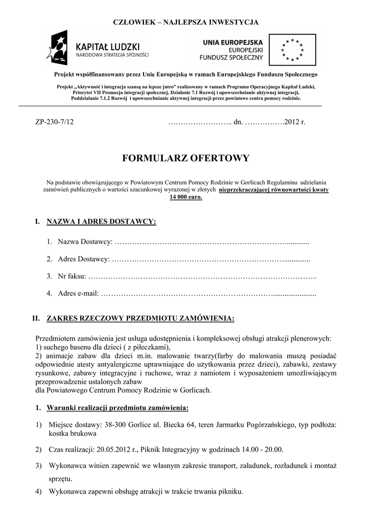 CZŁOWIEK – NAJLEPSZA INWESTYCJA Projekt współfinansowany przez Unię Europejską w ramach Europejskiego Funduszu Społecznego Projekt „Aktywność i integracja szansą na lepsze jutro” realizowany w ramach Programu Operacyjnego Kapitał Ludzki, Priorytet VII Promocja integracji społecznej, Działanie 7.1 Rozwój i upowszechnianie aktywnej integracji, Poddziałanie 7.1.2 Rozwój i upowszechnianie aktywnej integracji przez powiatowe centra pomocy rodzinie. ZP-230-7/12 …………………….. dn. …………….2012 r. FORMULARZ OFERTOWY Na podstawie obowiązującego w Powiatowym Centrum Pomocy Rodzinie w Gorlicach Regulaminu udzielania zamówień publicznych o wartości szacunkowej wyrażonej w złotych nieprzekraczającej równowartości kwoty 14 000 euro. I. NAZWA I ADRES DOSTAWCY: 1. Nazwa Dostawcy: ……………………………………………………………............ 2. Adres Dostawcy: …………………………………………………………….............. 3. Nr faksu: ……………………………………………………………………………….. 4. Adres e-mail: ……………………………………………………………....................... II. ZAKRES RZECZOWY PRZEDMIOTU ZAMÓWIENIA: Przedmiotem zamówienia jest usługa udostępnienia i kompleksowej obsługi atrakcji plenerowych: 1) suchego basenu dla dzieci ( z piłeczkami), 2) animacje zabaw dla dzieci m.in. malowanie twarzy(farby do malowania muszą posiadać odpowiednie atesty antyalergiczne uprawniające do użytkowania przez dzieci), zabawki, zestawy rysunkowe, zabawy integracyjne i ruchowe, wraz z namiotem i wyposażeniem umożliwiającym przeprowadzenie ustalonych zabaw dla Powiatowego Centrum Pomocy Rodzinie w Gorlicach. 1. Warunki realizacji przedmiotu zamówienia: 1) Miejsce dostawy: 38-300 Gorlice ul. Biecka 64, teren Jarmarku Pogórzańskiego, typ podłoża: kostka brukowa 2) Czas realizacji: 20.05.2012 r., Piknik Integracyjny w godzinach 14.00 - 20.00. 3) Wykonawca winien zapewnić we własnym zakresie transport, załadunek, rozładunek i montaż sprzętu. 4) Wykonawca zapewni obsługę atrakcji w trakcie trwania pikniku. 5) Wykonawca zapewni namiot (potrzebny do animacji zabaw dla dzieci) z wyposażeniem umożliwiającym przeprowadzenie ustalonych zabaw. 6) Wykonawca zapewni agregat prądotwórczy (wraz z paliwem) potrzebny do prawidłowego funkcjonowania sprzętu – w razie konieczności. Zamawiający zapewnia dostęp do źródła prądu. 7) Wykonawca winien posiadać aktualne ubezpieczenia OC. Kserokopię polisy, stwierdzoną za zgodność z oryginałem, należy dołączyć do niniejszej oferty. 8) W cenie ofertowej Dostawca zobowiązany jest uwzględnić wszystkie ewentualne opusty oraz koszty jakie poniesie w związku z organizacją i realizacją zamówienia. 9) Zamawiający zastrzega sobie prawo do wyboru jednej z zamawianych atrakcji, w przypadku zaistnienia okoliczności uniemożliwiających pokrycie kosztów wynajmu dwóch atrakcji. O ostatecznej liczbie zamawianych atrakcji Wykonawca zostanie poinformowany na etapie podpisywania umowy, po rozstrzygnięciu niniejszego zapytania ofertowego. 10) Złożenie oferty przez Wykonawcę nie oznacza zarezerwowania przez Zamawiającego atrakcji plenerowych. Rezerwacja atrakcji w danym terminie następuje w momencie wysłania potwierdzenia rezerwacji a następnie podpisania umowy, z uwzględnieniem zapisu pkt. 9. 2. Warunki płatności Po wywiązaniu się z warunków umowy, Dostawca wystawi fakturę VAT / rachunek płatną w terminie 14 dni od daty otrzymania jej przez Zamawiającego. 3. Oświadczenie Dostawcy Oświadczam, że: 1) zapoznałem się z warunkami realizacji przedmiotu zamówienia określonymi w pkt. 1 niniejszego formularza, akceptuje je i nie wnoszę do nich zastrzeżeń, 2) cena ofertowa jest ceną gwarantowaną i nie wzrośnie do czasu realizacji przedmiotu niniejszego zamówienia. Lp. Nazwa przedmiotu zamówienia Cena brutto 1 Suchy basen dla dzieci (z piłeczkami) 2 Animacje zabaw dla dzieci m.in. malowanie twarzy, zabawki, zestawy rysunkowe, zabawy integracyjne i ruchowe, wraz z: - namiotem, wyposażeniem i obsługą umożliwiającą przeprowadzenie ustalonych zabaw RAZEM Mile widziane zdjęcie przedstawiające oferowany sprzęt. WARTOŚĆ BRUTTO (określona z dokładnością do dwóch miejsc po przecinku): …………………………………zł (słownie: ………………………………………………………………………………… ) ………………………………………………. (podpis osoby/osób umocowanej/umocowanych)
