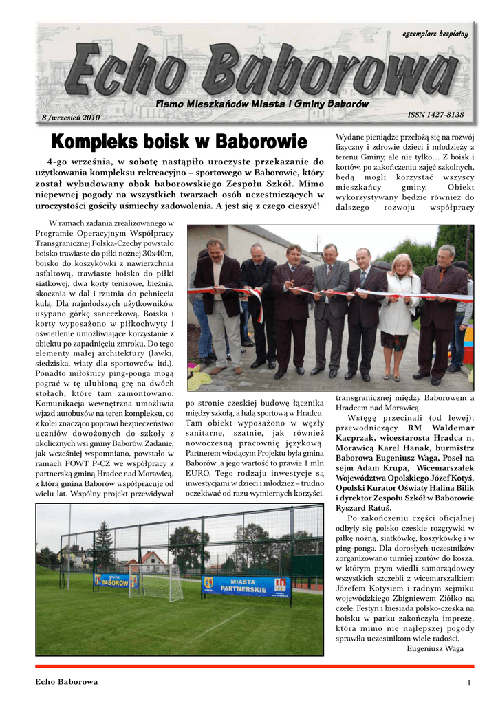 egzemplarz bezpła tny bezpłatny Pismo Mieszkańców Miasta i Gminy Baborów ISSN 1427-8138 8 /wrzesień 2010 Kompleks bo isk w Babor owie boisk Baborowie 4-go września, w sobotę nastąpiło uroczyste przekazanie do użytkowania kompleksu rekreacyjno – sportowego w Baborowie, który został wybudowany obok baborowskiego Zespołu Szkół. Mimo niepewnej pogody na wszystkich twarzach osób uczestniczących w uroczystości gościły uśmiechy zadowolenia. A jest się z czego cieszyć! W ramach zadania zrealizowanego w Programie Operacyjnym Współpracy Transgranicznej Polska-Czechy powstało boisko trawiaste do piłki nożnej 30x40m, boisko do koszykówki z nawierzchnia asfaltową, trawiaste boisko do piłki siatkowej, dwa korty tenisowe, bieżnia, skocznia w dal i rzutnia do pchnięcia kulą. Dla najmłodszych użytkowników usypano górkę saneczkową. Boiska i korty wyposażono w piłkochwyty i oświetlenie umożliwiające korzystanie z obiektu po zapadnięciu zmroku. Do tego elementy małej architektury (ławki, siedziska, wiaty dla sportowców itd.). Ponadto miłośnicy ping-ponga mogą pograć w tę ulubioną grę na dwóch stołach, które tam zamontowano. Komunikacja wewnętrzna umożliwia wjazd autobusów na teren kompleksu, co z kolei znacząco poprawi bezpieczeństwo uczniów dowożonych do szkoły z okolicznych wsi gminy Baborów. Zadanie, jak wcześniej wspomniano, powstało w ramach POWT P-CZ we współpracy z partnerską gminą Hradec nad Morawicą, z którą gmina Baborów współpracuje od wielu lat. Wspólny projekt przewidywał Echo Baborowa po stronie czeskiej budowę łącznika między szkołą, a halą sportową w Hradcu. Tam obiekt wyposażono w węzły sanitarne, szatnie, jak również nowoczesną pracownię językową. Partnerem wiodącym Projektu była gmina Baborów ,a jego wartość to prawie 1 mln EURO. Tego rodzaju inwestycje są inwestycjami w dzieci i młodzież – trudno oczekiwać od razu wymiernych korzyści. Wydane pieniądze przełożą się na rozwój fizyczny i zdrowie dzieci i młodzieży z terenu Gminy, ale nie tylko… Z boisk i kortów, po zakończeniu zajęć szkolnych, będą mogli korzystać wszyscy mieszkańcy gminy. Obiekt wykorzystywany będzie również do dalszego rozwoju współpracy transgranicznej między Baborowem a Hradcem nad Morawicą. Wstęgę przecinali (od lewej): przewodniczący RM Waldemar Kacprzak, wicestarosta Hradca n, Morawicą Karel Hanak, burmistrz Baborowa Eugeniusz Waga, Poseł na sejm Adam Krupa, Wicemarszałek Województwa Opolskiego Józef Kotyś, Opolski Kurator Oświaty Halina Bilik i dyrektor Zespołu Szkół w Baborowie Ryszard Ratuś. Po zakończeniu części oficjalnej odbyły się polsko czeskie rozgrywki w piłkę nożną, siatkówkę, koszykówkę i w ping-ponga. Dla dorosłych uczestników zorganizowano turniej rzutów do kosza, w którym prym wiedli samorządowcy wszystkich szczebli z wicemarszałkiem Józefem Kotysiem i radnym sejmiku wojewódzkiego Zbigniewem Ziółko na czele. Festyn i biesiada polsko-czeska na boisku w parku zakończyła imprezę, która mimo nie najlepszej pogody sprawiła uczestnikom wiele radości. Eugeniusz Waga 1 Łyżka dziegciu Jak mówi stare ludowe przysłowie - łyżka dziegciu beczkę miodu zepsuje. Trudno z ludową mądrością dyskutować; można , co najwyżej, dopasować ją do otaczającej nas rzeczywistości, co spróbuję uczynić. Tuż po uroczystościach związanych z zakończeniem Projektu i przekazaniem do eksploatacji kompleksu urządzeń sportowych przy Zespole Szkół w Baborowie, wybudowanych przy współfinansowaniu Unii Europejskiej, rozpoczęła się kampania krytyki prowadzona na łamach lokalnego wydawnictwa NIE – GŁOS MIESZKAŃCÓW przez radną Rady Powiatu Głubczyckiego – panią Elżbietę Kielską. Wszystko na terenie boisk jest „be”!!! Ukształtowanie terenu, duże skarpy a nawet padające nawalne deszcze, które niegdyś zakłóciły błogi spokój ówczesnej dyrekcji baborowskiego Zespołu Szkół w osobie Elżbiety Kielskiej. W trakcie prowadzenia inwestycji wlanie się niewielkiej ilości wody do szkolnych piwnic miało miejsce i na ten temat dyskutować nie zamierzam. Wymiernych szkód nie było, no może tylko śmieszny incydent, kiedy to zamiast wezwać ekipę do sprzątania – ówczesna dyrektorka wezwała na pomoc… Radio Opole, być może w nadziei, ze sympatyczny pan redaktor pomoże w sprzątaniu piwnic. Z naturą żartów nie ma – aby zabezpieczyć się na przyszłość wykonano zabezpieczenia, dzięki którym do podobnych wypadków dojść nie powinno. Inwestycję zakończono (o uroczystości napisałem w poprzednim tekście). Słowa pochwały padały z ust wicemarszałka województwa pana Józefa Kotysia, ale nie tylko. O kompleksie boisk z uznaniem wypowiadali się zaangażowani w sport działacze i miłośnicy sportu, których kompetencji nie śmiałbym negować. Wśród nich byli: burmistrz Kietrza J.Matela i starosta Powiatu 15.04.2009 to naprawdę ten sam fragment terenu 4.09.2010 r. 2 Głubczyckiego J. Kozina oraz A. Krupa – poseł Ziemi Głubczyckiej. Wszyscy wymienieni od wielu lat są działaczami i kreatorami sportu w naszym powiecie. Gratulacji nie skąpiła Irena Czuta-Pakosz – sportsmenka światowej klasy pochodząca z gminy Baborów. Szkoda, że tematowi otwarcia obiektu NIE Głos Mieszkańców poświęciło zaledwie siedem krótkich linijek tekstu. A było o czym pisać! Choćby o turnieju sportowym między uczniami baborowskiej szkoły ,a uczniami szkół w Hradcu nad Morawicą. Ale to pewnie nieważne i redaktorów NIE…nie obchodzi. Ważna jest bezpardonowa krytyka, choćby powód do krytyki powstał w zamierzchłej przeszłości. Obawiam się, że w najbliższym czasie przeczytamy w NIE – Głos Mieszkańców o tym, że boisko powinno mieć sztuczną nawierzchnię, korty do tenisa są zbyt małe, aby rozgrywać na nich turnieje o randze międzynarodowej. Bieżnia ,pewnikiem okaże się za kró