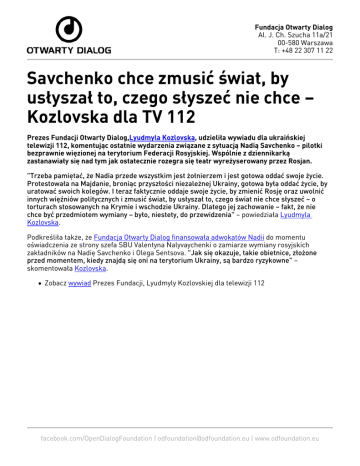Fundacja Otwarty Dialog Al. J. Ch. Szucha 11a/21 00-580 Warszawa T: +48 22 307 11 22 Savchenko chce zmusić świat, by usłyszał to, czego słyszeć nie chce – Kozlovska dla TV 112 Prezes Fundacji Otwarty Dialog,Lyudmyla Kozlovska, udzieliła wywiadu dla ukraińskiej telewizji 112, komentując ostatnie wydarzenia związane z sytuacją Nadią Savchenko – pilotki bezprawnie więzionej na terytorium Federacji Rosyjskiej. Wspólnie z dziennikarką zastanawiały się nad tym jak ostatecznie rozegra się teatr wyreżyserowany przez Rosjan. "Trzeba pamiętać, że Nadia przede wszystkim jest żołnierzem i jest gotowa oddać swoje życie. Protestowała na Majdanie, broniąc przyszłości niezależnej Ukrainy, gotowa była oddać życie, by uratować swoich kolegów. I teraz faktycznie oddaje swoje życie, by zmienić Rosję oraz uwolnić innych więźniów politycznych i zmusić świat, by usłyszał to, czego świat nie chce słyszeć – o torturach stosowanych na Krymie i wschodzie Ukrainy. Dlatego jej zachowanie – fakt, że nie chce być przedmiotem wymiany – było, niestety, do przewidzenia" – powiedziała Lyudmyla Kozlovska. Podkreśliła także, że Fundacja Otwarty Dialog finansowała adwokatów Nadii do momentu oświadczenia ze strony szefa SBU Valentyna Nalyvaychenki o zamiarze wymiany rosyjskich zakładników na Nadię Savchenko i Olega Sentsova. "Jak się okazuje, takie obietnice, złożone przed momentem, kiedy znajdą się oni na terytorium Ukrainy, są bardzo ryzykowne" – skomentowała Kozlovska. Zobacz wywiad Prezes Fundacji, Lyudmyly Kozlovskiej dla telewizji 112 facebook.com/OpenDialogFoundation | [email protected] | www.odfoundation.eu