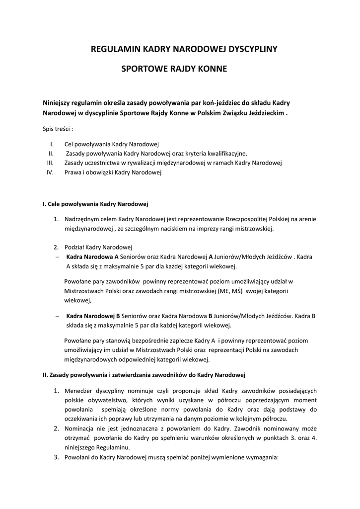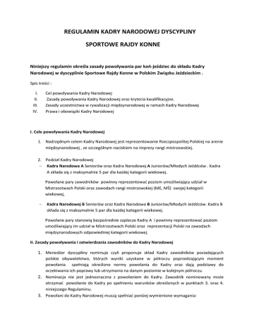 REGULAMIN KADRY NARODOWEJ DYSCYPLINY SPORTOWE RAJDY KONNE Niniejszy regulamin określa zasady powoływania par koń-jeździec do składu Kadry Narodowej w dyscyplinie Sportowe Rajdy Konne w Polskim Związku Jeździeckim . Spis treści : I. II. III. IV. Cel powoływania Kadry Narodowej Zasady powoływania Kadry Narodowej oraz kryteria kwalifikacyjne. Zasady uczestnictwa w rywalizacji międzynarodowej w ramach Kadry Narodowej Prawa i obowiązki Kadry Narodowej I. Cele powoływania Kadry Narodowej 1. Nadrzędnym celem Kadry Narodowej jest reprezentowanie Rzeczpospolitej Polskiej na arenie międzynarodowej , ze szczególnym naciskiem na imprezy rangi mistrzowskiej. 2. Podział Kadry Narodowej Kadra Narodowa A Seniorów oraz Kadra Narodowej A Juniorów/Młodych Jeźdźców . Kadra A składa się z maksymalnie 5 par dla każdej kategorii wiekowej. Powołane pary zawodników powinny reprezentować poziom umożliwiający udział w Mistrzostwach Polski oraz zawodach rangi mistrzowskiej (ME, MŚ) swojej kategorii wiekowej, Kadra Narodowej B Seniorów oraz Kadra Narodowa B Juniorów/Młodych Jeźdźców. Kadra B składa się z maksymalnie 5 par dla każdej kategorii wiekowej. Powołane pary stanowią bezpośrednie zaplecze Kadry A i powinny reprezentować poziom umożliwiający im udział w Mistrzostwach Polski oraz reprezentacji Polski na zawodach międzynarodowych odpowiedniej kategorii wiekowej. II. Zasady powoływania i zatwierdzania zawodników do Kadry Narodowej 1. Menedżer dyscypliny nominuje czyli proponuje skład Kadry zawodników posiadających polskie obywatelstwo, których wyniki uzyskane w półroczu poprzedzającym moment powołania spełniają określone normy powołania do Kadry oraz dają podstawy do oczekiwania ich poprawy lub utrzymania na danym poziomie w kolejnym półroczu. 2. Nominacja nie jest jednoznaczna z powołaniem do Kadry. Zawodnik nominowany może otrzymać powołanie do Kadry po spełnieniu warunków określonych w punktach 3. oraz 4. niniejszego Regulaminu. 3. Powołani do Kadry Narodowej muszą spełniać poniżej wymienione wymagania: 4. 5. powinni uczestniczyć w Mistrzostwach Polski, ewentualne nieuczestniczenie musi być umotywowane pisemnie z podaniem przyczyn posiadać aktualną licencję PZJ udzielić pełnych informacji na temat koni będących w jego dyspozycji oraz na temat swoich planów startowych (wg załącznika nr 1) oraz wyrazić zgodę na przetwarzanie danych osobowych zgodnie z przepisami Ustawy o ochronie danych osobowych z dnia 29.08.1997r. (Dz. U. 1997 nr133, poz. 883) Ostateczna decyzja o zakwalifikowaniu zawodnika do składu Kadry zostaje podjęta po zebraniu informacji o aktualnym stanie jego wyposażenia w konie oraz dyspozycyjności odnośnie reprezentowania Polski we współzawodnictwie międzynarodowym, z zawodami rangi mistrzowskiej włącznie. Zawodnicy zakwalifikowani do Kadry muszą dysponować koniem/końmi, które są przygotowane do startu w Mistrzostwach Polski w danej grupie wiekowej oraz mogą sprostać wymogom sportowego współzawodnictwa międzynarodowego w swojej kategorii. O powołaniu zawodnika do Kadry decyduje jego aktualny poziom wyszkolenia, aktualna forma dosiadanych przez niego koni oraz uzyskane wyniki sportowe w okresie, na podstawie którego jest powoływany bądź korygowany (uaktualniany) skład Kadry. Jednym z kryteriów wyboru pary do Kadry jest powtarzalność wyników i regularność startów. Kryteria sportowe powoływania zawodników do Kadry określone zostały w załączonej tabeli. KRYTERIA SPORTOWE POWOŁYWANIA ZAWODNIKÓW DO KADRY NARODOWEJ PZJ KADRA A KADRA B SENIORZY Ukończyć CEI 4* lub CEI 3* w Ukończyć CEI 3* lub CEI 2* tempie min.14 km/h JUNIORZY/MŁODZI JEŹDŹCY Ukończyć CEIY 2* w tempie min. Ukończyć zawody CEIY2* 14km/h 6. Kadra Narodowa we wszystkich kategoriach wiekowych powoływana jest raz w roku na okres od 1 stycznia do 31 grudnia. Skład Kadry jest uaktualniany (korygowany) co pól roku. 7. Zmiany w składzie Kadry mogą być dokonywane co trzy miesiące na podstawie oceny realizacji planu startów oraz osiągniętych wyników sportowych we współzawodnictwie międzynarodowym i krajowym lub innych zdarzeń, mogących mieć wpływ na dyspozycyjność do startu w zawodach międzynarodowych pary koń/jeździec. 8. Do składu Kadry Narodowej Menedżer może wyjątkowo powołać parę koń/jeździec z pominięciem wyżej wymienionych kryteriów. Decyzja ta musi być pisemnie umotywowana. 9. Kadrę Narodową seniorów, młodych jeźdźców oraz juniorów zatwierdza Zarząd PZJ na wniosek Menedżera dyscypliny uzgodniony z Dyrektorem Sportowym PZJ. III. Zasady uczestnictwa w zawodach międzynarodowych i akcjach szkoleniowych w ramach Kadry Narodowej 1. Składy reprezentacji na zawody międzynarodowe rangi mistrzowskiej zatwierdza Zarząd PZJ po otrzymaniu propozycji od Menedżera dyscypliny. Uzyskanie kwalifikacji do startu w imprezie rangi mistrzowskiej nie jest jednoznaczne z powołaniem do tego startu. Menedżer ma prawo zażądania opinii na temat konia (stan zdrowia, aktualna forma) od lekarza weterynarii prowadzącego parę zawodników. Konsultacja z lekarzem weterynarii jest konieczna do podjęcia ostatecznej decyzji dotyczącej powołania pary. 2. PZJ współfinansuje przygotowania Kadry A do startu w imprezach głównych oraz zawodników Kadry A i B w zawodach kwalifikacyjnych i akcjach szkoleniowych po przedstawieniu preliminarza kosztów. IV. Prawa i obowiązki 1. Do obowiązków Kadry Narodowej należy godne reprezentowanie barw i symboli Rzeczypospolitej Polskiej 2. Zawodnicy Kadry Narodowej są szczególnie zobowiązani do zachowania najwyższych standardów etycznych, kultury osobistej, szacunku do wszystkich osób zaangażowanych w sporty konne, przestrzegania zasad „fair play” oraz kodeksu postępowania zgodnego z dobrem konia. 3. Zawodnicy Kadry Narodowej powinni w sposób aktywny przyczyniać się do popularyzacji i rozwoju dyscypliny Sportowych Rajdów Konn