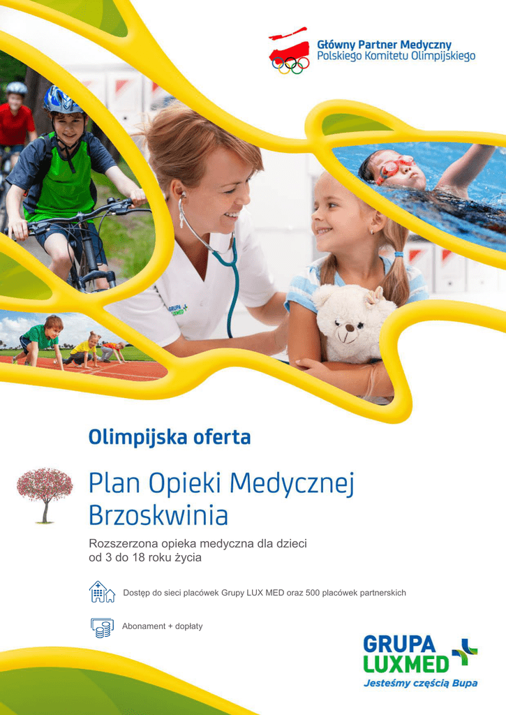 Rozszerzona opieka medyczna dla dzieci od 3 do 18 roku życia Dostęp do sieci placówek Grupy LUX MED oraz 500 placówek partnerskich Abonament + dopłaty Szukasz pakietu medycznego, który zapewni Twojemu dziecku całoroczną rozszerzoną opiekę specjalistyczną połączoną z profilaktyką i diagnostyką? Plan Opieki Medycznej Brzoskwinia, stworzony z myślą o dzieciach między 3 a 18 rokiem życia, spełni Twoje oczekiwania. DLACZEGO WARTO ZDECYDOWAĆ SIĘ NA PLAN OPIEKI MEDYCZNEJ? ________________________ ________________________ _______________________ Wygodne zawarcie umowy Rozbudowana sieć placówek medycznych Dodatkowe rabaty Zapewniamy Ci elektroniczne zawarcie umowy oraz możliwość opłacenia pakietu poprzez system PayU S.A. – dzięki temu oszczędzisz czas i aktywujesz pakiet w wybranym przez siebie dniu roboczym Po wykupieniu abonamentu zyskasz dostęp do największej w Polsce sieci niepublicznych placówek medycznych (LUX MED oraz Medycyna Rodzinna) oraz do ponad 500 placówek, z którymi współpracujemy (lista placówek dostępna na stronie www.luxmed.pl/placówkiwspoprac ujace_wspolplacenie) Po wykupieniu abonamentu otrzymasz 10% rabatu na usługi dostępne w placówkach LUX MED i Medycyna Rodzinna, których nie obejmuje Twój pakiet. Z rabatu możesz także korzystać w Szpitalu LUX MED, Carolina Medical Center oraz placówkach PROFEMED. Rabaty przyznawane są też przez naszych partnerów w ramach programu Zdrowie Piękno Harmonia. INNOWACYJNE ROZWIĄZANIA OBSŁUGOWE ______________________________________ ______________________________________ Portal Pacjenta 24h Telefoniczna Informacja Medyczna Platforma internetowa umożliwia przeglądanie grafiku pracy lekarzy, rezerwację i odwoływanie wizyt. Po podpisaniu regulaminu w placówce LUX MED za pośrednictwem Portalu możesz odbierać wyniki badań laboratoryjnych opatrzone komentarzem lekarskim oraz zadawać lekarzowi uzupełniające pytania do odbytych wizyt. Szczegółowy opis funkcjonalności Portalu Pacjenta znajduje się na stronie www.luxmed.pl. Dzwoniąc z problemem zdrowotnym na infolinię Grupy LUX MED (22 33 22 888), możesz uzyskać pomoc przez całą dobę. Zespół TIM tworzą doświadczeni lekarze, pielęgniarki i ratownicy medyczni, którzy zbierają od dzwoniącego informacje i starają się doradzić, jakie działania należy w danej sytuacji podjąć. Posiadają także informacje o dyżurach aptek i szpitali. ________________________ _________________________ _________________________ Ogólnopolska infolinia SMS-owe przypominanie o terminach wizyt Elektroniczna dokumentacja medyczna Wybór opcji połączenia skraca czas oczekiwania na rozmowę z konsultantem, dzięki czemu możesz szybciej zarezerwować lub odwołać termin wizyty oraz uzyskać potrzebne informacje. Dzień przed zaplanowaną wizytą lub umówionym badaniem otrzymasz SMS z przypomnieniem o godzinie i miejscu, w którym się odbędzie. Odpowiadając na otrzymanego SMS-a, możesz także odwołać wizytę. System informatyczny LUX MED zapewnia naszym lekarzom szybki dostęp do Twojej dokumentacji medycznej – wyników badań, poprzednich zaleceń lekarskich czy przepisanych leków, dzięki czemu proces Twojego leczenia będzie przebiegał sprawniej. OLIMPIJSKA OFERTA Z roku na rok w Polsce obserwuje się coraz większe zainteresowanie sportem. W wielu miastach organizowane są duże maratony i triathlony, na boiskach młodzież naśladuje swoich piłkarskich idoli, a po kolejnych sukcesach naszych sportowców ze sklepów znikają rowery szosowe czy narty biegowe. O wszystkich sportowców – zaczynając od polskich Olimpijczyków i mistrzów sportu, poprzez pasjonatów uczestniczących w lokalnych biegach czy zawodach, po amatorów ćwiczących dla przyjemności i zachowania dobrej kondycji – dba zespół doświadczonych specjalistów medycyny sportowej Grupy LUX MED. Z okazji XXXI Letnich Igrzysk Olimpijskich w Rio de Janeiro do naszych Planów Opieki Medycznej dołączamy specjalną ofertę z zakresu medycyny sportowej, z której może skorzystać także Twoje dziecko! ______________________________________ _____________________________________ Chcesz, aby Twoje dziecko ćwiczyło efektywniej i bezpieczniej? Twoje dziecko uprawia sport i coś mu się stało? Twoje dziecko kocha aktywność fizyczną, np. gimnastykę, bieganie, pływanie czy gry zespołowe? Konsultacje z lekarzami medycyny sportowej wpłyną pozytywnie na jego rozwój – zarówno pod kątem ogólnej sprawności fizycznej, jak i doskonalenia umiejętności sportowych. Nasi specjaliści pomogą dziecku dostosować rodzaj aktywności do predyspozycji jego organizmu. Dzięki indywidualnym zaleceniom Twój młody sportowiec będzie mieć szansę na poprawę wyników i uniknięcie kontuzji, a przede wszystkim – czerpanie większej radości i satysfakcji ze sportu. Twoje dziecko zmaga się z kontuzją? Chcesz, aby szybko powróciło do sprawności po rehabilitacji i uniknęło urazu w przyszłości? Nasi specjaliści medycyny sportowej skierują je na odpowiednie badania oraz do lekarzy, którzy wspomogą młodego sportowca w powrocie do zdrowia i profilaktyce sportowej. Pamiętaj: na satysfakcję z wyników sportowych wpływ mają nie tylko regularne treningi i ciężka praca, ale też indywidualne możliwości organizmu, które możecie poznać podczas specjalistycznych konsultacji i badań. Korzystajcie z kompetencji naszych doświadczonych specjalistów niezależnie od stopnia zaangażowania w sport – dbajcie o zdrowie jak prawdziwi mistrzowie nawet wtedy, gdy czujecie się dobrze! Twoje dziecko może skorzystać m.in. z badań i konsultacji w ramach orzecznictwa sportowego - sprawdź szczegółowy zakres na stronach 9-11. Dodatkowy opis usług znajdziesz w załączniku. ZAKRES PLANU OPIEKI MEDYCZNEJ BRZOSKWINIA szczegółowo określony jest w części „Szczegółowe definicje usług” Zakres Opieki Medycznej* Konsultacje lekarzy podstawowej opieki medycz