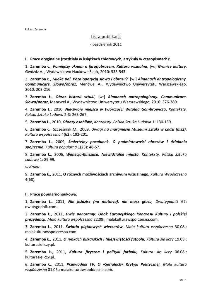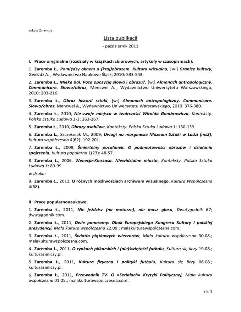 Łukasz Zaremba Lista publikacji - październik 2011 I. Prace oryginalne (rozdziały w książkach zbiorowych, artykuły w czasopismach): 1. Zaremba Ł., Pomiędzy oknem a (kraj)obrazem. Kultura wizualna, [w:] Granice kultury, Gwóźdź A. , Wydawnictwo Naukowe Śląsk, 2010: 533-543. 2. Zaremba Ł., Mieke Bal. Poza opozycją słowa i obrazu?, [w:] Almanach antropologiczny. Communicare. Słowo/obraz, Mencwel A. , Wydawnictwo Uniwersytetu Warszawskiego, 2010: 203-216. 3. Zaremba Ł., Obraz historii sztuki, [w:] Almanach antropologiczny. Communicare. Słowo/obraz, Mencwel A., Wydawnictwo Uniwersytetu Warszawskiego, 2010: 376-380. 4. Zaremba Ł., 2010, Nie-swoje miejsca w twórczości Witolda Gombrowicza, Konteksty. Polska Sztuka Ludowa 2-3: 263-267. 5. Zaremba Ł., 2010, Obrazy osobliwe, Konteksty. Polska Sztuka Ludowa 1: 130-139. 6. Zaremba Ł., Szcześniak M., 2009, Uwagi na marginesie Muzeum Sztuki w Łodzi (ms2), Kultura współczesna 4(62): 192-201. 7. Zaremba Ł., 2009, Śmiertelny pocałunek. O podmiotowości obrazów i działaniu spojrzenia, Kultura popularna 1(23): 48-57. 8. Zaremba Ł., 2006, Wenecja-Kinszasa. Niewidzialne miasta, Konteksty. Polska Sztuka Ludowa 1: 89-99. w druku: 9. Zaremba Ł., 2011, O różnych możliwościach archiwum wizualnego, Kultura Współczesna 4(68). II. Prace popularnonaukowe: 1. Zaremba Ł., 2011, Nie jeździsz (na motorze), nie masz głosu, Dwutygodnik 67; dwutygodnik.com. 2. Zaremba Ł., 2011, Dwie panoramy: Obok Europejskiego Kongresu Kultury i polskiej prezydencji, Mała kultura współczesna 22.09.; malakulturawspolczesna.com. 3. Zaremba Ł., 2011, Światła piątkowych wieczorów, Mała kultura współczesna 30.08.; malakulturawspolczesna.com. 4. Zaremba Ł., 2011, O rynkach piłkarskich i (nie)świętości futbolu, Kultura się liczy 19.08.; kulturasieliczy.pl. 5. Zaremba Ł., 2011, Kultura fizyczna i polityki futbolu, Kultura się liczy 06.08.; kulturasieliczy.pl. 6. Zaremba Ł., 2011, Przewodnik TV. O »Serialach« Krytyki Politycznej, Mała kultura współczesna 01.05.; malakulturawspolczesna.com. str. 1 7. Zaremba Ł., 2011, Krzyż: malakulturawspolczesna.com. intro, Mała kultura współczesna 23.01.; 8. Zaremba Ł., 2011, War on error: W.J.T. Mitchell o wojnie z terroryzmem, Mała kultura współczesna 10.01.; malakulturawspolczesna.com. 9. Zaremba Ł., 2010, Zombie: ikonologia kryzysu, Mała kultura współczesna 11.12.; malakulturawspolczesna.com. 10. Zaremba Ł., 2010, malakulturawspolczesna.com. Skanery, Mała kultura współczesna 14.11.; str. 2