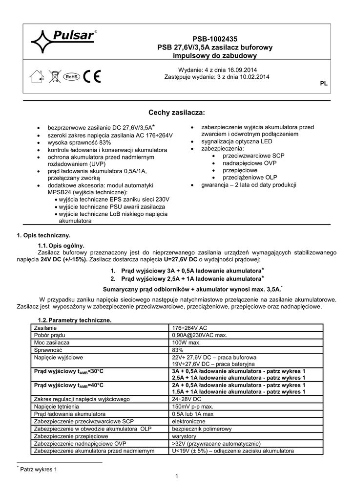 PSB-1002435 PSB 27,6V/3,5A zasilacz buforowy impulsowy do zabudowy Wydanie: 4 z dnia 16.09.2014 Zastępuje wydanie: 3 z dnia 10.02.2014 PL PL Cechy zasilacza: bezprzerwowe zasilanie DC 27,6V/3,5A* szeroki zakres napięcia zasilania AC 176÷264V wysoka sprawność 83% kontrola ładowania i konserwacji akumulatora ochrona akumulatora przed nadmiernym rozładowaniem (UVP) prąd ładowania akumulatora 0,5A/1A, przełączany zworką dodatkowe akcesoria: moduł automatyki MPSB24 (wyjścia techniczne): wyjścia techniczne EPS zaniku sieci 230V wyjście techniczne PSU awarii zasilacza wyjście techniczne LoB niskiego napięcia akumulatora zabezpieczenie wyjścia akumulatora przed zwarciem i odwrotnym podłączeniem sygnalizacja optyczna LED zabezpieczenia: przeciwzwarciowe SCP nadnapięciowe OVP przepięciowe przeciążeniowe OLP gwarancja – 2 lata od daty produkcji 1. Opis techniczny. 1.1. Opis ogólny. Zasilacz buforowy przeznaczony jest do nieprzerwanego zasilania urządzeń wymagających stabilizowanego napięcia 24V DC (+/-15%). Zasilacz dostarcza napięcia U=27,6V DC o wydajności prądowej: 1. Prąd wyjściowy 3A + 0,5A ładowanie akumulatora* 2. Prąd wyjściowy 2,5A + 1A ładowanie akumulatora* * Sumaryczny prąd odbiorników + akumulator wynosi max. 3,5A. W przypadku zaniku napięcia sieciowego następuje natychmiastowe przełączenie na zasilanie akumulatorowe. Zasilacz jest wyposażony w zabezpieczenie przeciwzwarciowe, przeciążeniowe, przepięciowe oraz nadnapięciowe. 1.2. Parametry techniczne. Zasilanie Pobór prądu Moc zasilacza Sprawność Napięcie wyjściowe Prąd wyjściowy tAMB<30°C Prąd wyjściowy tAMB=40°C Zakres regulacji napięcia wyjściowego Napięcie tętnienia Prąd ładowania akumulatora Zabezpieczenie przeciwzwarciowe SCP Zabezpieczenie w obwodzie akumulatora OLP Zabezpieczenie przepięciowe Zabezpieczenie nadnapięciowe OVP Zabezpieczenie akumulatora przed nadmiernym * 176÷264V AC 0,90A@230VAC max. 100W max. 83% 22V÷ 27,6V DC – praca buforowa 19V÷27,6V DC – praca bateryjna 3A + 0,5A ładowanie akumulatora - patrz wykres 1 2,5A + 1A ładowanie akumulatora - patrz wykres 1 2A + 0,5A ładowanie akumulatora - patrz wykres 1 1,5A + 1A ładowanie akumulatora - patrz wykres 1 24÷28V DC 150mV p-p max. 0,5A lub 1A max elektroniczne bezpiecznik polimerowy warystory >32V (przywracane automatycznie) U<19V (± 5%) – odłączenie zacisku akumulatora Patrz wykres 1 1 rozładowaniem UVP Optyczna sygnalizacja pracy Wyjście sygnalizacji optycznej LED Dodatkowe akcesoria Warunki pracy Wymiary (LxWxH) Waga netto/brutto Klasa ochronności PN-EN 60950-1:2007 Złącza Wytrzymałość elektryczna izolacji: - pomiędzy obwodem wejściowym (sieciowym) a obwodami wyjściowymi zasilacza (I/P-O/P) - pomiędzy obwodem wejściowym a obwodem ochronnym PE (I/P-FG) - pomiędzy obwodem wyjściowym a obwodem ochronnym PE (O/P-FG) Rezystancja izolacji: - pomiędzy obwodem wejściowym a wyjściowym lub ochronnym Temperatura składowania Wibracje i udary w czasie transportu LED zielona – obecność napięcia AC LED AC- obecność napięcia AC LED DC- obecność napięcia na wyjściu zasilacza Moduł MPSB24 (wyjścia techniczne) II klasa środowiskowa, temperatura: -10 oC÷40 oC wilgotność względna 20%...90%, bez kondensacji 199 x 97 x 42 [mm] 0,63kg / 0,68kg I (pierwsza) - wymaga przewodu ochronnego zasilanie: Φ0,63÷2,5 I/O PCB : Φ0,41÷1,63 wyjścia akumulatora BAT: 6,3F-2,5/40cm, wyjście sygnalizacji optycznej: wtyk 3-pin 5 mm 3000 V/AC min. 1500 V/AC min. 500 V/AC min. 100 MΩ, 500V/DC -20ºC...+60ºC Wg PN-83/T-42106 1.3. Charakterystyka temperaturowa. Wykres 1. Dopuszczalny prąd wyjściowy zasilacza w zależności od temperatury otoczenia. 2. Instalacja. 2.1. Wymagania. Zasilacz buforowy przeznaczony jest do montażu przez wykwalifikowanego instalatora, posiadającego odpowiednie (wymagane i konieczne dla danego kraju) zezwolenia i uprawnienia do przyłączania (ingerencji) w instalacje 230V/AC oraz instalacje niskonapięciowe. Urządzenie powinno być zamontowane w pomieszczeniach zamkniętych zgodnie z II klasą środowiskową, o normalnej wilgotności powietrza (RH=90% maks. bez kondensacji) i temperaturze z zakresu -10°C do +40°C. Urządzenie należy montować w metalowej obudowie (szafie, urządzeniu końcowym) oraz w celu spełnienia wymagań LVD i EMC należy przestrzegać zasad: zasilania, zabudowy, ekranowania - odpowiednio do zastosowania. W szczególności należy bezwzględnie podłączyć przewód PE do odpowiedniego zacisku zasilacza. Przed przystąpieniem do instalacji, należy sporządzić bilans obciążenia zasilacza: 1. Prąd wyjściowy 3A + 0,5A ładowanie akumulatora* 2. Prąd wyjściowy 2,5A + 1A ładowanie akumulatora* * Sumaryczny prąd odbiorników + akumulator wynosi max. 3,5A. 2.2 . Procedura instalacji. 1. Przed rozpoczęciem instalacji zasilacza należy upewnić się że przewody zasilające są odłączone od sieci 230V AC. 2. Zainstalować zasilacz w wybranym miejscu. 3. Podłączyć przewody zasilające 230V AC. Podłączyć przewód PE (żółto-zielony) do odpowiedniego zacisku zasilacza (oznaczonego symbolem ). * Patrz wykres 1 2 Szczególnie starannie należy wykonać obwód ochrony przeciwporażeniowej: żółto-zielony przewód ochronny kabla zasilającego musi być dołączony z jednej strony do odpowiedniego zacisku zasilacza. Praca zasilacza bez poprawnie wykonanego i sprawnego technicznie obwodu ochrony przeciwporażeniowej jest NIEDOPUSZCZALNA! Grozi uszkodzeniem urządzeń, porażeniem prądem elektrycznym. 4. Podłączyć obciążenie / obciążenia do odpowiednich zacisków wyjściowych zasilacza (biegun dodatni oznaczony +V, biegun ujemny -V) 5. Podłączyć akumulator zgodnie z oznaczeniami (kolorami). 6. Po wykonaniu testów i kontroli działania zamknąć obudowę, szafę itp. 2.3. Opis złącz zasilacza. Elementy/złącza [Rys.1] Opis L-N złącze zasilania 230 V AC, – złącze do podłączenia przewodu ochronnego 