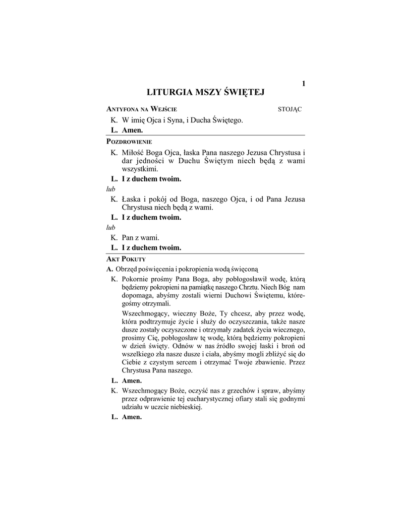 LITURGIA MSZY ŚWIĘTEJ 1 ANTYFONA NA WEJŚCIE STOJĄC K. W imię Ojca i Syna, i Ducha Świętego. L. Amen. POZDROWIENIE K. Miłość Boga Ojca, łaska Pana naszego Jezusa Chrystusa i dar jedności w Duchu Świętym niech będą z wami wszystkimi. L. I z duchem twoim. lub K. Łaska i pokój od Boga, naszego Ojca, i od Pana Jezusa Chrystusa niech będą z wami. L. I z duchem twoim. lub K. Pan z wami. L. I z duchem twoim. AKT POKUTY A. Obrzęd poświęcenia i pokropienia wodą święconą K. Pokornie prośmy Pana Boga, aby pobłogosławił wodę, którą będziemy pokropieni na pamiątkę naszego Chrztu. Niech Bóg nam dopomaga, abyśmy zostali wierni Duchowi Świętemu, któregośmy otrzymali. Wszechmogący, wieczny Boże, Ty chcesz, aby przez wodę, która podtrzymuje życie i służy do oczyszczania, także nasze dusze zostały oczyszczone i otrzymały zadatek życia wiecznego, prosimy Cię, pobłogosław tę wodę, którą będziemy pokropieni w dzień święty. Odnów w nas źródło swojej łaski i broń od wszelkiego zła nasze dusze i ciała, abyśmy mogli zbliżyć się do Ciebie z czystym sercem i otrzymać Twoje zbawienie. Przez Chrystusa Pana naszego. L. Amen. K. Wszechmogący Boże, oczyść nas z grzechów i spraw, abyśmy przez odprawienie tej eucharystycznej ofiary stali się godnymi udziału w uczcie niebieskiej. L. Amen. 2 B. K. Uznajmy przed Bogiem, że jesteśmy grzeszni, abyśmy mogli z czystym sercem złożyć Najświętszą Ofiarę. L. Spowiadam się Bogu wszechmogącemu * i wam, bracia i siostry, * że bardzo zgrzeszyłem * myślą, mową, uczynkiem i zaniedbaniem: Bijąc się w piersi mówią dalej: moja wina, moja wina, moja bardzo wielka wina. Przeto błagam Najświętszą Maryję, zawsze Dziewicę, * wszystkich Aniołów i Świętych * i was, bracia i siostry, * o modlitwę za mnie * do Pana Boga naszego. K. Niech się zmiłuje nad nami Bóg wszechmogący * i odpuściwszy nam grzechy * doprowadzi nas do życia wiecznego. L. Amen. lub: K. L. K. L. K. Zmiłuj się nad nami, Panie. Bo zgrzeszyliśmy przeciw Tobie. Okaż nam, Panie, miłosierdzie swoje. I daj nam swoje zbawienie. Niech się zmiłuje nad nami Bóg wszechmogący * i odpuściwszy nam grzechy * doprowadzi nas do życia wiecznego. L. Amen. lub: K. Panie, który zostałeś posłany, aby uzdrowić skruszonych w sercu, zmiłuj się nad nami. L. Zmiłuj się nad nami. K. Chryste, który przyszedłeś wzywać grzeszników, zmiłuj się nad nami. L. Zmiłuj się nad nami. K. Panie, który siedzisz po prawicy Ojca, zmiłuj się nad nami. L. Zmiłuj się nad nami. K. Niech się zmiłuje nad nami Bóg wszechmogący * i odpuściwszy nam grzechy * doprowadzi nas do życia wiecznego. L. Amen. 3 K. Panie, zmiłuj się nad nami. L. Panie, zmiłuj się nad nami. K. Chryste, zmiłuj się nad nami. L. Chryste, zmiłuj się nad nami. K. Panie, zmiłuj się nad nami. L. Panie, zmiłuj się nad nami. Chwała na wysokości Bogu, * a na ziemi pokój ludziom dobrej woli. * Chwalimy Cię. * Błogosławimy Cię. * Wielbimy Cię. * Wysławiamy Cię. * Dzięki Ci składamy, * bo wielka jest chwała Twoja. * Panie Boże, Królu nieba, * Boże Ojcze wszechmogący. * Panie, Synu Jednorodzony, * Jezu Chryste. * Panie Boże, Baranku Boży, Synu Ojca. * Który gładzisz grzechy świata, * zmiłuj się nad nami. * Który gładzisz grzechy świata, * przyjm błaganie nasze. * Który siedzisz po prawicy Ojca, * zmiłuj się nad nami. * Albowiem tylko Tyś jest święty. * Tylko Tyś jest Panem. * Tylko Tyś Najwyższy, Jezu Chryste, * z Duchem Świętym w chwale Boga Ojca. * Amen. Wierzę w jednego Boga, * Ojca wszechmogącego, * Stworzyciela nieba i ziemi, * wszystkich rzeczy widzialnych i niewidzialnych. * I w jednego Pana Jezusa Chrystusa, * Syna Bożego Jednorodzonego, * który z Ojca jest zrodzony * przed wszystkimi wiekami. * Bóg z Boga, Światłość ze Światłości, * Bóg prawdziwy z Boga prawdziwego. * Zrodzony a nie stworzony, * współistotny Ojcu, * a przez Niego wszystko się stało. * On to dla nas ludzi i dla naszego zbawienia zstąpił z nieba. Tutaj wszyscy pochylają się I za sprawą Ducha Świętego * przyjął ciało z Maryi Dziewicy i stał się człowiekiem. * Ukrzyżowany również za nas, * pod Poncjuszem Piłatem został umęczony i pogrzebany. * I zmartwychwstał dnia trzeciego, * jak oznajmia Pismo. * I wstąpił do nieba; siedzi po prawicy Ojca. * I powtórnie przyjdzie w chwale * sądzić żywych i umarłych, * a Królestwu Jego nie będzie końca. * Wierzę w Ducha Świętego, Pana i Ożywiciela, * który od Ojca i Syna pochodzi. * Który z Ojcem i Synem wspólnie odbiera uwielbienie i chwałę; * który mówił przez Proroków. * Wierzę w jeden, święty, powszechny i apostolski Kościół. * Wyznaję jeden chrzest na odpuszczenie grzechów. * I oczekuję wskrzeszenia umarłych. * I życia wiecznego w przyszłym świecie. Amen. 4 III. Liturgia Eucharystii PRZYGOTOWANIE DARÓW SIEDZĄC K. Błogosławiony jesteś, Panie, Boże wszechświata, * bo dzięki Twojej hojności otrzymaliśmy chleb, * który jest owocem ziemi i pracy rąk ludzkich; * Tobie go przynosimy, * aby stał się dla nas chlebem życia. L. Błogosławiony jesteś, Boże, teraz i na wieki. K. Przez to misterium wody i wina * daj nam, Boże, udział w bóstwie Chrystusa, * który przyjął nasze człowieczeństwo. K. Błogosławiony jesteś, Panie, Boże wszechświata, * bo dzięki Twojej hojności otrzymaliśmy wino, * które jest owocem winnego krzewu i pracy rąk ludzkich; * Tobie je przynosimy, * aby stało się dla nas napojem duchowym. L. Błogosławiony jesteś, Boże, teraz i na wieki. K. Przyjmij nas, Panie, stojących przed Tobą * w duchu pokory i z sercem skruszonym; * niech nasza ofiara tak się dzisiaj dokona * przed Tobą, Panie Boże, * aby się Tobie podobała. Obmyj mnie, Panie, z mojej winy * i oczyść mnie z grzechu mojego. WEZWANIE DO MODLITWY STOJĄC K. Módlcie się, * aby moją i waszą ofiarę * przyjął Bóg, Ojci
