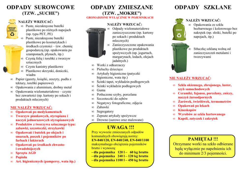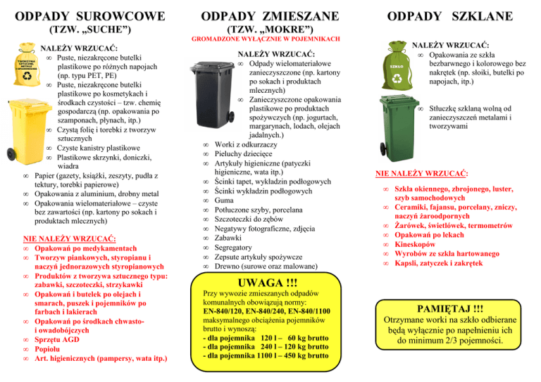 ODPADY SUROWCOWE ODPADY ZMIESZANE (TZW. „SUCHE”) ODPADY SZKLANE (TZW. „MOKRE”) GROMADZONE WYŁĄCZNIE W POJEMNIKACH • • • NALEŻY WRZUCAĆ: • Puste, niezakręcone butelki plastikowe po różnych napojach (np. typu PET, PE) • Puste, niezakręcone butelki plastikowe po kosmetykach i środkach czystości – tzw. chemię gospodarczą (np. opakowania po szamponach, płynach, itp.) • Czystą folię i torebki z tworzyw sztucznych • Czyste kanistry plastikowe • Plastikowe skrzynki, doniczki, wiadra Papier (gazety, książki, zeszyty, pudła z tektury, torebki papierowe) Opakowania z aluminium, drobny metal Opakowania wielomateriałowe – czyste bez zawartości (np. kartony po sokach i produktach mlecznych) NIE NALEŻY WRZUCAĆ: • Opakowań po medykamentach • Tworzyw piankowych, styropianu i naczyń jednorazowych styropianowych • Produktów z tworzywa sztucznego typu: zabawki, szczoteczki, strzykawki • Opakowań i butelek po olejach i smarach, puszek i pojemników po farbach i lakierach • Opakowań po środkach chwastoi owadobójczych • Sprzętu AGD • Popiołu • Art. higienicznych (pampersy, wata itp.) • • • • • • • • • • • • • NALEŻY WRZUCAĆ: • Odpady wielomateriałowe zanieczyszczone (np. kartony po sokach i produktach mlecznych) • Zanieczyszczone opakowania plastikowe po produktach spożywczych (np. jogurtach, margarynach, lodach, olejach jadalnych.) Worki z odkurzaczy Pieluchy dziecięce Artykuły higieniczne (patyczki higieniczne, wata itp.) Ścinki tapet, wykładzin podłogowych Ścinki wykładzin podłogowych Guma Potłuczone szyby, porcelana Szczoteczki do zębów Negatywy fotograficzne, zdjęcia Zabawki Segregatory Zepsute artykuły spożywcze Drewno (surowe oraz malowane) NALEŻY WRZUCAĆ: • Opakowania ze szkła bezbarwnego i kolorowego bez nakrętek (np. słoiki, butelki po napojach, itp.) • Stłuczkę szklaną wolną od zanieczyszczeń metalami i tworzywami NIE NALEŻY WRZUCAĆ: • • • • • • • Szkła okiennego, zbrojonego, luster, szyb samochodowych Ceramiki, fajansu, porcelany, zniczy, naczyń żaroodpornych Żarówek, świetlówek, termometrów Opakowań po lekach Kineskopów Wyrobów ze szkła hartowanego Kapsli, zatyczek i zakrętek UWAGA !!! Przy wywozie zmieszanych odpadów komunalnych obowiązują normy: EN-840/120, EN-840/240, EN-840/1100 maksymalnego obciążenia pojemników brutto i wynoszą: - dla pojemnika 120 l – 60 kg brutto - dla pojemnika 240 l – 120 kg brutto - dla pojemnika 1100 l – 450 kg brutto PAMIĘTAJ !!! Otrzymane worki na szkło odbierane będą wyłącznie po napełnieniu ich do minimum 2/3 pojemności. „PSZOK” PRZESTRZEGAJ ZASAD GOSPODAROWANIA ODPADAMI w Gminie Grodków Ul. Elsnera 12 w Grodkowie Tel. (77) 415 57 80 UWAGA !!! POSEGREGOWANE ODPADY MOŻNA DOSTARCZYĆ NIEODPŁATNIE NA „PSZOK” w dniach: wtorek – środa – piątek w godz. 700 - 1500 poniedziałek – czwartek w godz. 900 - 1700 NIE CHCESZ PŁACIĆ WIĘCEJ SEGREGUJ !!! ODPADY Umieszczenie powyższego znaku na twoim pojemniku oznacza GRODKÓW OSTRZEŻENIE Na „PSZOK” możesz dostarczyć również odpady gabarytowe które nie należy składować w masie odpadów zmieszanych. PAMIĘTAJ ! Odpady biodegradowalne możesz zagospodarować samodzielnie urządzając kompostownik ! że niewłaściwie segregujesz odpady i możesz być skontrolowany i ukarany przez Straż Miejską REGULAMINY NA STRONACH • • WWW.GRODKOW.PL WWW.KOMUNALNIK.EU IFORMACJA TELEFONICZNA - Urząd Miejski – (77) 404 03 15 - Komunalnik Sp. z o.o. – (77) 415 54 35 NIEZBĘDNA WIEDZA NA TEMAT GOSPODARKI ODPADAMI W GMINIE GRODKÓW Jak segregować Gdzie znaleźć harmonogramy wywozu nieczystości Adresy, telefony
