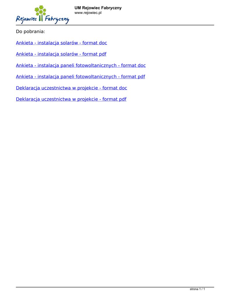 UM Rejowiec Fabryczny www.rejowiec.pl Do pobrania: Ankieta - instalacja solarów - format doc Ankieta - instalacja solarów - format pdf Ankieta - instalacja paneli fotowoltanicznych - format doc Ankieta - instalacja paneli fotowoltanicznych - format pdf Deklaracja uczestnictwa w projekcie - format doc Deklaracja uczestnictwa w projekcie - format pdf strona 1 / 1 Powered by TCPDF (www.tcpdf.org)