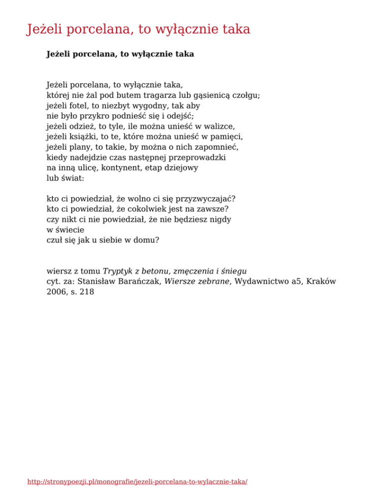 Jeżeli porcelana, to wyłącznie taka Jeżeli porcelana, to wyłącznie taka Jeżeli porcelana, to wyłącznie taka, której nie żal pod butem tragarza lub gąsienicą czołgu; jeżeli fotel, to niezbyt wygodny, tak aby nie było przykro podnieść się i odejść; jeżeli odzież, to tyle, ile można unieść w walizce, jeżeli książki, to te, które można unieść w pamięci, jeżeli plany, to takie, by można o nich zapomnieć, kiedy nadejdzie czas następnej przeprowadzki na inną ulicę, kontynent, etap dziejowy lub świat: kto ci powiedział, że wolno ci się przyzwyczajać? kto ci powiedział, że cokolwiek jest na zawsze? czy nikt ci nie powiedział, że nie będziesz nigdy w świecie czuł się jak u siebie w domu? wiersz z tomu Tryptyk z betonu, zmęczenia i śniegu cyt. za: Stanisław Barańczak, Wiersze zebrane, Wydawnictwo a5, Kraków 2006, s. 218 http://stronypoezji.pl/monografie/jezeli-porcelana-to-wylacznie-taka/