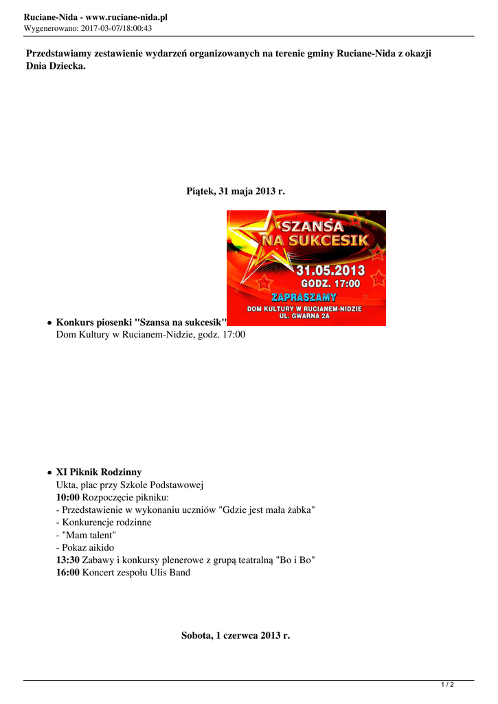 Ruciane-Nida - www.ruciane-nida.pl Wygenerowano: 2017-03-07/18:00:43 Przedstawiamy zestawienie wydarzeń organizowanych na terenie gminy Ruciane-Nida z okazji Dnia Dziecka. Piątek, 31 maja 2013 r. Konkurs piosenki "Szansa na sukcesik" Dom Kultury w Rucianem-Nidzie, godz. 17:00 XI Piknik Rodzinny Ukta, plac przy Szkole Podstawowej 10:00 Rozpoczęcie pikniku: - Przedstawienie w wykonaniu uczniów "Gdzie jest mała żabka" - Konkurencje rodzinne - "Mam talent" - Pokaz aikido 13:30 Zabawy i konkursy plenerowe z grupą teatralną "Bo i Bo" 16:00 Koncert zespołu Ulis Band Sobota, 1 czerwca 2013 r. 1/2 Ruciane-Nida - www.ruciane-nida.pl Wygenerowano: 2017-03-07/18:00:43 Powiedz ekologii tak Piknik w ramach projektu dofinansowanego przez Mazurskiego Centrum Edukacji Ekologicznej. W programie m.in. tworzenie miniogrodu, konkurs plastyczny, gry i zabawy dla dzieci, grill i ognisko. Impreza odbędzie się w pięciu miejscowościach: Karwicy (10:00), Wygrynach (10:00), Ładnym Polu (11:00), Wólce (12:00), Osiniaku-Piotrowie (godz. 13:00). Zawody sportowe Turniej piłki nożnej drużyn "podwórkowych" i turniej trójek siatkarskich na boisku "Orlik" w Rucianem-Nidzie. Zapisy do 31 maja w godzinach 15:00 - 21:00 na "Orliku". Festyn dla dzieci organizowany przez Stowarzyszenie Pomocy Dzieciom i Młodzieży. W programie niespodzianki, zabawy i atrakcje dla najmłodszych. Początek: godz. 11:00. Miejsce: plac przy świetlicy środowiskowej (Ruciane-Nida, ul. Polna 1 - przy budynku ośrodka zdrowia). Zawody wędkarskie na Jeziorze Nidzkim w miejscowości Krzyże. Wyjazd o godz. 7:00 spod świetlicy środowiskowej (Ruciane-Nida, ul. Polna 1). 2/2 Powered by TCPDF (www.tcpdf.org)