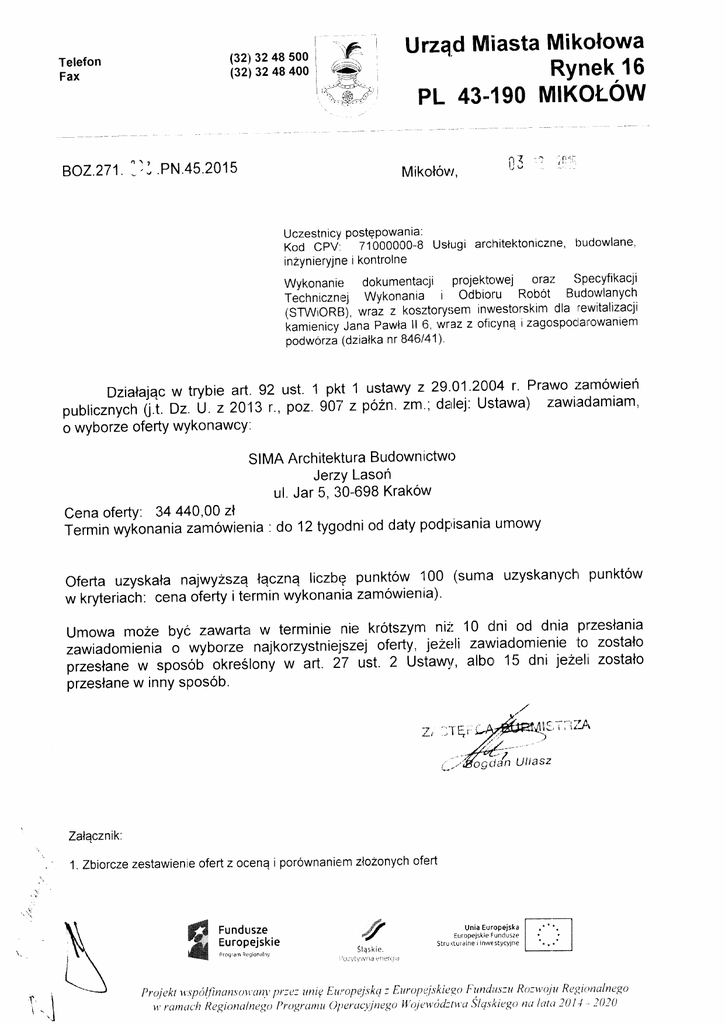 'rg. Telefon Fax (32)32 48 500 (32132 48 400 Mikotowa UrzqdNniasta I ,26$ Rynek,16 'tr,. [email protected]'u' PL 43-.190MIKOLOW ilE'.-{, , .,_._r(:=ai.-. . , 8 0 2 . 2 7 1l.: : P N4 5 2 0 1 5 Mikolovr, il3 'l ril'.: la: Uczestnicy PostqPowan budowlane, Uslugi arr:hitefitoniczne, Kod CPV Zt'OOOO00-8 i kontrolne inzynieryjne Wykonaniel dokumentar:ji projektowej oraT- {}ptlcyfikacji ej Wykonania i Odbioru Robot Budowlanych Techniczn wraz z kos;ltoryt;eminwestorskimdla rewitalizacji (STW1ORElj, Pawlall (3,wraz z oficynqr zagospoclar'cwaniem Jana kamienicy podworza(dziatkanr 846141). :uarnowien Dzialaiqcw trybie art' 92 ust. 1 pkt 1 ustawy z 29.01.20t04r. Prarruo z:awladamiam, UStavrra) (1.1. Dz. U. z 20'13r-, poz. 901'z pozn. zm.; darlej: publicznych o wyborzeofertYwYkonawcy: SlMA ArchrtekturaBudownitctwo JerzyLason u l .Jar 5, 30-698Krakow CenaofertY. 34 440,00zl umowy : do 12 tygodniod datypodp'issnia zamowienia Terminwykonania punktow Oferta uzyskata najwyzszq lqcznq liczbri punktow 100 (sum,a u;lyskanycl"r w kryteriach:cena ofertyi terrminwykonaniazamowienia). pr,zeslania Umowa moze byc zawartarw terminie nie krotszynrnii: 10 dni od drria to zostalo oferty, jezetliza'wiadomienie zawiadomienia wyborze najkorzystniejszej " okreslonyw art. 27 ust. 2 Ustawy, albo' 1{i dni jezr:li zostalo przeslanew sposob w innYsposob. przestane .,'L, rii?t l:il,lS.,-i-l Zalqcznik'. 1. Zbiorczezestawienieofert z ocenEi porownaniemzlo|onychofert Fundusze Europejskie P r o q i a r nR e q i o n a l n l r s 5ra5Kre. )r-;!vl_vwr rcteneril la UniaErlropejska Fundus2e Europejskie i Inw€stycyjne Stru<turaine Rrtzv'tlttR'e5lionalnego Fun,:livszu prc;.jekt z Europe.iskiegrt pr:e: unigE'u;opejskq v,spril/inansotr.stty na lota 2011 )02(t Slqs,kiego lfole'w'6dztx'u v, rctmuchRegi6lulrtegt.t['rogrunu Operctcy.jnego '---'----'---1 '..: il3 ri , ru: l',: lVf I lU iS "1.'r,[ i . " .: f_. ,*r W pultlrt:,.,nyclt tltuto Zanttiwted i e9g9- - --- -l ama'w!-alE _-- f_fgg4qqr: Of:ERT ZBIORCZEZESTAWIENIE oFERT zt-oZotrtYctt z oceuer'poi6wr'rlurru - PostqPowaniePN 45120'15 specyfikacjillechnicznejwykonaniai odbioru wvkonaniedokumentacjiprq"[i.-G.raz inwestorskimdla rewitalizacji Rob6tBudowlanychtsiwiongl, wrazz_tbsztorvsem i iagospodarowaniempodw6rza kamienicy.r"n. p"n*"I';;;;t;"fi"ynq (dzialkanr 846/41) Cerna izl Nr oferty Nazwa(firma)albo imiq i nazwiskowykonawcy adres siedziby lub rniejscazamies;zkania wykonawcy LAB Designand ResearchGroupSp' z o'o' czna 16h, 53-609Wroclaw ul Fa-brY Ternrin 'wykonaniil z:amo\lienia Liczba Pkt LiczllaPkt w kryterium termin w kryteriunr wykonania G()na zamowienia RNIEM liczbapkt pkt 6 1 5 , 0 0 , 0 0 _doI ?_!yg9_cb! 58,210 5 pkt 53,120 Pkt 5 7 t | 1 0 , 0 0 _ ,Jol?_lW.q!l]]L 61,60pkt 5 pkt pkt 56,r30 E M c l E p r o l eSk P t z o'o' Kielce 20,25-415 ul.Gorna An ArchrGrouPs.c. A' KacProwic;Z, T. KacProwicz:., R. ZadorohnY , K. Odziomek ul. Chorzowska64, 44-100Glivuice Budownict\Mo SIMAArchitektura JerzyLason Jar 5, 3i0-698Krakow 1 0 90 0 0 , 0 1 1 d o 1 4 t y g o d n i 0 pkt 30,02Pkt- do 12tygodnri 34 440,00 5 pkt =5 pkt 3 8 13 0 , 0 0 d o 1 2 t y g o d n i - Uslugorve,,MlDEX" Projel<towo Przedsigbiorstwo 5 pkt 85.81pka ErykDyla,MariaDYla 264 Ruda-Slqska,ul SzybWah:nty 41-7Og POLPRII''ICESp.zoo Katowicka17, 41-400MYslc'wice s'c' Architel<toniczna,,CAMPO" Pracownia Tokarz,MarianWitkowski Krystyna 40-771Katowice ul.Gromadzka1309, 3 65 3 1 , 0 0 t]9,56 do-l4lvse-Qt] 30,1)2pkt 1CtOpkt 90,8,1pkt 89,56pkt 0 pkt 55 350,OCt d o 1 2 t Y g o d n i 5 pkt 1 pklt 5€r,1 64,11pt<t TFI;N Fundusze Europejskie P r o g ( a r nR e q i o n a l l l v Unia liuroPejska E u r o P e j s k i eF u n d u s , z e S t r r r k t u r a [ n ei l n w e s t y c y j n e 5 l ask i e . 2!')lv' !'?lrlal el ieriii,,l w'rcmach Regbnalnegtt przez trnig Europejskq: EttopefikieSo FunduszuRozwoju Regionulnego Projekt tusp6lfinansott'ar4' 2020 201J lttta na Pro1r'itmlt Operaq'f ieg" Wojctt\Anra SlqskieSo