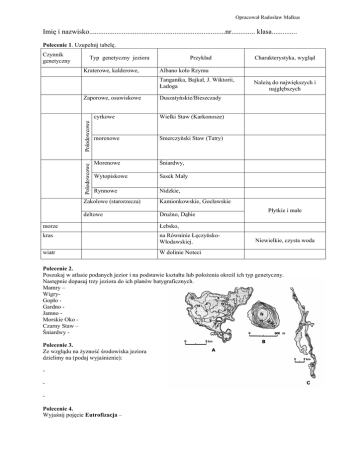 Opracował Radosław Małkus Imię i nazwisko...........................................................................nr............. klasa.............. Polecenie 1. Uzupełnij tabelę. Czynnik genetyczny Typ genetyczny jeziora Kraterowe, kalderowe, Przykład Albano koło Rzymu Tanganika, Bajkał, J. Wiktorii, Ładoga Polodowcowe Polodowcowe Zaporowe, osuwiskowe Charakterystyka, wygląd Należą do największych i najgłębszych Duszatyńskie/Bieszczady cyrkowe Wielki Staw (Karkonosze) morenowe Smerczyński Staw (Tatry) Morenowe Śniardwy, Wytopiskowe Sasek Mały Rynnowe Nidzkie, Zakolowe (starorzecza) Kamionkowskie, Gocławskie deltowe Druźno, Dąbie morze Łebsko, kras na Równinie ŁęczyńskoWłodawskiej. wiatr W dolinie Noteci Płytkie i małe Niewielkie, czysta woda Polecenie 2. Poszukaj w atlasie podanych jezior i na podstawie kształtu lub położenia określ ich typ genetyczny. Następnie dopasuj trzy jeziora do ich planów batygraficznych. Mamry – WigryGopło Gardno Jamno Morskie Oko Czarny Staw – Śniardwy Polecenie 3. Ze wzglądu na żyzność środowiska jeziora dzielimy na (podaj wyjaśnienie): Polecenie 4. Wyjaśnij pojęcie Eutrofizacja –