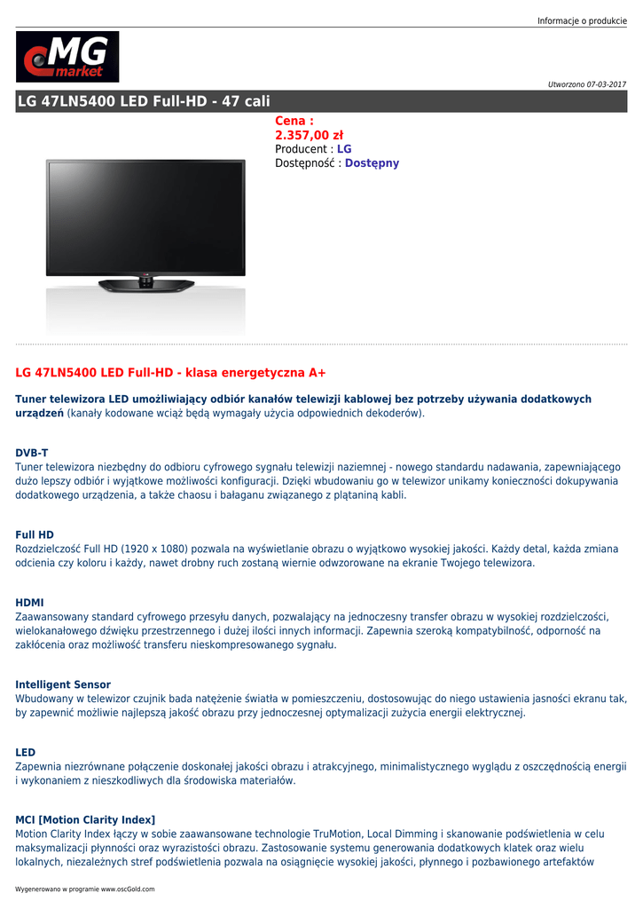 Informacje o produkcie Utworzono 07-03-2017 LG 47LN5400 LED Full-HD - 47 cali Cena : 2.357,00 zł Producent : LG Dostępność : Dostępny LG 47LN5400 LED Full-HD - klasa energetyczna A+ Tuner telewizora LED umożliwiający odbiór kanałów telewizji kablowej bez potrzeby używania dodatkowych urządzeń (kanały kodowane wciąż będą wymagały użycia odpowiednich dekoderów). DVB-T Tuner telewizora niezbędny do odbioru cyfrowego sygnału telewizji naziemnej - nowego standardu nadawania, zapewniającego dużo lepszy odbiór i wyjątkowe możliwości konfiguracji. Dzięki wbudowaniu go w telewizor unikamy konieczności dokupywania dodatkowego urządzenia, a także chaosu i bałaganu związanego z plątaniną kabli. Full HD Rozdzielczość Full HD (1920 x 1080) pozwala na wyświetlanie obrazu o wyjątkowo wysokiej jakości. Każdy detal, każda zmiana odcienia czy koloru i każdy, nawet drobny ruch zostaną wiernie odwzorowane na ekranie Twojego telewizora. HDMI Zaawansowany standard cyfrowego przesyłu danych, pozwalający na jednoczesny transfer obrazu w wysokiej rozdzielczości, wielokanałowego dźwięku przestrzennego i dużej ilości innych informacji. Zapewnia szeroką kompatybilność, odporność na zakłócenia oraz możliwość transferu nieskompresowanego sygnału. Intelligent Sensor Wbudowany w telewizor czujnik bada natężenie światła w pomieszczeniu, dostosowując do niego ustawienia jasności ekranu tak, by zapewnić możliwie najlepszą jakość obrazu przy jednoczesnej optymalizacji zużycia energii elektrycznej. LED Zapewnia niezrównane połączenie doskonałej jakości obrazu i atrakcyjnego, minimalistycznego wyglądu z oszczędnością energii i wykonaniem z nieszkodliwych dla środowiska materiałów. MCI [Motion Clarity Index] Motion Clarity Index łączy w sobie zaawansowane technologie TruMotion, Local Dimming i skanowanie podświetlenia w celu maksymalizacji płynności oraz wyrazistości obrazu. Zastosowanie systemu generowania dodatkowych klatek oraz wielu lokalnych, niezależnych stref podświetlenia pozwala na osiągnięcie wysokiej jakości, płynnego i pozbawionego artefaktów Wygenerowano w programie www.oscGold.com obrazu. MHL Technologia Mobile High-definition Link umożliwia bezpośrednie podłączenie do telewizora kompatybilnych urządzeń mobilnych wykorzystujących standard micro USB. Dzięki możliwości przesyłu wysokiej jakości obrazu oraz dźwięku przestrzennego możliwe staje się oglądanie na dużym ekranie zapisanych w pamięci urządzeń przenośnych filmów, a także wykorzystanie telewizora w roli gigantycznego ekranu, na którym wyświetlany będzie obraz z gier i aplikacji wykorzystywanych przez użytkownika. Triple XD Engine Zaawansowany procesor obrazu, zapewniający doskonałe odwzorowanie kolorów oraz wysoką precyzję i płynność nawet w bardzo dynamicznych scenach. USB 2.0 Uniwersalny standard przesyłu danych, wykorzystywany zarówno do obsługi pamięci przenośnych, jak i szerokiej gamy peryferiów komputerowych oraz urządzeń multimedialnych. Wysoka prędkość transferu pozwala na płynne odtwarzanie materiałów video z pamięci przenośnych wprost na ekranie telewizora. Panel LED Przekątna ekranu 47" Technologia HD Full HD Rozdzielczość 1920 x 1080 (HD 1080) Proporcje obrazu 16:9 Tuner TV • analogowy • DVB-T MPEG-4 (H.264) • DVB-C Technologie obrazu: - Triple XD Engine - LED Technologie Technologie dźwięku: - Wirtual Surround - Dolby Digital Technologia: A+, HDMI, Intelligent Sensor, MHL, USB 2.0, Full HD, LED, MCI [Motion Clarity Index], Triple XD Engine, DVB-C, DVB-T System dźwięku 2.0 Moc głośników 10 + 10 W Złącza HDMI 2 Złącza Component 1 Pozostałe złącza we/wy RF In (Antenna/Cable) AV In Component Video In (Y, Pb, Pr) + Audio Digital Audio Out (Optical) Headphone Out RS-232C (Control/Service) USB 2.0 Input x 1 Montaż na ścianie VESA 400 x 400 Obudowa Matowa Pobór mocy 50.7 W Wymiary 80.5 x 628 x 1079 mm Waga 14514 g Informacje o produkcie Klasa energetyczna: A +Obsługa 3D: Nie Konwerter 2D do 3D: Nie Indeks płynności obrazu [Hz]: 100 Pozostałe parametry Inne: - MHL - Simplink (HDMI CEC) Polskie menu: Tak Możliwość odtwarzania filmów z USB: Tak Automatyczne strojenie: Tak Oszczędzanie energii: Inteligentny System Oszczędzania Energii Certyfikaty Gwarancja producenta - 24 miesiące. Wygenerowano w programie www.oscGold.com ENERGY STAR®