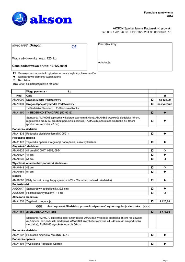 Formularz zamówienia 2014 AKSON Spółka Jawna Padjasek-Krysowski Tel: 032 / 201 96 00 Fax: 032 / 201 96 00 wewn. 18 Pieczątka firmy: Invacare® Dragon Waga użytkownika: max. 125 kg Adnotacje: Cena podstawowa brutto: 13.122,00 zł p Proszę o zaznaczenie krzyżykiem w ramce wybranych elementów u Standardowe elementy wyposażenia m Bezpłatne (NC 9999) nie kompatybilny z ref 9999 Waga pacjenta = Kod kg Opis zł AMA0000 Dragon Model Podstawowy p 13 122,00 AMZ0000 Dragon Specjalny Model Podstawowy p na życzenie p u o u p u p u AMA0326 41 cm (NC 0947, 0953, 0954) p m AMA0327 46 cm p u AMA0330 51 cm p m 1) Siedzisko Standard; 2) Siedzisko Kontur AMA1150 1) SIEDZISKO STANDARD (NC 0219) Standard: AMA0268 tapicerka w kolorze czarnym (Nylon); AMA0362 wysokość siedziska 45 cm, regulowana od 42-50 cm (bez poduszki siedziska); AMA0343 szerokość siedziska 44-49 cm (poduszka siedziska 43 cm) Poduszka siedziska AMA1336 Poduszka siedziska 5cm (NC 0591) Poduszka oparcia AMA1178 Tapicerka oparcia z regulacją naprężenia, lekko wyściełana Głębokość siedziska Wysokość oparcia (bez poduszki siedziska) AMA0448 48 cm p m AMA0454 54 cm p u o u AAD0647 Standardowy podłokietnik (32,5 cm) o u AAD0649 Podłokietnik wydłużony (+ 5 cm) o m p 1 125,00 p 1 475,00 p u p u Boczki AMA0606 Stały boczek, z regulacją wysokości (29 - 36 cm bez poduszki siedziska) Podłokietniki Akcesoria siedziska AMA1353 Zagłówek z regulacją iii Jeśli wybrałeś Siedzisko, proszę kontynuować wybór regulacje siedziska AMA1154 2) SIEDZISKO KONTUR iii Standard: AMA0272 tapicerka kolor szary (skaj); AMA0362 wysokośc siedziska 45 cm regulowana 42,5-50cm (bez poduszki siedziska); AMA0343 szerokość siedziska 44 - 49 cm (43 cm poduszka siedziska); AMA0463 wysokość oparcia 56 cm Poduszka siedziska AMA1337 Poduszka siedziska 7cm (NC 0591) Poduszka oparcia AMA1101 Wyściełana Poduszka Oparcia Strona 1 Dragon Głębokość siedziska AMA0326 41 cm (NC 0947, 0953, 0954) p m AMA0327 46 cm p u AMA0330 51 cm p m o u AAD0647 Standardowy podłokietnik (32,5 cm) o u AAD0649 Podłokietnik wydłużony (+ 5 cm) o m p 1 125,00 Boczki AMA0606 Stały boczek, z regulacją wysokości (29 - 36 cm bez poduszki siedziska) Podłokietniki Akcesoria siedziska AMA1353 Zagłówek z regulacją Regulacje siedziska Regulacja kąta nachylenia siedziska AMA1002 Nachylenie siedziska, regulowane ręcznie p u AMA1014 Nachylenie siedziska, regulowane elektrycznie p 4 950,00 Regulacja kąta pochylenia oparcia (max kąt różni się w zależności od typu siedziska) AMA0958 Regulacja kąta pochylenia 6-stopniowa (-10° do 30°) p u AMA0953 Pneumatyczna regulacja pochylenia RH 5° do 30° (NC 1150/1154+0326), 1207, 1707) p 2 490,00 AMA0954 Pneumatyczna regulacja pochylenia LH 5° do 30° (NC 1150/1154+0326), 1208, 1708) p 2 490,00 AMA0947 Elektryczna regulacja pochylenia (NC 1150/1154+0326) p 4 950,00 AMA0590 Pozycja do poduszki siedziska do 7 cm grubości p u AMA0591 Pozycja do poduszki siedziska powyżej 7 cm grubości (NC 1336, 1337) o m AMA0565 Standardowy podnóżek 80° LH p u AMA0575 Podnóżek, ręcznie regulowana wysokość LH p 550,00 AMA0566 Standardowy podnóżek 80° RH p u AMA0576 Podnóżek, ręcznie regulowana wysokość RH p 550,00 AMA0505 Standardowa płyta pod stopy LH p u AMA0511 Płyta pod stopy z regulowanym kątem i głębokością LH p 535,00 PODNÓŻKI Podnóżki indywidualne LH/RH Pozycja mocowania podnóżków Podnóżkek LH Podnóżek RH Rodzaje płyt pod stopy LH Rodzaje płyt pod stopy RH AMA0502 Standardowa płyta pod stopy RH p u AMA0508 Płyta pod stopy z regulowanym kątem i głębokością RH p 535,00 PULPIT STEROWNICZY Shark2 + pulpit sterowniczy + wspornik AMA1801 Pulpit sterowniczy Shark II ( z sygnalizacją świetlną oraz z dwoma elektrycznymi regulacjami) p u AMA1207 Wspornik standardowy RH (NC 1404, 0953) p u AMA1208 Wspornik standardowy LH (NC 1405, 0954) p m AMA1707 Odchylany wspornik + regulacja wysokości RH (NC1396, 1404, 0953) p 1 245,00 AMA1708 Odchylany wspornik + regulacja wysokości LH (NC1399, 1405, 0954) p 1 245,00 AMA1802 Pulpit sterowniczy dla opiekuna Shark2 (NC 1891, 1892, 1366) p 775,00 AMA1207 Wspornik standardowy RH p u AMA1208 Wspornik standardowy LH p m AMA1891 Podwójne sterowanie (SHARK) ze standardowym wspornikiem RH (NC 1802) p 3 930,00 AMA1892 Podwójne sterowanie (SHARK) ze standardowym wspornikiem LH (NC 1802) p 3 930,00 p u Pulpit sterowniczy opiekuna + wspornik AKCESORIA PULPITU STEROWNICZEGO Pulpit sterowniczy DUALNY dla opiekuna i użytkownika + wspornik OPCJE UKŁADU JEZDNEGO Kolor ramy AMA0259 niebieski metallic (felga koła tylnego czarna, widelec przedni srebrny) Strona 2 Dragon Koła przednie AMA0811 9" Szare pneumatyczne p u AMA0813 9" Szare Anty Przebiciowe (stale wzmocnione) p m AMA0711 12 1/2 x 2 1/4 szare, pneumatyczne p u AMA0727 12 1/2 x 2 1/4 szare, anty przebiciowe (stale wzmocnione) p m Koła tylne OPCJE DZIAŁANIA p Standard: AMA1264 zawieszenie tylne Typ silnika AMA1282 6 km/h p u p u p u Akumulatory AMA1259 60 Ah, żelowe Ładowarka AMA1343 Ładowarka 8A (200 - 250V) OPCJE BEZPIECZEŃSTWA Standard: AMA1394 Bagażnik; AMA1205 kółka przeciwwywrotne p Oświetlenie AMA1367 Sygnalizacja świetlna z kierunkowskazami p u AMA1254 Bez sygnalizacji świetlnej, oświetlenie pasywne p na życzenie p 1 500,00 AMA1361 Mocowanie boczne p 720,00 AMA1493 Zestaw mocujący 4-punktowy (do transportu wózka bez pacjenta) p 600,00 Zestaw mocujący 4-punktowy (przetestowana wersja do transportu wózka jako siedzenie AMA1494 samochodowe zgodnie z ISO 7176-19:2001) (odpowiedni zagłówek jest obowiązkowy, zob. opcje poniżej) p 775,00 AKCESORIA BEZPIECZEŃSTWA Dźwignia do pokonywania krawężników AMA1244 Dźwignia do pokonywania krawężników Zestaw transportowy Odpowiednie zagłówki do transportu osób AMA1495 Zagłowek Inavcare (typ w zależności od wybranego rodzaju siedziska) o Równoważny zagłówek innej firmy zgodny z wymogami ISO 7176-19:2001, dostarczony oddzielnie o