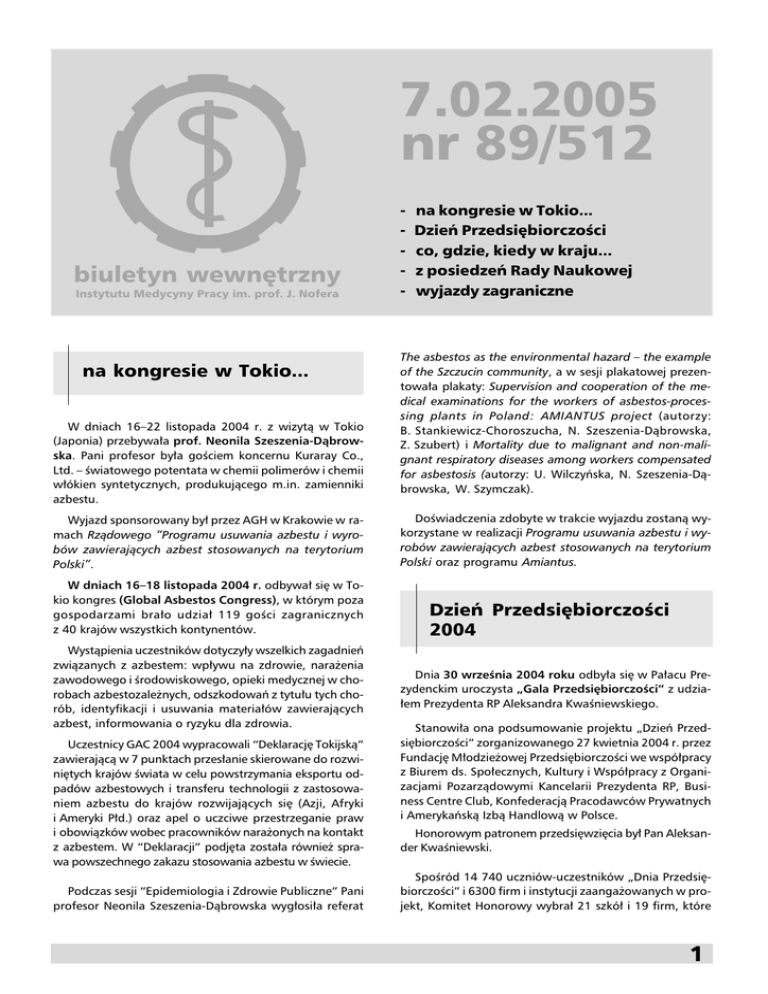 7.02.2005 nr 89/512 biuletyn wewnętrzny Instytutu Medycyny Pracy im. prof. J. Nofera na kongresie w Tokio... W dniach 16–22 listopada 2004 r. z wizytą w Tokio (Japonia) przebywała prof. Neonila Szeszenia-Dąbrowska. Pani profesor była gościem koncernu Kuraray Co., Ltd. – światowego potentata w chemii polimerów i chemii włókien syntetycznych, produkującego m.in. zamienniki azbestu. Wyjazd sponsorowany był przez AGH w Krakowie w ramach Rządowego “Programu usuwania azbestu i wyrobów zawierających azbest stosowanych na terytorium Polski”. W dniach 16–18 listopada 2004 r. odbywał się w Tokio kongres (Global Asbestos Congress), w którym poza gospodarzami brało udział 119 gości zagranicznych z 40 krajów wszystkich kontynentów. Wystąpienia uczestników dotyczyły wszelkich zagadnień związanych z azbestem: wpływu na zdrowie, narażenia zawodowego i środowiskowego, opieki medycznej w chorobach azbestozależnych, odszkodowań z tytułu tych chorób, identyfikacji i usuwania materiałów zawierających azbest, informowania o ryzyku dla zdrowia. Uczestnicy GAC 2004 wypracowali “Deklarację Tokijską” zawierającą w 7 punktach przesłanie skierowane do rozwiniętych krajów świata w celu powstrzymania eksportu odpadów azbestowych i transferu technologii z zastosowaniem azbestu do krajów rozwijających się (Azji, Afryki i Ameryki Płd.) oraz apel o uczciwe przestrzeganie praw i obowiązków wobec pracowników narażonych na kontakt z azbestem. W “Deklaracji” podjęta została również sprawa powszechnego zakazu stosowania azbestu w świecie. Podczas sesji “Epidemiologia i Zdrowie Publiczne” Pani profesor Neonila Szeszenia-Dąbrowska wygłosiła referat - na kongresie w Tokio... Dzień Przedsiębiorczości co, gdzie, kiedy w kraju... z posiedzeń Rady Naukowej wyjazdy zagraniczne The asbestos as the environmental hazard – the example of the Szczucin community, a w sesji plakatowej prezentowała plakaty: Supervision and cooperation of the medical examinations for the workers of asbestos-processing plants in Poland: AMIANTUS project (autorzy: B. Stankiewicz-Choroszucha, N. Szeszenia-Dąbrowska, Z. Szubert) i Mortality due to malignant and non-malignant respiratory diseases among workers compensated for asbestosis (autorzy: U. Wilczyńska, N. Szeszenia-Dąbrowska, W. Szymczak). Doświadczenia zdobyte w trakcie wyjazdu zostaną wykorzystane w realizacji Programu usuwania azbestu i wyrobów zawierających azbest stosowanych na terytorium Polski oraz programu Amiantus. Dzień Przedsiębiorczości 2004 Dnia 30 września 2004 roku odbyła się w Pałacu Prezydenckim uroczysta „Gala Przedsiębiorczości” z udziałem Prezydenta RP Aleksandra Kwaśniewskiego. Stanowiła ona podsumowanie projektu „Dzień Przedsiębiorczości” zorganizowanego 27 kwietnia 2004 r. przez Fundację Młodzieżowej Przedsiębiorczości we współpracy z Biurem ds. Społecznych, Kultury i Współpracy z Organizacjami Pozarządowymi Kancelarii Prezydenta RP, Business Centre Club, Konfederacją Pracodawców Prywatnych i Amerykańską Izbą Handlową w Polsce. Honorowym patronem przedsięwzięcia był Pan Aleksander Kwaśniewski. Spośród 14 740 uczniów-uczestników „Dnia Przedsiębiorczości” i 6300 firm i instytucji zaangażowanych w projekt, Komitet Honorowy wybrał 21 szkół i 19 firm, które 1 podziękowania... Pani dr Agnieszka Brzozowska chciałaby serdecznie podziękować za umożliwienie jej przeprowadzenie w Instytucie Medycyny Pracy przewodu doktorskiego. Z prawdziwą przyjemnością chciałaby złożyć na ręce prof. Konrada Rydzyńskiego podziękowania dla Pani Hanny Włostowskiej i Barbary Karbowiak za “pełen profesjonalizm w wykonywaniu swoich obowiązków, rzetelność, niespotykane wprost zaangażowanie, pomoc i doradztwo w części formalno-prawnej przewodu, a także za niezwykle miłą atmosferę”, która towarzyszyła jej podczas wszelkich czynności administracyjnych w IMP. goście z zagranicy w Instytucie... W dniach 19–20.12.2004 w IMP na zaproszenie dr Doroty Chromińskiej-Szosland przebywał Jean-Francois Arditi ze Szkoły Zdrowia Publicznego w Rennes (Francja). Celem wizyty było spotkanie robocze w związku z realizacją programu Leonardo da Vinci. Osobą sprawującą opiekę nad merytoryczną stroną wizyty była Pani dr Chromińska-Szosland. najaktywniej uczestniczyły w „Dniu Przedsiębiorczości”. Zostały one nagrodzone tytułami „Przedsiębiorczej Szkoły” i „Partnera Przedsiębiorczej Szkoły”. Statuetki i dyplomy „Przedsiębiorczym Szkołom” oraz „Partnerom Przedsiębiorczej Szkoły” wręczyli Sekretarz Stanu w Kancelarii Prezydenta RP Barbara Labuda – przewodnicząca Komitetu Honorowego, Doradca Prezydenta RP – prof. Witold Orłowski – członek Komitetu Honorowego. Wśród firm i instytucji biorących udział w Programie znalazł się również nasz Instytut, za co został uhonorowany dyplomem. Zdaniem Aleksandra Kwaśniewskiego Program pozwolił wielu młodym ludziom zobaczyć z bliska jak wygląda wymarzona praca, zapoznać się z jej specyfiką, dowiedzieć o wymagane kwalifikacje i niezbędne predyspozycje. Takie doświadczenie pozwala skonfrontować pragnienia z rzeczywistością i daje lepsze wyobrażenie o przyszłym zawodzie. Niejednemu uczniowi pozwoli uniknąć późniejszych rozczarowań i pozwoli dokonać trafniejszego wyboru. Pan Prezydent pragnie podziękować wszystkim, którzy przyczynili się do sukcesu “Dnia Przedsiębiorczości”, do tego, że udało się włączyć sektor publiczny i prywatny, przyciągnąć zarówno duże, jak i małe firmy oraz instytucje, zaangażować szkoły, rodziców i lokalne społeczności. 2 z archiwum Orzecznika... „W rozpoznaniu pisze obustronny odbiorczy ubytek słuchu typu ślimakowego, co to znaczy nie wiem – wiem natomiast, że nie słyszę”. „W związku z dokuczliwym zarostem twarzy rozpocząłem nasilone badania ginekologiczne”. „Pan 