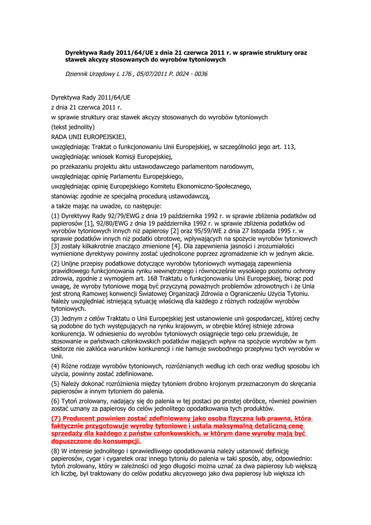 Dyrektywa Rady 2011/64/UE z dnia 21 czerwca 2011 r. w sprawie struktury oraz stawek akcyzy stosowanych do wyrobów tytoniowych Dziennik Urzędowy L 176 , 05/07/2011 P. 0024 - 0036 Dyrektywa Rady 2011/64/UE z dnia 21 czerwca 2011 r. w sprawie struktury oraz stawek akcyzy stosowanych do wyrobów tytoniowych (tekst jednolity) RADA UNII EUROPEJSKIEJ, uwzględniając Traktat o funkcjonowaniu Unii Europejskiej, w szczególności jego art. 113, uwzględniając wniosek Komisji Europejskiej, po przekazaniu projektu aktu ustawodawczego parlamentom narodowym, uwzględniając opinię Parlamentu Europejskiego, uwzględniając opinię Europejskiego Komitetu Ekonomiczno-Społecznego, stanowiąc zgodnie ze specjalną procedurą ustawodawczą, a także mając na uwadze, co następuje: (1) Dyrektywy Rady 92/79/EWG z dnia 19 października 1992 r. w sprawie zbliżenia podatków od papierosów [1], 92/80/EWG z dnia 19 października 1992 r. w sprawie zbliżenia podatków od wyrobów tytoniowych innych niż papierosy [2] oraz 95/59/WE z dnia 27 listopada 1995 r. w sprawie podatków innych niż podatki obrotowe, wpływających na spożycie wyrobów tytoniowych [3] zostały kilkakrotnie znacząco zmienione [4]. Dla zapewnienia jasności i zrozumiałości wymienione dyrektywy powinny zostać ujednolicone poprzez zgromadzenie ich w jednym akcie. (2) Unijne przepisy podatkowe dotyczące wyrobów tytoniowych wymagają zapewnienia prawidłowego funkcjonowania rynku wewnętrznego i równocześnie wysokiego poziomu ochrony zdrowia, zgodnie z wymogiem art. 168 Traktatu o funkcjonowaniu Unii Europejskiej, biorąc pod uwagę, że wyroby tytoniowe mogą być przyczyną poważnych problemów zdrowotnych i że Unia jest stroną Ramowej konwencji Światowej Organizacji Zdrowia o Ograniczeniu Użycia Tytoniu. Należy uwzględniać istniejącą sytuację właściwą dla każdego z różnych rodzajów wyrobów tytoniowych. (3) Jednym z celów Traktatu o Unii Europejskiej jest ustanowienie unii gospodarczej, której cechy są podobne do tych występujących na rynku krajowym, w obrębie której istnieje zdrowa konkurencja. W odniesieniu do wyrobów tytoniowych osiągnięcie tego celu przewiduje, że stosowanie w państwach członkowskich podatków mających wpływ na spożycie wyrobów w tym sektorze nie zakłóca warunków konkurencji i nie hamuje swobodnego przepływu tych wyrobów w Unii. (4) Różne rodzaje wyrobów tytoniowych, rozróżnianych według ich cech oraz według sposobu ich użycia, powinny zostać zdefiniowane. (5) Należy dokonać rozróżnienia między tytoniem drobno krojonym przeznaczonym do skręcania papierosów a innym tytoniem do palenia. (6) Tytoń zrolowany, nadający się do palenia w tej postaci po prostej obróbce, również powinien zostać uznany za papierosy do celów jednolitego opodatkowania tych produktów. (7) Producent powinien zostać zdefiniowany jako osoba fizyczna lub prawna, która faktycznie przygotowuje wyroby tytoniowe i ustala maksymalną detaliczną cenę sprzedaży dla każdego z państw członkowskich, w którym dane wyroby mają być dopuszczone do konsumpcji. (8) W interesie jednolitego i sprawiedliwego opodatkowania należy ustanowić definicję papierosów, cygar i cygaretek oraz innego tytoniu do palenia w taki sposób, aby, odpowiednio: tytoń zrolowany, który w zależności od jego długości można uznać za dwa papierosy lub większą ich liczbę, był traktowany do celów podatku akcyzowego jako dwa papierosy lub większa ich liczba; rodzaj cygara, który jest podobny pod wieloma względami do papierosa, był traktowany do celów podatku akcyzowego jako papieros; tytoń do palenia, który jest podobny pod wieloma względami do tytoniu drobno krojonego przeznaczonego do skręcania papierosów, był traktowany do celów podatku akcyzowego jako tytoń drobno krojony, a odpady tytoniowe zostały wyraźnie zdefiniowane. W związku z trudnościami gospodarczymi, jakie dla zainteresowanych podmiotów gospodarczych z Niemiec i Węgier mogłoby spowodować natychmiastowe wprowadzenie w życie, Niemcy i Węgry powinny zostać upoważnione do odroczenia stosowania definicji cygar i cygaretek do dnia 1 stycznia 2015 r. (9) Jeśli chodzi o podatek akcyzowy, harmonizacja struktur musi w szczególności zapobiegać zakłócaniu konkurencji różnych kategorii wyrobów tytoniowych należących do tej samej grupy przez skutki nałożenia podatku i w konsekwencji doprowadzić do otwarcia rynków krajowych państw członkowskich. (10) Bezwzględna konieczność konkurencji zakłada istnienie systemu swobodnie kształtujących się cen dla wszystkich grup wyrobów tytoniowych. (11) Struktura podatku akcyzowego na papierosy musi zawierać, oprócz specyficznego składnika obliczanego na sztukę wyrobu, proporcjonalny składnik oparty na detalicznej cenie sprzedaży, obejmujący wszystkie podatki. Podatek obrotowy nakładany na papierosy ma taki sam skutek jak proporcjonalny podatek akcyzowy i fakt ten powinien być wzięty pod uwagę w przypadku gdy ustalany jest stosunek między specyficznym składnikiem podatku akcyzowego a całkowitym ciężarem podatkowym. (12) Bez uszczerbku dla mieszanej struktury podatkowej i maksymalnego udziału specyficznego składnika w całkowitym obciążeniu podatkowym, państwa członkowskie należy wyposażyć w skuteczne środki służące nakładaniu specyficznego lub minimalnego podatku akcyzowego na papierosy, tak aby zapewnić stosowanie w całej Unii co najmniej pewnej minimalnej kwoty opodatkowania. (13) Dla właściwego funkcjonowania rynku wewnętrznego niezbędne jest ustanowienie minimalnych podatków akcyzowych dla wszystkich kategorii wyrobów tytoniowych. (14) W odniesieniu do papierosów należy zapewnić neutralne warunki konkurencji dla producentów, zmniejszyć rozdrobnienie rynków wyrobów tytoniowych oraz sprzyjać osiągnięciu celów zdrowotnych. Zatem minimum oparte na cenie powinno odnosić się do średniej ważonej detalicznej ceny