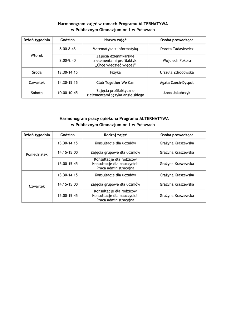 Harmonogram zajęć w ramach Programu ALTERNATYWA w Publicznym Gimnazjum nr 1 w Puławach Dzień tygodnia Godzina Nazwa zajęć Osoba prowadząca 8.00-8.45 Matematyka z informatyką Dorota Tadasiewicz 8.00-9.40 Zajęcia dziennikarskie z elementami profilaktyki „Chcę wiedzieć więcej” Wojciech Pokora Środa 13.30-14.15 Fizyka Urszula Zdrodowska Czwartek 14.30-15.15 Club Together We Can Agata Czech-Dysput Sobota 10.00-10.45 Zajęcia profilaktyczne z elementami języka angielskiego Anna Jakubczyk Wtorek Harmonogram pracy opiekuna Programu ALTERNATYWA w Publicznym Gimnazjum nr 1 w Puławach Dzień tygodnia Poniedziałek Czwartek Godzina Rodzaj zajęć Osoba prowadząca 13.30-14.15 Konsultacje dla uczniów Grażyna Kraszewska 14.15-15.00 Zajęcia grupowe dla uczniów Grażyna Kraszewska 15.00-15.45 Konsultacje dla rodziców Konsultacje dla nauczycieli Praca administracyjna Grażyna Kraszewska 13.30-14.15 Konsultacje dla uczniów Grażyna Kraszewska 14.15-15.00 Zajęcia grupowe dla uczniów Grażyna Kraszewska 15.00-15.45 Konsultacje dla rodziców Konsultacje dla nauczycieli Praca administracyjna Grażyna Kraszewska