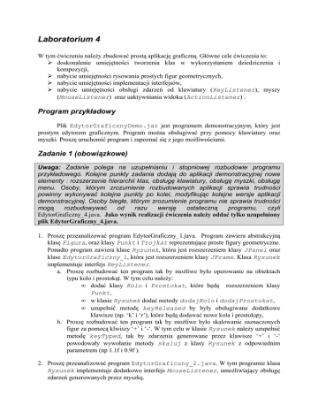 Laboratorium 4 W tym ćwiczeniu należy zbudować prostą aplikację graficzną. Główne cele ćwiczenia to: doskonalenie umiejętności tworzenia klas w wykorzystaniem dziedziczenia i kompozycji, nabycie umiejętności rysowania prostych figur geometrycznych, nabycie umiejętności implementacji interfejsów, nabycie umiejętności obsługi zdarzeń od klawiatury (KeyListener), myszy (MouseListener) oraz uaktywniania widoku (ActionListener) . Program przykładowy Plik EdytorGraficznyDemo.jar jest programem demonstracyjnym, który jest prostym edytorem graficznym. Program można obsługiwać przy pomocy klawiatury oraz myszki. Proszę uruchomić program i zapoznać się z jego możliwościami. Zadanie 1 (obowiązkowe) Uwaga: Zadanie polega na uzupełnianiu i stopniowej rozbudowie programu przykładowego. Kolejne punkty zadania dodają do aplikacji demonstracyjnej nowe elementy : rozszerzenie hierarchii klas, obsługę klawiatury, obsługę myszki, obsługę menu. Osoby, którym zrozumienie rozbudowanych aplikacji sprawia trudności powinny wykonywać kolejne punkty po kolei, modyfikując kolejne wersje aplikacji demonstracyjnej. Osoby biegłe, którym zrozumienie programu nie sprawia trudności mogą rozbudowywać od razu wersję ostateczną programu, czyli EdytorGraficzny_4.java. Jako wynik realizacji ćwiczenia należy oddać tylko uzupełniony plik EdytorGraficzny_4.java. 1. Proszę przeanalizować program EdytorGraficzny_1.java. Program zawiera abstrakcyjną klasę Figura, oraz klasy Punkt i Trojkat reprezentujące proste figury geometryczne. Ponadto program zawiera klase Rysunek, która jest rozszerzeniem klasy JPanel oraz klase EdytorGraficzny_1, która jest rozszerzeniem klasy JFrame. Klasa Rysunek implementuje interfejs KeyListener. a. Proszę rozbudować ten program tak by możliwe było operowanie na obiektach typu kolo i prostokąt. W tym celu należy: • dodać klasy Kolo i Prostokat, które będą rozszerzeniem klasy Punkt, • w klasie Rysunek dodać metody dodajKolo i dodajProstokat, • uzupełnić metodę keyReleased by były obsługiwane dodatkowe klawisze (np. ‘k’ i ‘r’), które będą dodawać nowe kola i prostokąty, b. Proszę rozbudować ten program tak by możliwe było skalowanie zaznaczonych figur za pomocą klwiszy ‘+’ i ‘-‘. W tym celu w klasie Rysunek należy uzupełnić metodę keyTyped, tak by zdarzenia generowane przez klawisze ‘+’ i ‘-‘ powodowały wywołanie metody skaluj z klasy Rysunek z odpowiednim parametrem (np 1.1f i 0.9f ). 2. Proszę przeanalizować program EdytorGraficzny_2.java. W tym programie klasa Rysunek implementuje dodatkowo interfejs MouseListener, umożliwiający obsługę zdarzeń generowanych przez myszkę. a. Proszę rozbudować ten program tak by możliwe było operowanie na obiektach typu kolo i prostokąt. (należy wykonać czynności analogiczne jak w zadaniu 1). 3. Proszę rozbudować program EdytorGraficzny_2.java, tak by możliwe było przesuwanie zaznaczonych figur za pomocą myszki. W tym celu należy: – klasa Rysunek musi implementować interfejs MouseMotionListener, – w klasie Rysunek należy dodać publiczne metody: void mouseDragged(MouseEvent e) void mouseMoved(MouseEvent e) – w klasie Rysunek dodać dwie prywatne składowe, w których będzie pamiętana ostatnia pozycja myszki, – uzupełnić metodę mousePressed, tak by pozycja myszki w chwili naciśnięcia klawisza myszki była zapamiętywana. – uzupełnić metodę mouseDragged, tak by ta metoda przesuwała zaznaczone figury o wektor od ostatnio zapamiętanej pozycji myszki do aktualnej pozycji myszki, a następnie by zapamiętywała aktualną pozycję myszki. – w konstruktorze klasy EdytorGraficzny_2 do obiektu rysunek dodać słuchacza zdarzeń addMouseMotionListener (analogicznie jak jest dodany słuchacz addMouseListener). 4. Proszę przeanalizować program EdytorGraficzny_3.java. W tym programie klasa EdytorGraficzny_3 implementuje interfejs ActionListener, który umożliwia obsługę zdarzeń generowanych przez przyciski umieszczone na głównym panelu. a. Proszę rozbudować ten program tak by możliwe było operowanie na obiektach typu kolo i prostokąt. W tym celu należy wykonać czynności analogiczne jak w zadaniu 2 i 3 oraz dodatkowo: • w klasie EdytorGraficzy_3 dodać przyciski do tworzenia kola i prostokąta, • uzupełnić konstruktor klasy EdytorGraficzy_3, tak by ten dodawał dodatkowe przyciski do panelu oraz by dodawał słuchacza zdarzeń do tych przycisków, • uzupełnić metodę actionPerformed klasy EdytorGraficzy_3, tak by obsługiwane były zdarzenia od dodatkowych przycisków. 5. Proszę przeanalizować program EdytorGraficzny_4.java. W tym programie klasa EdytorGraficzny_4 implementuje interfejs ActionListener, który umożliwia obsługę zdarzeń generowanych przez przyciski umieszczone w menu głównym aplikacji. a. Proszę rozbudować ten program tak by możliwe było operowanie na obiektach typu kolo i prostokąt. W tym celu należy wykonać czynności analogiczne jak w zadaniu 4 oraz dodatkowo: • w klasie EdytorGraficzny_4 dodać dodatkowe opcje menu w tablicy items, • uzupełnić konstruktor klasy EdytorGraficzny_4, tak by dodawał dopisane opcje do menu „Figury”, • uzupełnić metodę actionPerformed w klasie EdytorGraficzny_4, tak by ta metoda obsługiwała zdarzenia generowane przez dopisane opcje menu. b. Proszę w menu głównym programu dodać opcję „Pomoc”, która będzie zawierała dwie opcje menu: „Autor” oraz „Opis programu”. W tym celu należy: • w klasie EdytorGraficzny_4 dodać dodatkowe menu w tablicy menu, • w klasie EdytorGraficzny_4 dodać dodatkowe opcje menu w tablicy items, • uzupełnić konstruktor klasy EdytorGraficzny_4, tak by dodawał dopisane opcje do menu „Pomoc”, • uzupełnić metodę actionPerformed w klasie EdytorGraficzny_4, tak by ta metoda obsługiwała zdarzenia generowane przez dopisane opcje menu. W ramach obsługi zdarze