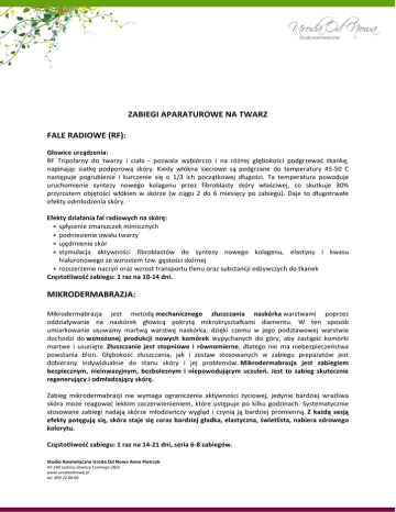 ZABIEGI APARATUROWE NA TWARZ FALE RADIOWE (RF): Głowice urządzenia: RF Tripolarny do twarzy i ciała - pozwala wybiórczo i na różnej głębokości podgrzewać tkankę, napinając siatkę podporową skóry. Kiedy włókna sieciowe są podgrzane do temperatury 45-50 C następuje pogrubienie i kurczenie się o 1/3 ich początkowej długości. Ta temperatura powoduje uruchomienie syntezy nowego kolagenu przez fibroblasty skóry właściwej, co skutkuje 30% przyrostem objętości włókien w skórze (w ciągu 2 do 6 miesięcy po zabiegu). Daje to długotrwałe efekty odmłodzenia skóry. Efekty działania fal radiowych na skórę: spłycenie zmarszczek mimicznych podniesienie owalu twarzy ujędrnienie skór stymulacja aktywności fibroblastów do syntezy nowego kolagenu, elastyny i kwasu hialuronowego ze wzrostem tzw. gęstości skórnej rozszerzenie naczyń oraz wzrost transportu tlenu oraz substancji odżywczych do tkanek Częstotliwość zabiegu: 1 raz na 10-14 dni. MIKRODERMABRAZJA: Mikrodermabrazja jest metodą mechanicznego złuszczania naskórka warstwami poprzez oddziaływanie na naskórek głowicą pokrytą mikrokryształkami diamentu. W ten sposób umiarkowanie usuwamy martwą warstwę naskórka, dzięki czemu w jego podstawowej warstwie dochodzi do wzmożonej produkcji nowych komórek wypychanych do góry, aby zastąpić komórki martwe i usunięte. Złuszczanie jest stopniowe i równomierne, dlatego nie ma niebezpieczeństwa powstania blizn. Głębokość złuszczania, jak i zestaw stosowanych w zabiegu preparatów jest dobierany indywidualnie do stanu skóry i jej problemów. Mikrodermabrazja jest zabiegiem bezpiecznym, nieinwazyjnym, bezbolesnym i niepowodującym uczuleń. Jest to zabieg skutecznie regenerujący i odmładzający skórę. Zabieg mikrodermabrazji nie wymaga ograniczenia aktywności życiowej, jedynie bardziej wrażliwa skóra może reagować lekkim zaczerwienieniem, które ustępuje po kilku godzinach. Systematycznie stosowane zabiegi nadają skórze młodzieńczy wygląd i czynią ją bardziej promienną. Z każdą sesją efekty potęgują się, skóra staje się coraz bardziej gładka, elastyczna, świetlista, nabiera zdrowego kolorytu. Częstotliwość zabiegu: 1 raz na 14-21 dni, seria 6-8 zabiegów. Studio Kosmetyczne Uroda Od Nowa Anna Pietrzyk 43-140 Lędziny Zawiszy Czarnego 28/a www.urodaodnowa.pl tel. 693 72 88 00 PEELING KAWITACYJNY i SONOFOREZA: Bardzo dobre efekty uzyskujemy łącząc peeling kawitacyjny z sonoforezą czyli wprowadzaniem składników aktywnych za pomocą fali ultradźwiękowej. Zabieg ten dobrze działa na skórę, a jednocześnie jest przyjemny dla klientki. Peeling kawitacyjny to zabieg polegający na delikatnym oczyszczeniu skóry poprzez peeling ultradźwiękowy. Działa na skórę łagodnie poprzez przyjemne, naturalne wibracje bez użycia prądu elektrycznego. Usuwanie zanieczyszczeń oraz martwych komórek przebiega bezboleśnie. Jest to system do głębokiej pielęgnacji skóry i jej regeneracji, bez efektów ubocznych. Zastosowanie tego zabiegu pozwala na głęboką regenerację skóry, poprzez błyskawiczne i efektywne jej odnowienie oraz oczyszczenie na dużej głębokości, czego rezultatem jest – zauważalna w widoczny sposób – skóra odnowiona i odświeżona. Głębokie oczyszczenie porów pozwala na lepszą wymianę jonów i natlenienie skóry, przygotowuje skórę do wszelkich kosmetycznych aplikacji, odbywa się naturalna, głęboka penetracja produktów bez zastosowania prądu, efekt wzbudzonej energii powoduje, że poziom melaniny spada, a odbarwienia i skazy cery zmniejszają się. Peeling kawitacyjny przeznaczony jest do każdego rodzaju cery, również do bardzo wrażliwej, delikatnej oraz cienkiej skóry, skłonnej do podrażnień i rozszerzonych naczynek. Efekty: usuwa martwy naskórek, odblokowuje i oczyszcza pory bezboleśnie, szybko i dokładnie czyści skórę twarzy, szyi i dekoltu reguluje wydzielanie serum i stymuluje komórki do naturalnej odnowy wspomaga leczenie trądziku drgania ultradźwięków powodują „mikromasaż” przygotowuje skórę do zabiegów kosmetycznych, zwiększając jej możliwości absorpcyjne ujędrnienia tkanki i pomaga wzmocnić naczynia krwionośne Częstotliwość zabiegu: peeling kawitacyjny 1 razy w tygodniu, seria 6-8 zabiegów sonoforeza 1-2 razy w tygodniu, seria 6-8 zabiegów. Zastosowanie zaawansowanych technologii i włącznie sprawdzonych, nowoczesnych urządzeń umożliwia nam wykonywanie NIEINWAZYJNYCH, BEZPIECZNYCH zabiegów, które są przyjemne i dają doskonałe efekty w bardzo krótkim czasie: efekt liftingu (kurczenie się włókien kolagenowych), spłycenie zmarszczek, ujędrnienie skóry, poprawa owalu twarzy, produkcja endogenna kwasu hialuronowego w skórze, dotlenienie i wzmocnienie tkanek. Studio Kosmetyczne Uroda Od Nowa Anna Pietrzyk 43-140 Lędziny Zawiszy Czarnego 28/a www.urodaodnowa.pl tel. 693 72 88 00