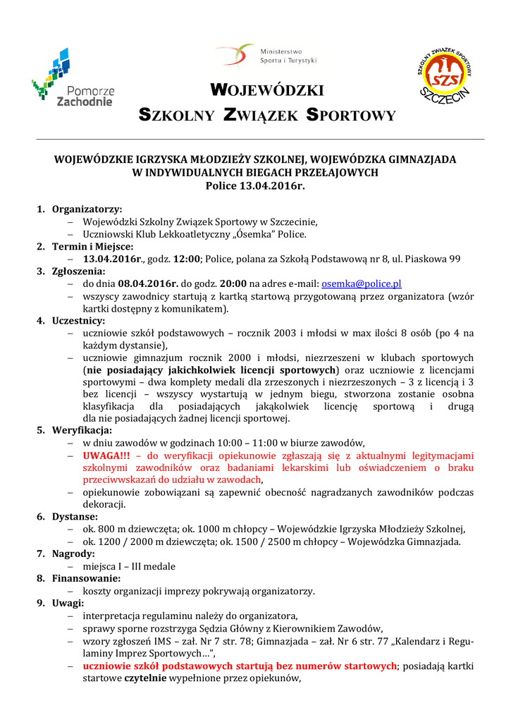 WOJEWÓDZKI SZKOLNY ZWIĄZEK SPORTOWY WOJEWÓDZKIE IGRZYSKA MŁODZIEŻY SZKOLNEJ, WOJEWÓDZKA GIMNAZJADA W INDYWIDUALNYCH BIEGACH PRZEŁAJOWYCH Police 13.04.2016r. 1. Organizatorzy: Wojewódzki Szkolny Związek Sportowy w Szczecinie, Uczniowski Klub Lekkoatletyczny „Ósemka” Police. 2. Termin i Miejsce: 13.04.2016r., godz. 12:00; Police, polana za Szkołą Podstawową nr 8, ul. Piaskowa 99 3. Zgłoszenia: do dnia 08.04.2016r. do godz. 20:00 na adres e-mail: [email protected] wszyscy zawodnicy startują z kartką startową przygotowaną przez organizatora (wzór kartki dostępny z komunikatem). 4. Uczestnicy: uczniowie szkół podstawowych – rocznik 2003 i młodsi w max ilości 8 osób (po 4 na każdym dystansie), uczniowie gimnazjum rocznik 2000 i młodsi, niezrzeszeni w klubach sportowych (nie posiadający jakichkolwiek licencji sportowych) oraz uczniowie z licencjami sportowymi – dwa komplety medali dla zrzeszonych i niezrzeszonych – 3 z licencją i 3 bez licencji – wszyscy wystartują w jednym biegu, stworzona zostanie osobna klasyfikacja dla posiadających jakąkolwiek licencję sportową i drugą dla nie posiadających żadnej licencji sportowej. 5. Weryfikacja: w dniu zawodów w godzinach 10:00 – 11:00 w biurze zawodów, UWAGA!!! – do weryfikacji opiekunowie zgłaszają się z aktualnymi legitymacjami szkolnymi zawodników oraz badaniami lekarskimi lub oświadczeniem o braku przeciwwskazań do udziału w zawodach, opiekunowie zobowiązani są zapewnić obecność nagradzanych zawodników podczas dekoracji. 6. Dystanse: ok. 800 m dziewczęta; ok. 1000 m chłopcy – Wojewódzkie Igrzyska Młodzieży Szkolnej, ok. 1200 / 2000 m dziewczęta; ok. 1500 / 2500 m chłopcy – Wojewódzka Gimnazjada. 7. Nagrody: miejsca I – III medale 8. Finansowanie: koszty organizacji imprezy pokrywają organizatorzy. 9. Uwagi: interpretacja regulaminu należy do organizatora, sprawy sporne rozstrzyga Sędzia Główny z Kierownikiem Zawodów, wzory zgłoszeń IMS – zał. Nr 7 str. 78; Gimnazjada – zał. Nr 6 str. 77 „Kalendarz i Regulaminy Imprez Sportowych…”, uczniowie szkół podstawowych startują bez numerów startowych; posiadają kartki startowe czytelnie wypełnione przez opiekunów, organizatorzy liczą na uczciwość opiekunów w temacie posiadania licencji sportowych, gimnazjaliści startują bez numerów startowych; posiadają kartki startowe czytelnie wypełnione przez opiekunów (białe – dla zawodników posiadających jakiekolwiek licencje sportowe oraz żółte dla zawodników nie posiadających licencji), organizatorzy liczą na uczciwość opiekunów w temacie posiadania licencji sportowych. 10. Orientacyjny Program Zawodów: 12.00 1200 m (K) - Gim. (600 + 600) 12.15 800 m (K) - IMS (800) 12.30 1000 m (M) - IMS (1000) 12.45 2000 m (K) - Gim. (1000 + 1000) 13.00 1500 m (M) - Gim. (500 + 1000) 13.15 2500 m (M) - Gim. (500 + 1000 + 1000) Ze sportowym pozdrowieniem