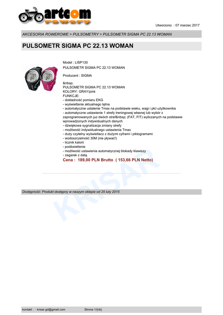 Utworzono : 07 marzec 2017 AKCESORIA ROWEROWE > PULSOMETRY > PULSOMETR SIGMA PC 22.13 WOMAN PULSOMETR SIGMA PC 22.13 WOMAN Model : LISP130 PULSOMETR SIGMA PC 22.13 WOMAN Producent : SIGMA PULSOMETR SIGMA PC 22.13 WOMAN KOLORY: GRAY/pink FUNKCJE: - dokładność pomiaru EKG - wyświetlanie aktualnego tętna - automatyczne ustalenie Tmax na podstawie wieku, wagi i płci użytkownika - automatyczne ustawienie 1 strefy treningowej własnej lub wybór z zaprogramowanych juz dwóch stref (FAT, FIT) wyliczanych na podstawie wprowadzonych indywidualnych danych - dźwiękowa sygnalizacja zmiany strefy - możliwość indywidualnego ustawienia Tmax - duży czytelny wyświetlacz z dużymi cyframi i piktogramami - wodoszczelność 30M (nie pływać!) - licznik kalorii - podświetlenie - możliwość ustawienia automatycznej blokady klawiszy - zegarek z datą R A Cena : 189,00 PLN Brutto ( 153,66 PLN Netto) S I R Dostępność: Produkt dostępny w naszym sklepie od 25 luty 2015 K kontakt : - [email protected] Strona 1/{nb}