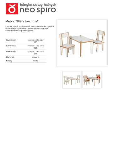 Mebla "Biała kuchnia" Zestaw mebli kuchennych dedykowany dla Domku Składanego - parawan. Meble można ozdobić samodzielnie za pomocą farb. Wysokość krzesło: 300 stół: 215 Szerokość krzesło: 152 stół: 320 Głębokość krzesło: 135 stół: 210 Materiał Kolory Powered by TCPDF (www.tcpdf.org) drewno biały