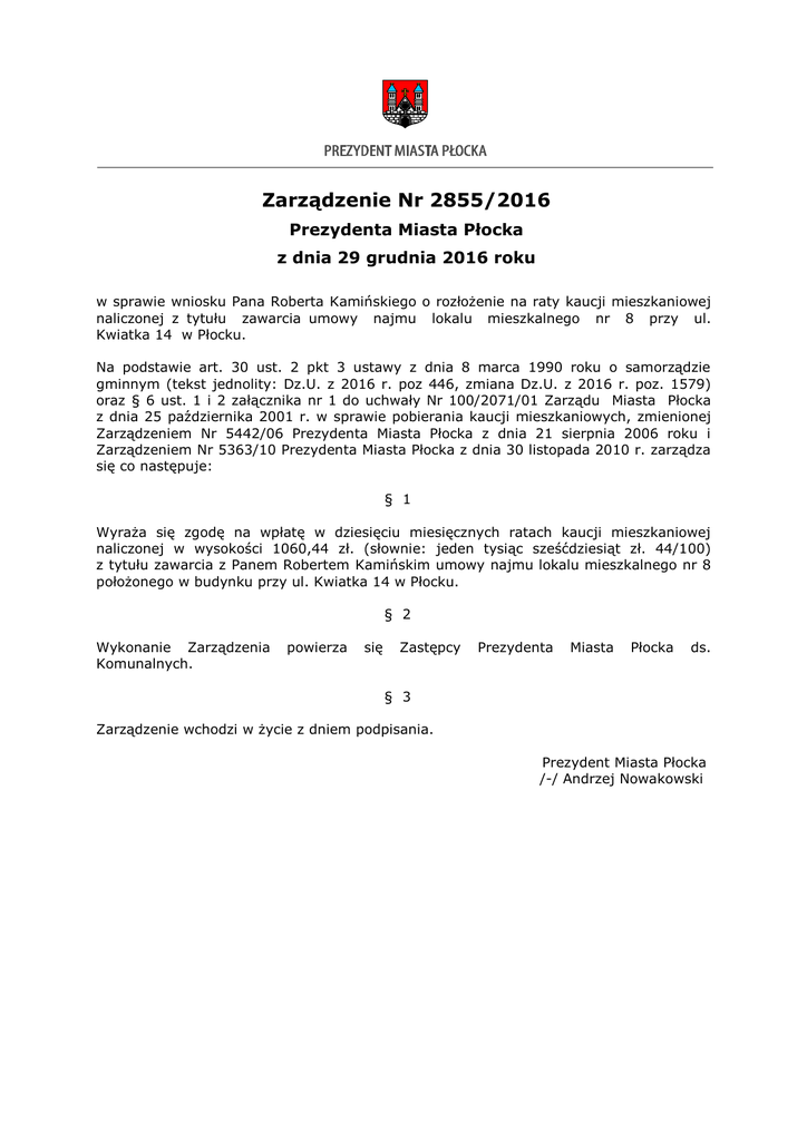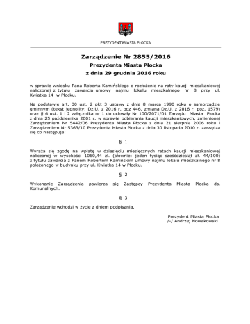 Zarządzenie Nr 2855/2016 Prezydenta Miasta Płocka z dnia 29 grudnia 2016 roku w sprawie wniosku Pana Roberta Kamińskiego o rozłożenie na raty kaucji mieszkaniowej naliczonej z tytułu zawarcia umowy najmu lokalu mieszkalnego nr 8 przy ul. Kwiatka 14 w Płocku. Na podstawie art. 30 ust. 2 pkt 3 ustawy z dnia 8 marca 1990 roku o samorządzie gminnym (tekst jednolity: Dz.U. z 2016 r. poz 446, zmiana Dz.U. z 2016 r. poz. 1579) oraz § 6 ust. 1 i 2 załącznika nr 1 do uchwały Nr 100/2071/01 Zarządu Miasta Płocka z dnia 25 października 2001 r. w sprawie pobierania kaucji mieszkaniowych, zmienionej Zarządzeniem Nr 5442/06 Prezydenta Miasta Płocka z dnia 21 sierpnia 2006 roku i Zarządzeniem Nr 5363/10 Prezydenta Miasta Płocka z dnia 30 listopada 2010 r. zarządza się co następuje: § 1 Wyraża się zgodę na wpłatę w dziesięciu miesięcznych ratach kaucji mieszkaniowej naliczonej w wysokości 1060,44 zł. (słownie: jeden tysiąc sześćdziesiąt zł. 44/100) z tytułu zawarcia z Panem Robertem Kamińskim umowy najmu lokalu mieszkalnego nr 8 położonego w budynku przy ul. Kwiatka 14 w Płocku. § 2 Wykonanie Zarządzenia Komunalnych. powierza się Zastępcy Prezydenta Miasta Płocka ds. § 3 Zarządzenie wchodzi w życie z dniem podpisania. Prezydent Miasta Płocka /-/ Andrzej Nowakowski