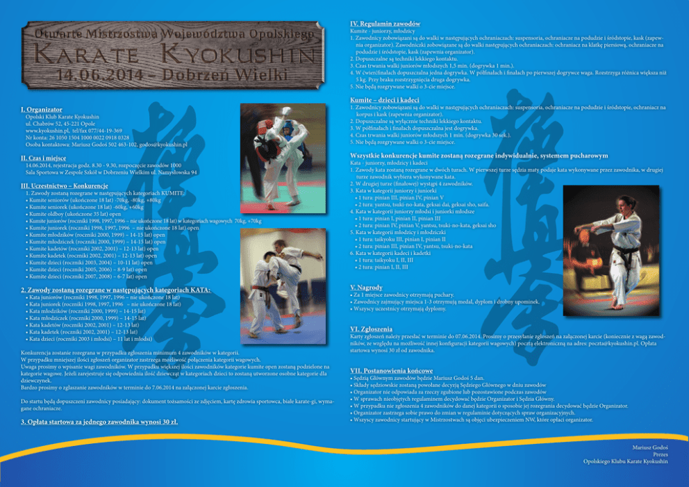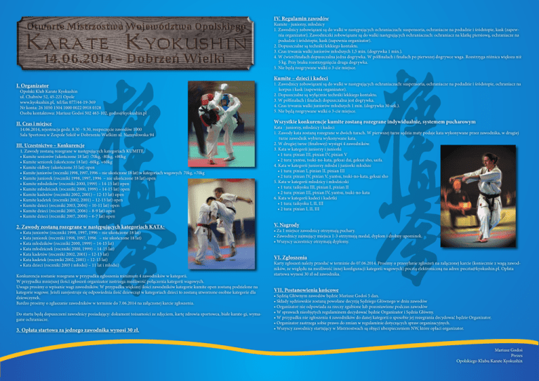 IV. Regulamin zawodów Kumite - juniorzy, młodzicy 1. Zawodnicy zobowiązani są do walki w następujących ochraniaczach: suspensoria, ochraniacze na podudzie i śródstopie, kask (zapewnia organizator). Zawodniczki zobowiązane są do walki następujących ochraniaczach: ochraniacz na klatkę piersiową, ochraniacze na podudzie i śródstopie, kask (zapewnia organizator). 2. Dopuszczalne są techniki lekkiego kontaktu. 3. Czas trwania walki juniorów młodszych 1,5 min. (dogrywka 1 min.). 4. W ćwierćfinałach dopuszczalna jedna dogrywka. W półfinałach i finałach po pierwszej dogrywce waga. Rozstrzyga różnica większa niż 5 kg. Przy braku rozstrzygnięcia druga dogrywka. 5. Nie będą rozgrywane walki o 3-cie miejsce. I. Organizator Opolski Klub Karate Kyokushin ul. Chabrów 52, 45-221 Opole www.kyokushin.pl, tel/fax 077/44-19-369 Nr konta: 26 1050 1504 1000 0022 0918 0328 Osoba kontaktowa: Mariusz Godoś 502 463-102, [email protected] II. Czas i miejsce 14.06.2014, rejestracja godz. 8.30 - 9.30, rozpoczęcie zawodów 1000 Sala Sportowa w Zespole Szkół w Dobrzeniu Wielkim ul. Namysłowska 94 III. Uczestnictwo – Konkurencje 1. Zawody zostaną rozegrane w następujących kategoriach KUMITE: • Kumite seniorów (ukończone 18 lat) -70kg, -80kg, +80kg • Kumite seniorek (ukończone 18 lat) -60kg, +60kg • Kumite oldboy (ukończone 35 lat) open • Kumite juniorów (roczniki 1998, 1997, 1996 – nie ukończone 18 lat) w kategoriach wagowych 70kg, +70kg • Kumite juniorek (roczniki 1998, 1997, 1996 – nie ukończone 18 lat) open • Kumite młodzików (roczniki 2000, 1999) – 14-15 lat) open • Kumite młodziczek (roczniki 2000, 1999) – 14-15 lat) open • Kumite kadetów (roczniki 2002, 2001) – 12-13 lat) open • Kumite kadetek (roczniki 2002, 2001) – 12-13 lat) open • Kumite dzieci (roczniki 2003, 2004) – 10-11 lat) open • Kumite dzieci (roczniki 2005, 2006) – 8-9 lat) open • Kumite dzieci (roczniki 2007, 2008) – 6-7 lat) open 2. Zawody zostaną rozegrane w następujących kategoriach KATA: • Kata juniorów (roczniki 1998, 1997, 1996 – nie ukończone 18 lat) • Kata juniorek (roczniki 1998, 1997, 1996 – nie ukończone 18 lat) • Kata młodzików (roczniki 2000, 1999) – 14-15 lat) • Kata młodziczek (roczniki 2000, 1999) – 14-15 lat) • Kata kadetów (roczniki 2002, 2001) – 12-13 lat) • Kata kadetek (roczniki 2002, 2001) – 12-13 lat) • Kata dzieci (roczniki 2003 i młodsi) – 11 lat i młodsi) Konkurencja zostanie rozegrana w przypadku zgłoszenia minimum 4 zawodników w kategorii. W przypadku mniejszej ilości zgłoszeń organizator zastrzega możliwość połączenia kategorii wagowych. Uwaga prosimy o wpisanie wagi zawodników. W przypadku większej ilości zawodników kategorie kumite open zostaną podzielone na kategorie wagowe. Jeżeli zarejestruje się odpowiednia ilość dziewcząt w kategoriach dzieci to zostaną utworzone osobne kategorie dla dziewczynek. Bardzo prosimy o zgłaszanie zawodników w terminie do 7.06.2014 na załączonej karcie zgłoszenia. Do startu będą dopuszczeni zawodnicy posiadający: dokument tożsamości ze zdjęciem, kartę zdrowia sportowca, białe karate-gi, wymagane ochraniacze. 3. Opłata startowa za jednego zawodnika wynosi 30 zł. Kumite – dzieci i kadeci 1. Zawodnicy zobowiązani są do walki w następujących ochraniaczach: suspensoria, ochraniacze na podudzie i śródstopie, ochraniacz na korpus i kask (zapewnia organizator). 2. Dopuszczalne są wyłącznie techniki lekkiego kontaktu. 3. W półfinałach i finałach dopuszczalna jest dogrywka. 4. Czas trwania walki juniorów młodszych 1 min. (dogrywka 30 sek.). 5. Nie będą rozgrywane walki o 3-cie miejsce. Wszystkie konkurencje kumite zostaną rozegrane indywidualnie, systemem pucharowym Kata - juniorzy, młodzicy i kadeci 1. Zawody kata zostaną rozegrane w dwóch turach. W pierwszej turze sędzia maty podaje kata wykonywane przez zawodnika, w drugiej turze zawodnik wybiera wykonywane kata. 2. W drugiej turze (finałowej) wystąpi 4 zawodników. 3. Kata w kategorii juniorzy i juniorki • 1 tura: pinian III, pinian IV, pinian V • 2 tura: yantsu, tsuki-no-kata, geksai dai, geksai sho, saifa. 4. Kata w kategorii juniorzy młodsi i juniorki młodsze • 1 tura: pinian I, pinian II, pinian III • 2 tura: pinian IV, pinian V, yantsu, tsuki-no-kata, geksai sho 5. Kata w kategorii młodzicy i młodziczki • 1 tura: taikyoku III, pinian I, pinian II • 2 tura: pinian III, pinian IV, yantsu, tsuki-no-kata 6. Kata w kategorii kadeci i kadetki • 1 tura: taikyoku I, II, III • 2 tura: pinian I, II, III V. Nagrody • Za 1 miejsce zawodnicy otrzymają puchary. • Zawodnicy zajmujący miejsca 1-3 otrzymują medal, dyplom i drobny upominek. • Wszyscy uczestnicy otrzymają dyplomy. VI. Zgłoszenia Karty zgłoszeń należy przesłać w terminie do 07.06.2014. Prosimy o przesyłanie zgłoszeń na załączonej karcie (koniecznie z wagą zawodników, ze względu na możliwość innej konfiguracji kategorii wagowych) pocztą elektroniczną na adres: [email protected]. Opłata startowa wynosi 30 zł od zawodnika. VII. Postanowienia końcowe • Sędzią Głównym zawodów będzie Mariusz Godoś 5 dan. • Składy sędziowskie zostaną powołane decyzją Sędziego Głównego w dniu zawodów • Organizator nie odpowiada za rzeczy zgubione lub pozostawione podczas zawodów • W sprawach nieobjętych regulaminem decydować będzie Organizator i Sędzia Główny. • W przypadku nie zgłoszenia 4 zawodników do danej kategorii o sposobie jej rozegrania decydować będzie Organizator. • Organizator zastrzega sobie prawo do zmian w regulaminie dotyczących spraw organizacyjnych. • Wszyscy zawodnicy startujący w Mistrzostwach są objęci ubezpieczeniem NW, które opłaci organizator. Mariusz Godoś Prezes Opolskiego Klubu Karate Kyokushin