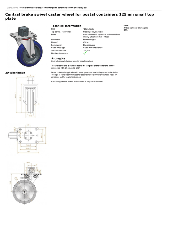 Strona głowna / Central brake swivel caster wheel for postal containers 125mm small top plate Central brake swivel caster wheel for postal containers 125mm small top plate Technical Information SKU 125smallplate Typ łożyska / otwór w kole Precyzyjne łożyska kulowe Brake Central brake with 2 positions: 1 all wheels have mobility, 2 total lock of all 4 wheels mocowania Płytka mocująca Nośność 250 kg Fork material Blue passivated Castor wheel type Castor with central brake Średnica koła / rolki 125 mm Bieżnia z niebrudzącej Szczegóły Central brake swivel caster wheel for postal containers The top lock brake is situated above the top plate of the caster and can be connected with a hexagonal shaft 2D tekeningen Wheel for industrial application with swivel system and total locking central brake device. This type of brake is common used for postal containers in Western Europe, waste bin containers and for hospital bed casters Can be supplied with various Elastic rubber or polyurethane wheels Serie: Article number: 125smallplate EAN: