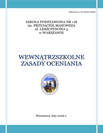 Załącznik nr 2 do Statutu Szkoły SZKOŁA PODSTAWOWA NR 118 im. PRZYJACIÓŁ MAZOWSZA ul. LESZCZYNOWA 5 w WARSZAWIE WEWNĄTRZSZKOLNE ZASADY OCENIANIA Warszawa, luty 2016 r. SPIS TREŚCI ROZDZIAŁ I POSTANOWIENIA OGÓLNE ROZDZIAŁ II OCENIANIE UCZNIÓW ROZDZIAŁ III KLASYFIKACJA UCZNIÓW ROZDZIAŁ IV PROMOCJA UCZNIÓW ROZDZIAŁ V POSTĘPOWANIE W PRZYPADKU ZASTRZEŻEŃ ODNOSZĄCYCH SIĘ DO TRYBU USTALANIA ROCZNEJ KLASYFIKACYJNEJ OCENY Z OBOWIĄZKOWYCH ZAJĘĆ EDUKACYJNYCH I ROCZNEJ KLASYFIKACYJNEJ OCENY ZACHOWANIA ROZDZIAŁ VI SPRAWDZIAN UCZNIÓW KLAS SZÓSTYCH KOŃCZĄCYCH SZKOŁĘ PODSTAWOWĄ ROZDZIAŁ VII POSTANOWIENIA KOŃCOWE 2 ZAŁĄCZNIKI 1. Karta szkolnych osiągnięć ucznia klasy I, II i III. 2. Wzór informacji niedostatecznej. do rodziców o grożącej dziecku ocenie 3. Wzór decyzji dyrektora szkoły o zwolnieniu ucznia z obowiązkowych zajęć edukacyjnych. 4. Arkusz punktowego oceniania zachowania ucznia I i II etapu edukacyjnego. 5. Przedmiotowe Zasady Oceniania poszczególnych przedmiotów. 3 WEWNĄTRZSZKOLNE ZASADY OCENIANIA SZKOŁY PODSTAWOWEJ NR 118 im. PRZYJACIÓŁ MAZOWSZA w Warszawie Wewnątrzszkolne Zasady Oceniania zostały opracowane przez nauczycieli, przy współudziale rodziców, na podstawie: 1. Ustawy z dnia 7 września 1991 roku o systemie oświaty (t.j. Dz.U. z 2004, Nr 256, poz. 2572 z późn. zm.) i przepisy wykonawcze do niej. 2. Rozporządzenia Ministra Edukacji Narodowej z dnia 30 kwietnia 2007 r. w sprawie warunków i sposobu oceniania, klasyfikowania i promowania uczniów i słuchaczy oraz przeprowadzania sprawdzianów i egzaminów w szkołach publicznych (Dz.U. z 2007 r. Nr 83, poz. 562 z późn. zm.).* 3. Rozporządzenia Ministra Edukacji Narodowej z dnia 26 lutego 2002 r. w sprawie podstawy programowej wychowania przedszkolnego oraz kształcenia ogólnego w poszczególnych typach szkół (Dz.U. z 2002 r. Nr 51, poz. 458 z późn. zmianami).** * Dz.U. z 2007 r. Nr 83 poz. 562; Dz.U. z 2007 r. Nr 130 poz. 906 ** Dz.U. z 2003 r. Nr 210, poz.2041; Dz.U. z 2005 r. Nr 19, poz.165; Dz.U. z 2006 r. Nr 228, poz.1669; ROZDZIAŁ I POSTANOWIENIA OGÓLNE §1 Wewnątrzszkolne zasady oceniania określają warunki i sposób oceniania, klasyfikowania i promowania uczniów oraz przeprowadzania sprawdzianu w ostatnim roku nauki w szkole podstawowej. §2 1. Ocenianiu podlegają: 1) osiągnięcia edukacyjne ucznia, 2) zachowanie ucznia. §3 1. Ocenianie wewnątrzszkolne ma na celu: 1) informowanie ucznia o poziomie jego osiągnięć edukacyjnych i jego zachowaniu oraz o postępach w tym zakresie, 2) kształtowanie przekonania ucznia o własnych możliwościach i postępach, budowanie obrazu samego siebie i poczucia własnej wartości, 3) motywowanie ucznia do dalszych postępów w nauce i zachowaniu, 4 4) dostarczanie rodzicom i nauczycielom informacji o postępach, trudnościach w nauce, zachowaniu oraz specjalnych uzdolnieniach ucznia, 5) sprawdzenie skuteczności metod i form pracy nauczyciela oraz umożliwienie nauczycielom doskonalenia w tym zakresie. §4 1. Nauczyciel przedmiotu na początku każdego roku szkolnego informuje uczniów oraz rodziców o: 1) wymaganiach edukacyjnych niezbędnych do uzyskania poszczególnych śródrocznych i rocznych ocen klasyfikacyjnych z obowiązkowych i dodatkowych zajęć edukacyjnych, wynikających z realizowanego przez siebie programu nauczania, 2) sposobach sprawdzania osiągnięć edukacyjnych uczniów, 3) warunkach i trybie uzyskiwania wyższej niż przewidywana rocznej oceny klasyfikacyjnej z obowiązkowych i dodatkowych zajęć edukacyjnych. 2. Informacje, o których mowa w § 4 ust. 1, pkt 1 - 3 winny być zapisane przez nauczyciela w dzienniku lekcyjnym, przez ucznia w zeszycie przedmiotowym. 3. Wychowawca oddziału na początku każdego roku szkolnego informuje uczniów i rodziców o warunkach i sposobie oraz kryteriach oceniania zachowania oraz warunkach i trybie uzyskiwania wyższej niż przewidywana rocznej oceny klasyfikacyjnej zachowania oraz skutkach ustalenia uczniowi nagannej rocznej oceny klasyfikacyjnej zachowania. Wychowawca zobowiązany jest odnotować ten fakt w dzienniku lekcyjnym. §5 Wymagania edukacyjne dla poszczególnych przedmiotów opracowane przez nauczycieli stanowiące integralną część wewnątrzszkolnych zasad oceniania są wydzielonym dokumentem i znajdują się w wewnątrzszkolnej dokumentacji przebiegu nauczania. §6 1. Nauczyciel jest zobowiązany, na podstawie opinii publicznej (niepublicznej) poradni psychologiczno – pedagogicznej, w tym publicznej (niepublicznej) poradni specjalistycznej dostosować wymagania edukacyjne do indywidualnych potrzeb psychofizycznych i edukacyjnych ucznia, u którego stwierdzono zaburzenia i odchylenia rozwojowe lub specyficzne trudności w uczeniu się, uniemożliwiające sprostanie określonym wymaganiom edukacyjnym. 2. Nauczyciel przedmiotu po zapoznaniu się z opinią poradni psychologiczno-pedagogicznej, w tym poradni specjalistycznej opracowuje indywidualne wymagania dla danego ucznia z możliwością korekty w miarę rozwoju ucznia. 3. Z wymaganiami edukacyjnymi, dostosowanymi do indywidualnych potrzeb psychofizycznych i edukacyjnych ucznia nauczyciel zobowiązany jest zapoznać ucznia i rodziców. Zapoznanie się z wymaganiami edukacyjnymi rodzice potwierdzają czytelnym podpisem. 5 ROZDZIAŁ II OCENIANIE §7 1. Ocenianie osiągnięć edukacyjnych ucznia polega na rozpoznawaniu przez nauczycieli poziomu i postępów w opanowaniu przez ucznia wiadomości i umiejętności w stosunku do: 1) wymagań określonych w podstawie programowej kształcenia ogólnego oraz wymagań edukacyjnych wynikających z realizowanych w szkole programów nauczania; 2) wymagań edukacyjnych wynikających z realizowanych w szkole programów nauczania – w przypadku dodatkowych zajęć edukacyjnych. 2. Oceniane będą indywidualne możliwości ucznia w następujących sytuacjach dydaktycznych: 1) umiejętności i wiadomości nabyte w procesie nauczania i uczenia się, 2