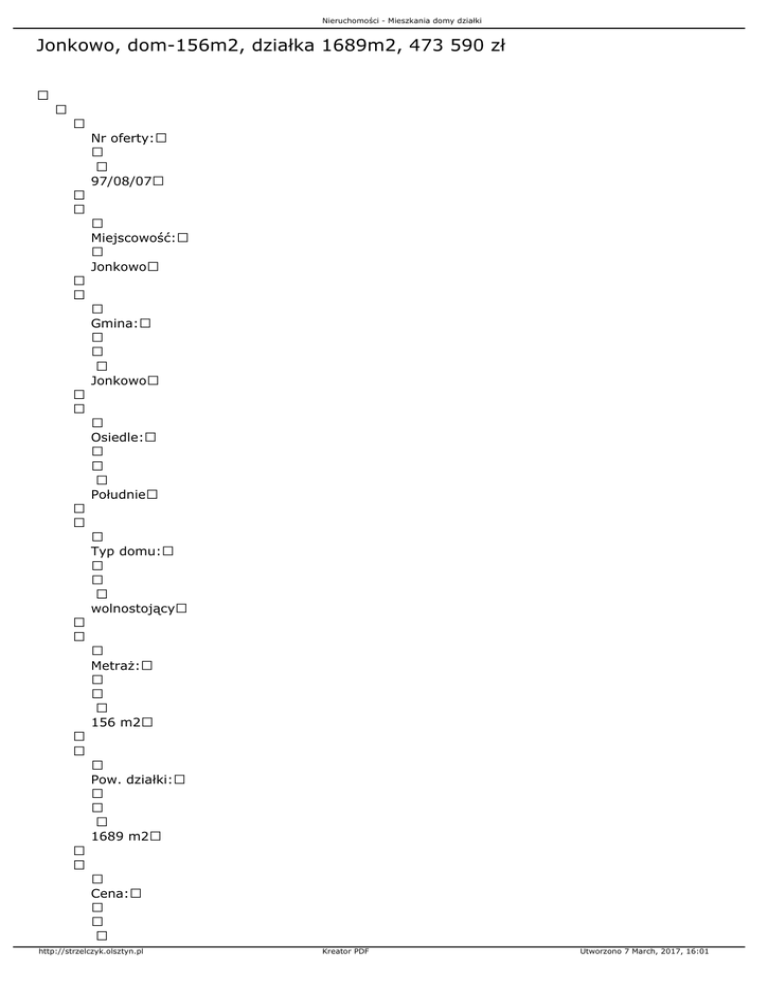Nieruchomości - Mieszkania domy działki Jonkowo, dom-156m2, działka 1689m2, 473 590 zł Nr oferty: 97/08/07 Miejscowość: Jonkowo Gmina: Jonkowo Osiedle: Południe Typ domu: wolnostojący Metraż: 156 m2 Pow. działki: 1689 m2 Cena: http://strzelczyk.olsztyn.pl Kreator PDF Utworzono 7 March, 2017, 16:01 Nieruchomości - Mieszkania domy działki 473 590 zł Typ własności: Udz. Developer Rok budowy: Surowiec: cegła Kanalizacja: jest Woda: jest Ogrzewanie: gazowe Opis pomieszczeń: Na parterze budynku usytuowany jest salon, dwie sypialnie, holl z sienią i łazienka. Do ściany szczytowej budynku dobudowany jest garaż. Istnieje możliwość zaadoptowania poddasza na dodatkową sypialnię wraz z garderobą i oddzielną łazienką. Przedmiotem oferty jest nowobudowany dom mieszkalny jednorodzinny. Budynek położony jest na nowopowstającym osiedlu domów jednorodzinnych. Jest to budynek parterowy nie podpiwniczony z poddaszem możliwym do zaadoptowania. Osiedle położone jest w bezpośrednim http://strzelczyk.olsztyn.pl Kreator PDF Utworzono 7 March, 2017, 16:01 Nieruchomości - Mieszkania domy działki sąsiedztwie Jonkowa. Jego lokalizacja jest bardzo atrakcyjna pod względem dostępności do obiektów użyteczności publicznej. W niewielkiej odległości znajduje się szkoła, market oraz Urząd Gminy. Dodatkowym atutem jest otoczenie. Są to tereny rolne niezainwestowane oraz lasy co sprawia wrażenie ciszy i spokoju mimo iż do centrum Olsztyna dzieli droga 12 km. Zdjęcia http://strzelczyk.olsztyn.pl Kreator PDF Utworzono 7 March, 2017, 16:01