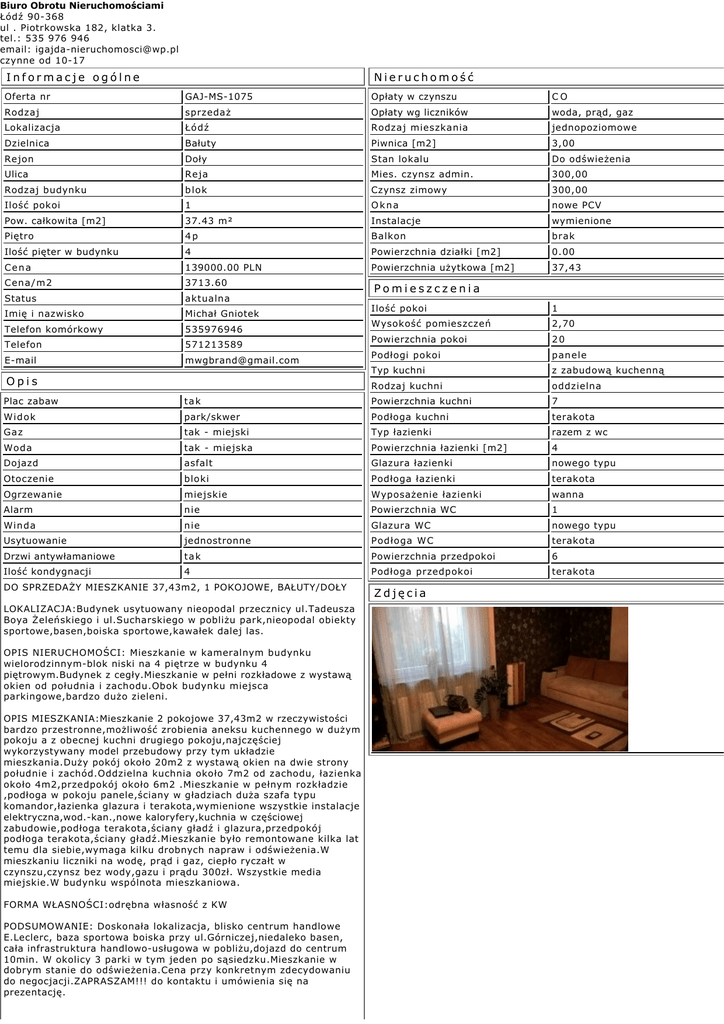 Biuro Obrotu Nieruchomościami Łódź 90-368 ul . Piotrkowska 182, klatka 3. tel.: 535 976 946 email: [email protected] czynne od 10-17 Informacje ogólne Nieruchomość Oferta nr GAJ-MS-1075 Opłaty w czynszu CO Rodzaj sprzedaż Opłaty wg liczników woda, prąd, gaz Lokalizacja Łódź Rodzaj mieszkania jednopoziomowe Dzielnica Bałuty Piwnica [m2] 3,00 Rejon Doły Stan lokalu Do odświeżenia Ulica Reja Mies. czynsz admin. 300,00 Rodzaj budynku blok Czynsz zimowy 300,00 Ilość pokoi 1 Okna nowe PCV Pow. całkowita [m2] 37.43 m² Instalacje wymienione Piętro 4p Balkon brak Ilość pięter w budynku 4 Powierzchnia działki [m2] 0.00 Cena 139000.00 PLN Powierzchnia użytkowa [m2] 37,43 Cena/m2 3713.60 Status aktualna Imię i nazwisko Michał Gniotek Telefon komórkowy Telefon E-mail 535976946 571213589 [email protected] Opis Pomieszczenia Ilość pokoi 1 Wysokość pomieszczeń 2,70 Powierzchnia pokoi 20 Podłogi pokoi panele Typ kuchni z zabudową kuchenną Rodzaj kuchni oddzielna Plac zabaw tak Powierzchnia kuchni 7 Widok park/skwer Podłoga kuchni terakota Gaz tak - miejski Typ łazienki razem z wc Woda tak - miejska Powierzchnia łazienki [m2] 4 Dojazd asfalt Glazura łazienki nowego typu Otoczenie bloki Podłoga łazienki terakota Ogrzewanie miejskie Wyposażenie łazienki wanna Alarm nie Powierzchnia WC 1 Winda nie Glazura WC nowego typu Usytuowanie jednostronne Podłoga WC terakota Drzwi antywłamaniowe tak Powierzchnia przedpokoi 6 Ilość kondygnacji 4 Podłoga przedpokoi terakota DO SPRZEDAŻY MIESZKANIE 37,43m2, 1 POKOJOWE, BAŁUTY/DOŁY LOKALIZACJA:Budynek usytuowany nieopodal przecznicy ul.Tadeusza Boya Żeleńskiego i ul.Sucharskiego w pobliżu park,nieopodal obiekty sportowe,basen,boiska sportowe,kawałek dalej las. OPIS NIERUCHOMOŚCI: Mieszkanie w kameralnym budynku wielorodzinnym-blok niski na 4 piętrze w budynku 4 piętrowym.Budynek z cegły.Mieszkanie w pełni rozkładowe z wystawą okien od południa i zachodu.Obok budynku miejsca parkingowe,bardzo dużo zieleni. OPIS MIESZKANIA:Mieszkanie 2 pokojowe 37,43m2 w rzeczywistości bardzo przestronne,możliwość zrobienia aneksu kuchennego w dużym pokoju a z obecnej kuchni drugiego pokoju,najczęściej wykorzystywany model przebudowy przy tym układzie mieszkania.Duży pokój około 20m2 z wystawą okien na dwie strony południe i zachód.Oddzielna kuchnia około 7m2 od zachodu, łazienka około 4m2,przedpokój około 6m2 .Mieszkanie w pełnym rozkładzie ,podłoga w pokoju panele,ściany w gładziach duża szafa typu komandor,łazienka glazura i terakota,wymienione wszystkie instalacje elektryczna,wod.-kan.,nowe kaloryfery,kuchnia w częściowej zabudowie,podłoga terakota,ściany gładź i glazura,przedpokój podłoga terakota,ściany gładź.Mieszkanie było remontowane kilka lat temu dla siebie,wymaga kilku drobnych napraw i odświeżenia.W mieszkaniu liczniki na wodę, prąd i gaz, ciepło ryczałt w czynszu,czynsz bez wody,gazu i prądu 300zł. Wszystkie media miejskie.W budynku wspólnota mieszkaniowa. FORMA WŁASNOŚCI:odrębna własność z KW PODSUMOWANIE: Doskonała lokalizacja, blisko centrum handlowe E.Leclerc, baza sportowa boiska przy ul.Górniczej,niedaleko basen, cała infrastruktura handlowo-usługowa w pobliżu,dojazd do centrum 10min. W okolicy 3 parki w tym jeden po sąsiedzku.Mieszkanie w dobrym stanie do odświeżenia.Cena przy konkretnym zdecydowaniu do negocjacji.ZAPRASZAM!!! do kontaktu i umówienia się na prezentację. Zdjęcia KONTAKT: Michał tel.571 213 589 LUB 537 987 022 Biuro Obrotu Nieruchomościami Łódź 90-368 ul . Piotrkowska 182, klatka 3. tel.: 535 976 946 email: [email protected] czynne od 10-17