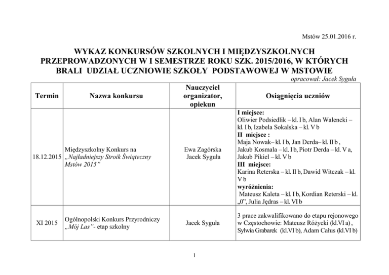Mstów 25.01.2016 r. WYKAZ KONKURSÓW SZKOLNYCH I MIĘDZYSZKOLNYCH PRZEPROWADZONYCH W I SEMESTRZE ROKU SZK. 2015/2016, W KTÓRYCH BRALI UDZIAŁ UCZNIOWIE SZKOŁY PODSTAWOWEJ W MSTOWIE opracował: Jacek Syguła Termin Nazwa konkursu Międzyszkolny Konkurs na 18.12.2015 „Najładniejszy Stroik Świąteczny Mstów 2015” XI 2015 Ogólnopolski Konkurs Przyrodniczy „Mój Las”- etap szkolny Nauczyciel organizator, opiekun Ewa Zagórska Jacek Syguła Jacek Syguła 1 Osiągnięcia uczniów I miejsce: Oliwier Podsiedlik – kl. I b, Alan Walencki – kl. I b, Izabela Sokalska – kl. V b II miejsce : Maja Nowak– kl. I b, Jan Derda– kl. II b , Jakub Kosmala – kl. I b, Piotr Derda – kl. V a, Jakub Pikiel – kl. V b III miejsce: Karina Reterska – kl. II b, Dawid Witczak – kl. Vb wyróżnienia: Mateusz Kaleta – kl. I b, Kordian Reterski – kl. „0”, Julia Jędras – kl. VI b 3 prace zakwalifikowano do etapu rejonowego w Częstochowie: Mateusz Różycki (kl.VI a) , Sylwia Grabarek (kl.VI b), Adam Całus (kl.VI b) Powiatowy Turniej Szachowy pod patronatem Starostwa Powiatowego w 29.10.2015 Częstochowie – Kruszyna 2015 w Widzowie 22.01.16 Wewnątrzszkolny Konkurs Recytatorski XII 2015 „Przydrożne kapliczki” – konkurs fotograficzny XI 2015 Powiatowy Przegląd Dziewczęcych i Młodzieżowych Wokalistów „Złoty Mikrofon 2015” Międzyszkolny Konkurs Recytatorski w Języku Niemieckim „Deutsche 08.01.2016 Gedichte” o tematyce bożonarodzeniowej Jacek Syguła kategoria dziewcząt: I miejsce – Emilia Resakowska (kl.Vb) II miejsce – Daria Mendak (kl. VI a) kategoria chłopców: I miejsce – Artur Resakowski (kl.V b) II miejsce – Wiktor Choryłek (kl. VI b) Justyna Nowak laureaci: Kinga Nowakowska (kl.V a) Dominika Jastrzębska Zofia Bochenkiewicz (kl.VIa) Irena Koza Irena Koza Monika Błachowicz organizatorzy: Mariola Całus Aleksandra Bekus opiekun: Iwona Sieradzka 2 Wyróżnienie- M. Gaudy klasa V a udział w konkursie III miejsce – Lena Dobosz (kl.V b) Szkolny konkurs na kartkę XII 2015 bożonarodzeniową w języku angielskim Międzyszkolny konkurs na XII 2015 „Bożonarodzeniowego Anioła” Anna Kluźniak Justyna Janus Małgorzata Bury Edyta Skrońska I miejsce: Jan Derda (kl. II b), Aleksandra Zgrzebna (kl. V b) II miejsce: Emilia Nowakowska (kl. I b), Alan Walencki (kl. I b), Jakub Pikiel (kl. V b), Rafał Pilarski (kl. V b) III miejsce: Karina Reterska (kl. II b), Jan Pitera (kl. V b) wyróżnienie: Piotr Derda (kl. V a) I miejsce: Kinga Nowakowska (kl.Va) wyróżnienie: Kacper Szabat (kl. III a) Jan Figzał (kl. I c) Mała Olimpiada Gminy Mstów – tenis 19.11.2015 stołowy Adriana Olech I miejsce – Jakub Wiśniewski (kl.VI a) II miejsce - Piotr Chaładaj (kl.VI a) III miejsce – Emilia Gorzkowska (kl.V a) Turniej Mikołajkowy w Piłce Nożnej Chłopców „Pilica Cup” o Puchar 03.12.2015 Starosty Częstochowskiego – Koniecpol 2015 Piotr Całusinski I miejsce 3 Adriana Olech kategoria dziewcząt: I miejsce – Marta Kowalczyk (kl.Va) kategoria chłopców: IV miejsce - Tymoteusz Jackowski (kl.VI b) VI miejsce – Szymon Kowalczyk (kl. V a) Igrzyska Szkół Podstawowych Powiatu 15.09.2015 Częstochowskiego w Sztafetowych Biegach Przełajowych Adriana Olech kategoria dziewcząt - VI miejsce kategoria chłopców - VI miejsce 16.10.2015 Mała Olimpiada Gminy Mstów – piłka nożna chłopców Piotr Całusinski I miejsce X 2015 Igrzyska Szkół Podstawowych Powiatu Częstochowskiego w Mini Piłce Nożnej Chłopców – Blachownia 2015 Piotr Całusiński IV miejsce w finale X 2015 Igrzyska Szkół Podstawowych Powiatu Częstochowskiego w Mini Piłce Nożnej Dziewcząt – Kruszyna 2015 Piotr Całusiński V miejsce w finale X 2015 XVI Ogólnopolski Turniej Piłki Nożnej Chłopców „Z podwórka na Stadion” o Puchar „Tymbarku” w Mstowie Piotr Całusiński II miejsce w eliminacjach grupowych X 2015 XVI Ogólnopolski Turniej Piłki Nożnej Dziewcząt „Z podwórka na Stadion” o Puchar „Tymbarku” w Częstochowie Piotr Całusiński IV miejsce w finale powiatowym IX 2015 Biegi Przełajowe Powiatowego Zrzeszenia LZS w Częstochowie 4 X 2015 XI 2015 Ogólnopolski Konkurs Języka Angielskiego Archimedes. Plus Lingua. Plus Konkurs plastyczny – zwierzęta leśne naszej okolicy Gabriela Wysocka – Rozenberg Beata Sieradzka laureat: Adam Całus (kl.VI b) wyróżnienie - kl. I b XI 2015 Konkurs technik plastycznych – „Drzewa wokół nas” Paweł Orlikowski I miejsce – Zofia Bochenkiewicz (kl.VIa) II miejsce – Magdalena Chojnowska (kl.VIa) III miejsce – Oliwier Rozpondek (kl.VIa) XII 2015 Konkurs na kartkę bożonarodzeniową wykonaną techniką komputerową Paweł Orlikowski udział w konkursie Marzena Radecka I miejsce – Jan Derda (kl.II b) II miejsce – M. Mazurkiewicz (kl.II b) III miejsce – K. Reterska (kl.II b) Barbara Szklarzyk II miejsce – Marta Derda (kl.III a) XII 2015 Konkurs na kartkę świąteczną X 2015 Konkurs recytatorski „Chrońmy Ziemię” 5