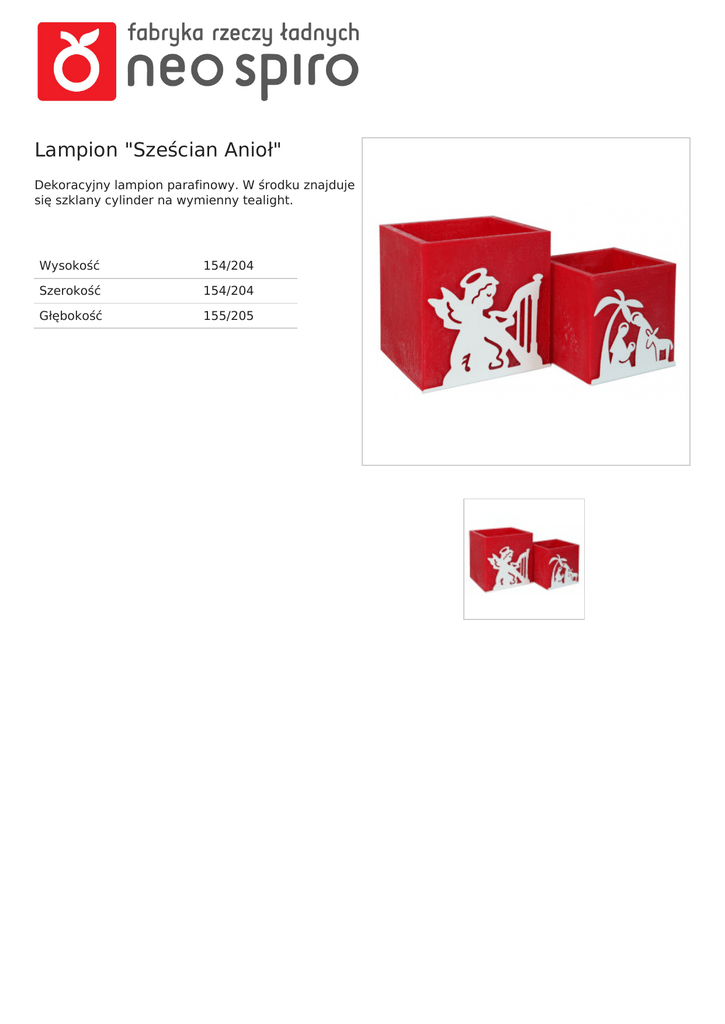 Lampion "Sześcian Anioł" Dekoracyjny lampion parafinowy. W środku znajduje się szklany cylinder na wymienny tealight. Powered by TCPDF (www.tcpdf.org) Wysokość 154/204 Szerokość 154/204 Głębokość 155/205