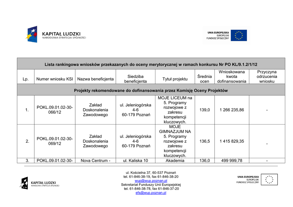 Lista rankingowa wniosków przekazanych do oceny merytorycznej w ramach konkursu Nr PO KL/9.1.2/1/12 Lp. Numer wniosku KSI Nazwa beneficjenta Siedziba beneficjenta Tytuł projektu Średnia ocen Wnioskowana kwota dofinansowania Przyczyna odrzucenia wniosku Projekty rekomendowane do dofinansowania przez Komisję Oceny Projektów 1. POKL.09.01.02-30066/12 Zakład Doskonalenia Zawodowego ul. Jeleniogórska 4-6 60-179 Poznań 2. POKL.09.01.02-30069/12 Zakład Doskonalenia Zawodowego ul. Jeleniogórska 4-6 60-179 Poznań 3. POKL.09.01.02-30- Nova Centrum - ul. Kaliska 10 MOJE LICEUM na 5. Programy rozwojowe z zakresu kompetencji kluczowych. MOJE GIMNAZJUM NA 5. Programy rozwojowe z zakresu kompetencji kluczowych. Akademia ul. Kościelna 37, 60-537 Poznań tel. 61-846-38-19, fax 61-846-38-20 [email protected] Sekretariat Funduszy Unii Europejskiej tel. 61-846-38-78, fax 61-846-37-20 [email protected] 139,0 1 266 235,86 136,5 1 415 829,35 136,0 499 999,78 - - - 067/12 Andrzej Lamek 4. POKL.09.01.02-30132/12 Wielkopolski Instytut Rozwoju Przedsiębiorczości i Edukacji ul. Prusa 31 64-800 Chodzież Akademia Twórczego Gimnazjalisty 135,5 797 971,00 - 5. POKL.09.01.02-30106/12 Gmina Olszówka Olszówka 15 62-641 Olszówka Szkoła z pasją 130,5 494 495,00 - 6. POKL.09.01.02-30054/12 Szkolenia, Doradztwo Zawodowe KWANT Sp. z o.o. ul. Seneki 6 60-461 Poznań Web Quest w szkole - lepsza przyszłość 130,0 677 971,90 - 7. POKL.09.01.02-30102/12 DGA S.A. ul. Towarowa 35 61-896 Poznań Uczymy Wielkich Jutra. Program zajęć dodatkowych dla gimnazjów 128,0 1 426 850,00 - 8. POKL.09.01.02-30055/12 Szkolenia, Doradztwo Zawodowe KWANT Sp. z o.o. ul. Seneki 6 60-461 Poznań Web Quest w szkole - lepszy start 127,5 755 033,30 - Wyższa Szkoła Biznesu w Pile Aleja Niepodległości 2 64-920 Piła Pracownie Wzmacniania Kompetencji Kluczowych Uczniów - Program 125,5 1 569 521,40 - 9. POKL.09.01.02-30129/12 63-500 Ostrzeszów gimnazjalistyprojekt zajęć dodatkowych dla uczniów z gimnazjum w Mikorzynie ul. Kościelna 37, 60-537 Poznań tel. 61-846-38-19, fax 61-846-38-20 [email protected] Sekretariat Funduszy Unii Europejskiej tel. 61-846-38-78, fax 61-846-37-20 [email protected] 10. POKL.09.01.02-30088/12 Gmina Drawsko ul. Powstańców Wielkopolskich 121 64-733 Drawsko 11. POKL.09.01.02-30081/12 Leader School Konin Alina Błaszczyk ul. Wojska Polskiego 37 62-500 Konin 12. POKL.09.01.02-30060/12 Starostwo w Nowym Tomyślu ul. Poznańska 33 64-300 Nowy Tomyśl 13. POKL.09.01.02-30080/12 Fundacja Inicjowania Rozwoju Społecznego ul. Wierzbięcice 16/1 61-568 Poznań 14. POKL.09.01.02-30105/12 Fundacja "Pomoc Dzieciom Wiejskim" Bliżyce 4 62-085 Skoki 15. POKL.09.01.02-30- Gmina Chodów Chodów 18 Rozwojowy dla 3 Gimnazjów z powiatu złotowskiego Rozwijanie kompetencji kluczowych uczniów Gimnazjum w Drawsku Akademia talentów Nauki ścisłe w połączeniu z językiem angielskim- szansą młodego pokolenia na lepszą przyszłość Atrakcyjne Gimnazjum szansą na dobry start uczniów Program rozwojowy Szkoły Podstawowej w Łopuchowie Równy start w ul. Kościelna 37, 60-537 Poznań tel. 61-846-38-19, fax 61-846-38-20 [email protected] Sekretariat Funduszy Unii Europejskiej tel. 61-846-38-78, fax 61-846-37-20 [email protected] 124,5 398 106,50 - 122,0 671 544,00 - 120,0 447 805,00 - 118,0 824 615,20 - 117,0 455 710,00 - 116,0 846 983,36 - 62-652 Chodów 062/12 16. POKL.09.01.02-30083/12 Gmina Siedlec ul. Zbąszyńska 17 64-212 Siedlec 17. POKL.09.01.02-30146/12 EUROCONSULT Biuro Handlowe Zdzisław Lara os. Rusa 134/18 61-245 Poznań 18. POKL.09.01.02-30120/12 Gmina Krzykosy ul. Główna 37 63-024 Krzykosy 19. POKL.09.01.02-30085/12 Fenix Group Polska Sp. z o.o. ul. Zieleńska 1 61-059 Poznań 20. POKL.09.01.02-30061/12 Gmina Przykona / Zespół Szkół w Przykonie ul. Szkolna 4A 62-731 Przykona 21. POKL.09.01.02-30091/12 Gmina Krzyż Wielkopolski ul. Wojska Polskiego 14 64-761 Krzyż Wielkopolski POKL.09.01.02-30089/12 Centrum Kształcenia Języków Obcych SUPREME Magdalena Rynek 31 63-600 Kępno 22. przyszłość Programy rozwojowe szkół w gminie Siedlec Wiedza moim kapitałem na przyszłość Niezawodni uczniowie Akademia młodego naukowca Program rozwojowy "Konopnicka szkołą równych szans". Rozwój kompetencji kluczowych uczniów Szkoły Podstawowej w Krzyżu Wielkopolskim Szansa na sukces ul. Kościelna 37, 60-537 Poznań tel. 61-846-38-19, fax 61-846-38-20 [email protected] Sekretariat Funduszy Unii Europejskiej tel. 61-846-38-78, fax 61-846-37-20 [email protected] 114,5 1 029 122,50 - 114,0 970 955,00 - 112,5 910 628,00 - 112,5 685 530,00 - 112,0 526 990,00 - 111,5 342 070,50 - 110,5 344 385,00 - Kamińska 23. POKL.09.01.02-30051/12 Gmina Babiak pl. Wolności 5 62-620 Babiak 24. POKL.09.01.02-30115/12 Biuro Handlowe EUROCONSULT Zdzisław Lara Os. Rusa 134/18 61-245 Poznań 25. POKL.09.01.02-30073/12 Fundacja Inicjowania Rozwoju Społecznego ul. Wierzbięcice 16/1 61-568 Poznań 26. POKL.09.01.02-30114/12 Eurodoradztwo Magdalena Binkowska-Jenczyk ul. Leśna 2 64-840 Budzyń 27. POKL.09.01.02-30110/12 Invention-Group Bożydar Milewski ul. Żorska 38A 61-345 Poznań 28. POKL.09.01.02-30065/12 29. POKL.09.01.02-30087/12 Gmina i Miasto Witkowo/Gimnazju m im. Adama Borysa w Witkowie Ośrodek Doskonalenia Nauczycieli w Zanim pójdę w świat Lepsze wykształcenieszansą na lepsze życie Nowoczesny Ogólniak Kompetentny Uczeń NOWA SZANSA program rozwojowy dla Szkoły Podstawowej i Gimnazjum w Zespole Szkół w Gościejewie Robo-informatyka w Gimnazjum w Kórniku 109,0 1 008 024,00 - 108,0 910 510,00 - 108,0 696 400,00 - 106,0 1 336 650,00 - 104,5 570 186,00 - ul. Poznańska 47 62-230 Witkowo Z nauką w przyszłość 104,0 925 250,00 - ul. Sosnowa 14 62-510 Konin Akademia Równych Szans 103,0 499 940,00 - ul. Kościelna 37, 60-537 Poznań tel. 61-846-38-19, fax 61-846-38-20 [email protected] Sekretariat Funduszy Unii Europejskiej tel. 61-846-38-78, fax 61-846-37-20 [email protected] Koninie 30. POKL.09.01.02-3