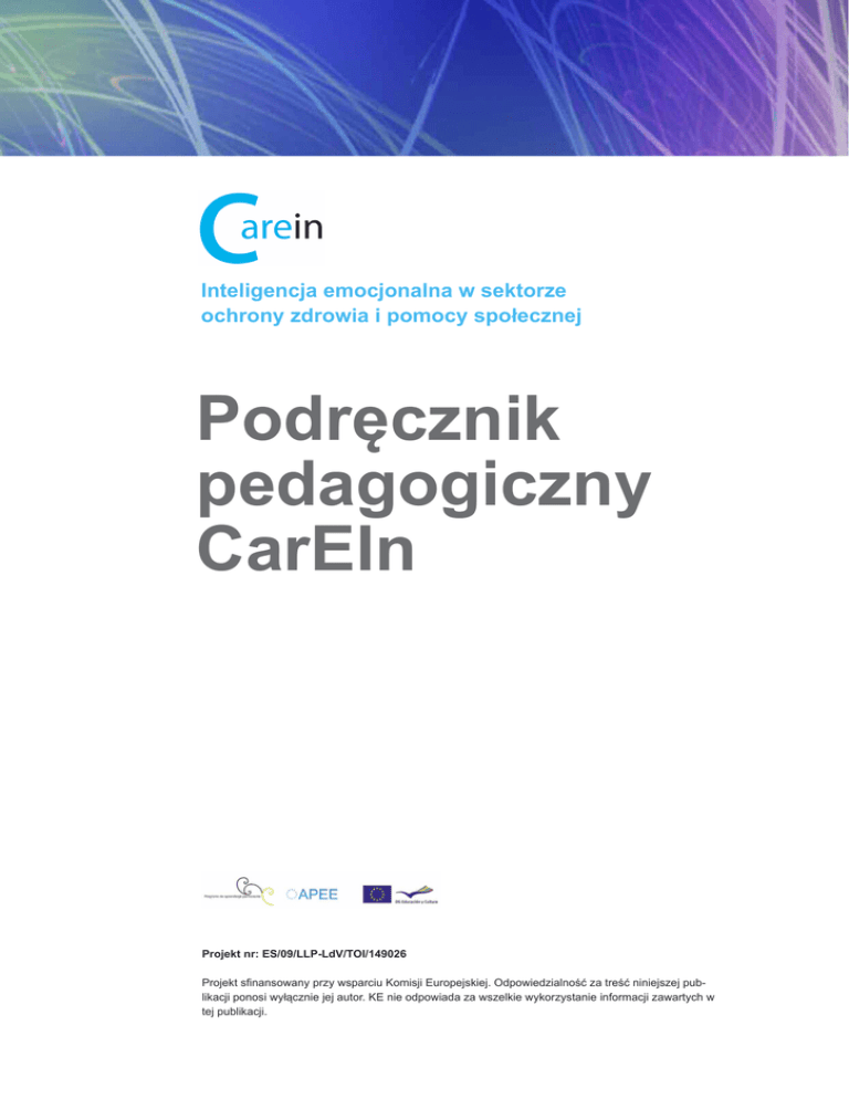 Inteligencja emocjonalna w sektorze ochrony zdrowia i pomocy społecznej Podręcznik pedagogiczny CarEIn Projekt nr: ES/09/LLP-LdV/TOI/149026 Projekt sfinansowany przy wsparciu Komisji Europejskiej. Odpowiedzialność za treść niniejszej publikacji ponosi wyłącznie jej autor. KE nie odpowiada za wszelkie wykorzystanie informacji zawartych w tej publikacji. Inteligencja emocjonalna w sektorze ochrony zdrowia i pomocy społecznej Podręcznik pedagogiczny CarEIn Spis treści 1. WSTĘP 3 2. NARZĘDZIE SZKOLENIOWE CarEIn 4 3. KONTEKSTY UCZENIA SIĘ 8 4. WNIOSKI 10 www.carein.eu 2 Inteligencja emocjonalna w sektorze ochrony zdrowia i pomocy społecznej Podręcznik pedagogiczny CarEIn WSTĘP Niniejszy podręcznik stanowi element zasobów szkoleniowych, których zadaniem jest wspieranie osoby uczące się oraz potencjalnych trenerów w procesie odkrywania i wykorzystywania narzędzia szkoleniowego CarEIn opracowanego w ramach projektu CarEIn (ES/09/LLP-LdV/TOI/149026). Podręcznik ten został opracowany przy uwzględnieniu opinii i zaleceń osób testujących (ekspertów i użytkowników) na etapie walidacji projektu (maj – lipiec 2011 r). Ponadto partnerzy przeprowadzili badanie mające na celu zebranie wytycznych dotyczących wykorzystania treści szkoleniowych, zasobów i zastosowań wchodzących w skład narzędzia. Narzędzie szkoleniowe CarEIn ma na celu zaproponowanie środowiska uczenia się opartego na Web 2.0, pomocnego pracownikom sektora opieki zdrowotnej i społecznej w nabywaniu kompetencji w zakresie Inteligencji Emocjonalnej (IE) prowadzącego do podniesienia jakości ich codziennej pracy i działań oraz, w efekcie, do podniesienia jakości życia beneficjentów sektora opieki zdrowotnej i społecznej. Podstawowe grupy docelowe narzędzia to pracownicy opieki społecznej (asystenci społeczni, psycholodzy, terapeuci zajęciowi, opiekunowie, itp.), pracownicy sektora opieki medycznej i zdrowotnej (lekarze, pielęgniarki, fizjoterapeuci, itp.), pracujący w ośrodkach opieki społecznej takich jak ośrodki rehabilitacji, ośrodki opieki dziennej/dzienne domy pobytu lub instytucje opieki społecznej. Beneficjentami końcowymi projektu są wszystkie te grupy, które cierpią na postępującą utratę funkcji fizycznych i z tego powodu, poza opieką medyczną, potrzebują również opieki społecznej. Przykładowo będą to osoby cierpiące na postępujące schorzenia wpływające na ich zdolności funkcjonalne lub osoby starsze. Podręcznik ten jest podzielony na 4 części organizujące informacje: ■ ■ ■ ■ www.carein.eu Wprowadzenie Narzędzie szkoleniowe CarEIn Konteksty uczenia się Wnioski 3 Inteligencja emocjonalna w sektorze ochrony zdrowia i pomocy społecznej Podręcznik pedagogiczny CarEIn Zaleca się dokładne zapoznanie się z zawartą tutaj metodologią oraz postępowanie wg sugerowanych etapów, dzięki czemu rezultaty uzyskane po zakończeniu tego szkolenia będą lepsze. . NARZĘDZIE SZKOLENIOWE CarEIn Narzędzie szkoleniowe CarEIn stanowi główny efekt dwuletniego projektu (2009 – 2011r.) Jest on wynikiem przedłużenia poprzedniego projektu pod nazwą TREIN. Celem tego narzędzia szkoleniowego jest: ■ ■ ■ ■ ■ ■ Zaproponowanie środowiska e-leareningowego jako doświadczenia w procesie uczenia się; Podniesienie świadomości dotyczącej pojęcia Inteligencji Emocjonalnej (IE); Poprawę umiejętności i kompetencji w zakresie IE pracowników sektora opieki zdrowotnej; Podniesienie jakości opieki poprzez poprawę zdolności w zakresie IE pracowników sektora opieki; Wzmocnienie procesu uczenia się przez całe życie i nieformalnego uczenia się w sektorach zdrowia i pomocy; Dostarczenie narzędzi i zasobów pomocnych w szkoleniu w zakresie IE. Narzędzie interaktywne CarEIN to wspólny materiał opracowany przez partnerów projektu który jednocześnie odzwierciedla globalne oraz krajowe uwarunkowania partnerów projektu. Oferowane narzędzie szkoleniowe proponuje zestaw modułów szkoleniowych oraz całe doświadczenie uczenia się obejmujące takie możliwości jak testy samooceny, ćwiczenia i zadania, dodatkowe zasoby, dokumenty opracowane w ramach projektu oraz dostępnych na innych platformach komunikacji takich jak Facebook, Forum i YouTube. Opracowanie tego środowiska uczenia się oparte było na różnorodnych aspektach pedagogicznych, graficznych, itp. oraz cechach dostępności treści, np. spójność tekstu, utrzymanie interaktywnego charakteru materiałów we wszystkich poruszanych tematach oraz przyjazna i intuicyjna nawigacja. W ten sposób możliwe jest pobudzenie zainteresowania użytkowników/uczących się i ułatwienie przekazywania wiedzy i informacji. www.carein.eu 4 Inteligencja emocjonalna w sektorze ochrony zdrowia i pomocy społecznej Podręcznik pedagogiczny CarEIn Podręcznik i materiały przygotowano z poszanowaniem zasad przejrzystości i integralności, przy uwzględnieniu punktu widzenia użytkownika. Narzędzie szkoleniowe CarEIn oferuje i użytkownikowi i trenerowi różnorodne i pełne doświadczenie uczenia się. Zdefiniowane jest ono swoją strukturą - modułami szkoleniowymi, wspartymi zasobami zewnętrznymi dopełniającymi i wzmacniającymi proces uczenia się. Platforma oparta jest na rozwiązaniu Moodle z poszanowaniem filozofii uczenia się stosowanej na tej platformie i zachęcającej uczących się do uczestnictwa i współpracy. Jednocześnie narzędzie to działa w duchu projektu i wykorzystuje w pełni potencjał Web 2.0 w zakresie uczenia się. Narzędzie szkoleniowe CarEIn jest dostępne w kilku językach (angielskim, hiszpańskim, duńskim, bułgarskim, czeskim, polskim, włoskim i niemieckim) i zasadniczo dzieli się na 9 modułów szkoleniowych: ■ ■ ■ ■ ■ ■ ■ ■ ■ Opis projektu Wprowadzenie do modułów szkoleniowych Zarządzanie stresem Opieka nad trudnymi pacjentami: poznawanie własnych emocji Rozpoznawanie różnic: różni ale równi Współpracownicy Praca z s