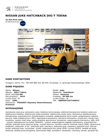 NISSAN JUKE HATCHBACK DIG-T TEKNA 52 024 PLN netto 63 990 PLN brutto DANE KONTAKTOWE Grzegorz, Górny, Tel.: 784 069 986, Ria, 86-300, Grudziądz, ul. Ignacego Paderewskiego 183A DANE POJAZDU Marka : Nissan Wersja : DIG-T Tekna Silnik :1.2 115 KM Rok produkcji : 2015 Liczba drzwi : 5 Kolor : żółty Gwarancja : PEUGEOT Używany Gwarantowany Premium Model : Juke Nadwozie : hatchback Paliwo : benzyna Przebieg : 30 400 km Liczba miejsc : 5 VIN : SJNFEAF15U7166012 WYPOSAŻENIE domykanie szyb przy zamykaniu auta, dzielona tylna kanapa, elektrochromatyczne lusterko wsteczne, elektryczne lusterka, elektryczne szyby przednie, elektryczne szyby tylne, kierownica wielofunkcyjna, klimatyzacja: automatyczna, klimatyzowany schowek, podgrzewana tylna szyba, podgrzewane lusterka boczne, radio niefabryczne z MP3, regulowana kierownica, skórzana kierownica, smartcard / hands free / smartkey, system start-stop, szyba przednia atermiczna, tempomat, wspomaganie kierownicy, ABS, ACS - system zabezpieczeń po kolizji, BAS/AFU - system wspomagania nagłego hamowania, automatyczne światła, blokada drzwi podczas jazdy, czujniki deszczu, kamera cofania, kontrola trakcji (ASR), ogranicznik prędkości, poduszek: 6 szt., poduszka pow. kierowcy, poduszka pow. pasażera, poduszki pow. boczne przód, poduszki pow. kurtynowe - przód, stabilizacja toru jazdy (ESP), uchwyt ISOFIX, światła do jazdy dziennej, światła przeciwmgielne, aluminiowe felgi, autoalarm, bluetooth, centralny zamek, gniazdo SD, gniazdo USB, immobiliser, komputer pokładowy, nawigacja satelitarna, przyciemniane szyby, reflektory ksenonowe, relingi, wyjście aux, zestaw głośnomówiący, światła LED WYPOSAŻENIE DODATKOWE bezwypadkowy, gwarancja, książka serwisowa, serwisowany w ASO, stan bardzo dobry OPIS POJAZDU F.H. RiA Sp. z o. o. Sp. k. AUTORYZOWANY DEALER PEUGEOT sprzeda: NISSAN JUKE 1.2 DIG-T 115 KM w topowej wersji TEKNA. Pierwszy właściciel, salon PL Książka serwisowa 12 miesięcy gwarancji ( z możliwością przedłużenia ) Jak nowy FVat 23% Wyjątkowo bogate wyposażenie : System kamer 360 System Nissan Connect - system nawigacji z dotykowym ekranem System Safety Shield - monit. martwego pola lane assist, ostrzeżenie o poruszających się obiektach Nissan Dynamic Control System - system zmiany charakterystyki jazdy (sportowy, eco, normalny) Usługi Google (prognoza pogody, ceny paliw, informacje nt. lotów, trasy ECO ) Podsufitka w kolorze czarnym oraz słupki B i C Alufelgi 18' Wiele więcej! Samochód z polskiego salonu po pierwszym właścicielu oferowany w programie PEUGEOT UŻYWANY GWARANTOWANY - Komfort : Certyfikat jakości DEKRA 12 miesięcy gwarancji z możliwością przedłużenia nawet do 36 miesięcy (Na terenie całej UE) Pakiet Assistance 24/7 (Na terenie całej UE) Samochód zastępczy na czas ewentualnej naprawy Oferta ubezpieczeniowa na warunkach dealerskich Miejsce eksponowania pojazdu: RiA Autoryzowany Dealer Peugeot Grudziądz Paderewskiego 183a 86-300 Grudziądz pn-pt 9-17 so 09-15:30 Dlaczego warto nam zaufać? Jesteśmy Autoryzowanym Dealerem PEUGEOT, liderem sprzedaży aut w programie PEUGEOT UŻYWANY GWARANTOWANY Drobiazgowo sprawdziliśmy stan techniczny i prawny samochodu Każde auto ma gwarantowany przebieg Zawsze wystawiamy faktury na pełną wartość pojazdu Możliwość wykonania jazdy próbnej przez zakupem oraz wgłądu w dokumentację pojazdu Każdy samochód posiada ważną polisę OC oraz aktualne badania techniczne Auta zostały przygotowane do rejestracji Jeśli pojazd nie posiada gwarancji fabrycznej - udzielamy nawet 24 miesięcznej GWARANCJI, która ważna jest u każdego dealera Peugeot Gwarancja 12 miesięcy Peugeot Używany Gwarantowany bez limitu kilometrów szeroki zakres podzespołów objętych gwarancją realizacja napraw w całej Unii Europejskiej samochód zastępczy przy awarii pojazdu assistance przez cały czas trwania gwarancji możliwość przedłużenia gwarancji o kolejny rok Oferujemy pełną paletę dodatkowych produktów: LEASING w ofercie większość firm leasingowych od 1 procent wpłaty wstępnej bez zbędnych formalności do 84 miesięcy formalności w max. 24 godziny, włącznie z rejestracją na miejscu również nowe działalności finansowanie także bez BIK i KRD w promocyjnej cenie DAS - opieka prawna KREDYT zawsze najciekawsze oferty finansowania do 100 procent wartości pojazdu do 8 lat formalności nawet w 15 minut również nowe działalności i zatrudnieni za granicą finansowanie również bez BIK i KRD UBEZPIECZENIA specjalne pakiety dealerskie promocyjne pakiety od 2,99 procent konkurencyjne ceny, pełny pakiet od 999,dodatkowe zniżki dla stałych klientów Wystawiamy fakturę VAT 23, która w pełni odpowiada płatności za pojazd Przy zakupie na firmę możliwość odliczenia 50 lub 100 procent VAT. Każde auto jest przygotowane do rejestracji - kupujący nie płaci 2 proc. podatku PCC Niniejsze ogłoszenie nie stanowi oferty handlowej w myśl art. 66, § 1. Kodeksu Cywilnego. Sprzedający nie odpowiada za ewentualne błędy lub nieaktualność ogłoszenia. Samochód sprzedawany w programie PEUGEOT Używany Gwarantowany PREMIUM: Roczna Gwarancja Umowna Certyfikat Jakości Pojazdu Dekra Opieka Peugeot Assitance Specjalna Oferta Ubezpieczeniowa Specjalna Oferta Finansowania Zakupu Wymiana w 30 Dni Dowiedz się więcej na : http://www.UzywanyGwarantowany.pl QR CODE DLA OGŁOSZENIA W SERWISIE UZYWANYGWARANTOWANY.PL Powered by TCPDF (www.tcpdf.org)