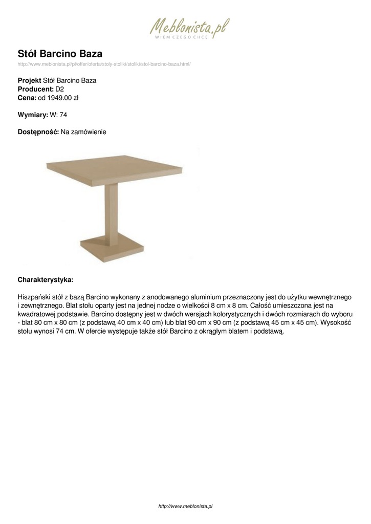 Stół Barcino Baza http://www.meblonista.pl/pl/offer/oferta/stoly-stoliki/stoliki/stol-barcino-baza.html/ Projekt Stół Barcino Baza Producent: D2 Cena: od 1949.00 zł Wymiary: W: 74 Dostępność: Na zamówienie Charakterystyka: Hiszpański stół z bazą Barcino wykonany z anodowanego aluminium przeznaczony jest do użytku wewnętrznego i zewnętrznego. Blat stołu oparty jest na jednej nodze o wielkości 8 cm x 8 cm. Całość umieszczona jest na kwadratowej podstawie. Barcino dostępny jest w dwóch wersjach kolorystycznych i dwóch rozmiarach do wyboru - blat 80 cm x 80 cm (z podstawą 40 cm x 40 cm) lub blat 90 cm x 90 cm (z podstawą 45 cm x 45 cm). Wysokość stołu wynosi 74 cm. W ofercie występuje także stół Barcino z okrągłym blatem i podstawą. http://www.meblonista.pl Dostępne wersje produktu: nazwa produktu Stół Barcino Baza warianty 80x80, kolor czarny cena 1949.00zł dostępne Na zamówienie Stół Barcino Baza 80x80, kolor piaskowy 1949.00zł Na zamówienie Stół Barcino Baza 80x80, kolor biały 1949.00zł Na zamówienie Stół Barcino Baza 90x90, kolor biały 2149zł Na zamówienie Stół Barcino Baza 90x90, kolor czarny 2149zł Na zamówienie Stół Barcino Baza 90x90, kolor piaskowy 2149zł Na zamówienie http://www.meblonista.pl Zdjęcia produktu: http://www.meblonista.pl Powered by TCPDF (www.tcpdf.org)