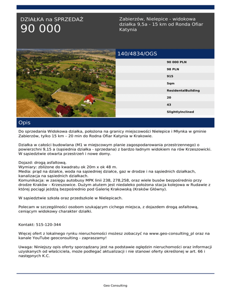 DZIAŁKA na SPRZEDAŻ 90 000 Zabierzów, Nielepice - widokowa działka 9,5a - 15 km od Ronda Ofiar Katynia 140/4834/OGS 90 000 PLN 98 PLN 915 Sqm ResidentalBuilding 20 43 SlightlyInclined Opis Do sprzedania Widokowa działka, położona na granicy miejscowości Nielepice i Młynka w gminie Zabierzów, tylko 15 km – 20 min do Rodna Ofiar Katynia w Krakowie. Działka w całości budowlana (M1 w miejscowym planie zagospodarowania przestrzennego) o powierzchni 9,15 a (sąsiednia działka - sprzedana) z bardzo ładnym widokiem na rów Krzeszowicki. W sąsiedztwie otwarta przestrzeń i nowe domy. Dojazd: drogą asfaltową. Wymiary: zbliżone do kwadratu ok 20m x ok 48 m. Media: prąd na działce, woda na sąsiedniej działce, gaz w drodze i na sąsiednich działkach, kanalizacja na sąsiednich działkach. Komunikacja: w zasięgu autobusy MPK linii 238, 278,258, oraz wiele busów bezpośrednio przy drodze Kraków – Krzeszowice. Dużym atutem jest niedaleko położona stacja kolejowa w Rudawie z której pociągi jeżdżą bezpośrednio pod Galerię Krakowską (Kraków Główny). W sąsiedztwie szkoła oraz przedszkole w Nielepicach. Polecam w szczególności osobom szukającym cichego miejsca, z dojazdem drogą asfaltową, ceniącym widokowy charakter działki. Kontakt: 515-120-344 Więcej ofert z lokalnego rynku nieruchomości możesz zobaczyć na www.geo-consulting_pl oraz na kanale YouTube geoconsulting - zapraszamy! Uwaga: Niniejszy opis oferty sporządzany jest na podstawie oględzin nieruchomości oraz informacji uzyskanych od właściciela, może podlegać aktualizacji i nie stanowi oferty określonej w art. 66 i następnych K.C. Geo Consulting Maciej Trela tel. 515-120-344 email: [email protected] Geo Consulting Powered by TCPDF (www.tcpdf.org)