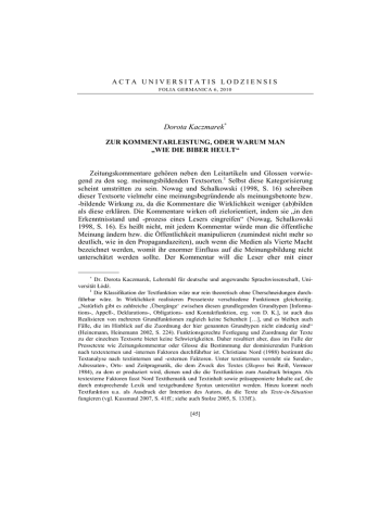 ACTA UNIVERSITATIS LODZIENSIS FOLIA GERMANICA 6, 2010 Dorota Kaczmarek∗ ZUR KOMMENTARLEISTUNG, ODER WARUM MAN „WIE DIE BIBER HEULT“ Zeitungskommentare gehören neben den Leitartikeln und Glossen vorwiegend zu den sog. meinungsbildenden Textsorten.1 Selbst diese Kategorisierung scheint umstritten zu sein. Nowag und Schalkowski (1998, S. 16) schreiben dieser Textsorte vielmehr eine meinungsbegründende als meinungsbetonte bzw. -bildende Wirkung zu, da die Kommentare die Wirklichkeit weniger (ab)bilden als diese erklären. Die Kommentare wirken oft zielorientiert, indem sie „in den Erkenntnisstand und -prozess eines Lesers eingreifen“ (Nowag, Schalkowski 1998, S. 16). Es heißt nicht, mit jedem Kommentar würde man die öffentliche Meinung ändern bzw. die Öffentlichkeit manipulieren (zumindest nicht mehr so deutlich, wie in den Propagandazeiten), auch wenn die Medien als Vierte Macht bezeichnet werden, womit ihr enormer Einfluss auf die Meinungsbildung nicht unterschätzt werden sollte. Der Kommentar will die Leser eher mit einer ∗ Dr. Dorota Kaczmarek, Lehrstuhl für deutsche und angewandte Sprachwissenschaft, Universität Łódź. 1 Die Klassifikation der Textfunktion wäre nur rein theoretisch ohne Überschneidungen durchführbar wäre. In Wirklichkeit realisieren Pressetexte verschiedene Funktionen gleichzeitig. „Natürlich gibt es zahlreiche ‚Übergänge‘ zwischen diesen grundlegenden Grundtypen [Informations-, Appell-, Deklarations-, Obligations- und Kontaktfunktion, erg. von D. K.], ist auch das Realisieren von mehreren Grundfunktionen zugleich keine Seltenheit […], und es bleiben auch Fälle, die im Hinblick auf die Zuordnung der hier genannten Grundtypen nicht eindeutig sind“ (Heinemann, Heinemann 2002, S. 224). Funktionsgerechte Festlegung und Zuordnung der Texte zu der einzelnen Textsorte bietet keine Schwierigkeiten. Daher resultiert aber, dass im Falle der Pressetexte wie Zeitungskommentar oder Glosse die Bestimmung der dominierenden Funktion nach textexternen und -internen Faktoren durchführbar ist. Christiane Nord (1988) bestimmt die Textanalyse nach textinternen und -externen Faktoren. Unter textinternen versteht sie Sender-, Adressaten-, Orts- und Zeitpragmatik, die dem Zweck des Textes (Skopos bei Reiß, Vermeer 1984), zu dem er produziert wird, dienen und die die Textfunktion zum Ausdruck bringen. Als textexterne Faktoren fasst Nord Textthematik und Textinhalt sowie präsupponierte Inhalte auf, die durch entsprechende Lexik und textgebundene Syntax unterstützt werden. Hinzu kommt noch Textfunktion u.a. als Ausdruck der Intention des Autors, da die Texte als Texte-in-Situation fungieren (vgl. Kussmaul 2007, S. 41ff.; siehe auch Stolze 2005, S. 133ff.). [45] 46 Dorota Kaczmarek konkreten Stellungnahme des Autors bzw. der Zeitung konfrontieren,2 die von ihnen mental verarbeitet und in ihrer Gedankenwelt eventuell wahrgenommen bzw. angenommen oder abgelehnt werden kann. Der Kommentar bietet dem Leser somit eine Vorstellung von dem Abschnitt der Wirklichkeit an, die in ihrer Formulierungsart im Idealfall überzeugend und faktenreich sein sollte, um die meinungsbegründende Funktion zu erfüllen (Nowag, Schalkowski 1998, S. 16). Nowag und Schalkowski sprechen nicht vom Überreden, was hier auf ein manipulatives Handeln hinweisen könnte, denn das Überreden bedeutete mehr Täuschung, Meinungssteuerung mit Hilfe von unerlaubten, verdeckten Mitteln (Mikołajczyk 2004, S. 39ff.). Die Überzeugungskraft eines Kommentars liegt in seiner treffsicheren Argumentation, die sich auf greifbare und nachvollziehbare Tatsachenschilderung stützt. Brinker (1997, S. 108f.) platziert die Zeitungskommentare innerhalb der Textsorten mit appellativer Funktion. Bezüglich der politischen Kommentare3 differenziert er ihre Ausrichtung in zweifacher Weise einmal auf den politisch nicht aktiven Leser und einmal auf die sog. politischen Akteure (an die Verantwortlichen), die die Politik repräsentieren. Es ist nicht immer der Fall, dass der Appell, der aus dem Kommentar hervorgeht, in der Tat nur politisch inaktive Rezipienten impliziert und an diese so adressiert ist. Die Textrezipienten, obgleich in der Politik nicht tätig, können bereits eine Vorstellung von dem kommentierten Ereignis bzw. Sachverhalt gewonnen oder die Nachrichtengebung verfolgt haben, und sind darüber ausreichend informiert. Die Textrezipienten brauchen zwar keine politischen Experten zu sein, aber man kann ihnen allein bei ihrer politischen Distanz das Unwissen nicht anlasten. Außer den politikorientierten Lesern werden mit einem Kommentar die politisch Unbewussten angesprochen, denen mit dem bereits erwähnten mentalen Eingreifen neue politische Erfahrungsbereiche geliefert werden. Hinzu kommen natürlich die politisch Verantwortlichen, an deren Gewissen die Autoren implizit appellieren, indem sie bestimmte Verhaltensweisen oder Tendenzen einer medienträchtigen Kritik unterziehen. Die Kommunikation Journalist vs. Leser impliziert hier ein bestimmtes fachliches Ausmaß. Selbstverständlich erfährt der Begriff Fach4 eine gewisse Umdefinition, da es sich bei den Zeitungskommentaren nicht um dasselbe Fachwissen handelt, das in einem Fachmagazin vermittelt wird.5 Fach wird mehr als ein thematischer politischer bzw. gesellschaftlicher Bereich verstanden, aus dem oder zu dem der Autor ursprünglich informatives und dazu 2 Die Autoren repräsentieren nicht selten die Stellungnahme der ganzen Redaktion. Die Zeitungskommentare thematisieren nicht nur politische Ereignisse. Sie greifen außerdem alle anderen Themenbereiche auf, die ‚kommentarbedürftig‘ sein können. 4 Für einen Überblick vergleiche man vertikale und horizontale Konzeptionen bei Hoffmann (1984). Siehe auch Kalverkämper (1998, S. 35). Vgl. auch Burger (2005, S. 337ff.). 5 Zu Techniken der Vermittlung von Fachwissen in der Medienkommunikation vergleiche man Burger (2005, S. 340ff.). 3 Zur Kommentarleistung... 47 auch persuasives Wissen be