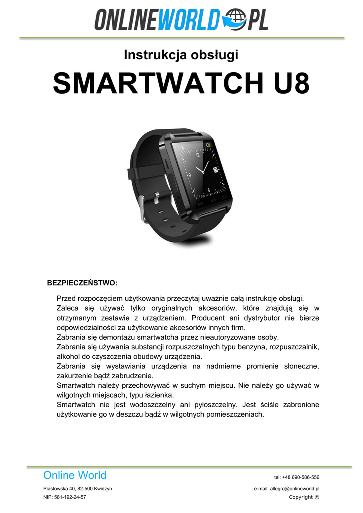 Instrukcja obsługi SMARTWATCH U8 BEZPIECZEŃSTWO: Przed rozpoczęciem użytkowania przeczytaj uważnie całą instrukcję obsługi. Zaleca się używać tylko oryginalnych akcesoriów, które znajdują się w otrzymanym zestawie z urządzeniem. Producent ani dystrybutor nie bierze odpowiedzialności za użytkowanie akcesoriów innych firm. Zabrania się demontażu smartwatcha przez nieautoryzowane osoby. Zabrania się używania substancji rozpuszczalnych typu benzyna, rozpuszczalnik, alkohol do czyszczenia obudowy urządzenia. Zabrania się wystawiania urządzenia na nadmierne promienie słoneczne, zakurzenie bądź zabrudzenie. Smartwatch należy przechowywać w suchym miejscu. Nie należy go używać w wilgotnych miejscach, typu łazienka. Smartwatch nie jest wodoszczelny ani pyłoszczelny. Jest ściśle zabronione użytkowanie go w deszczu bądź w wilgotnych pomieszczeniach. Online World Piastowska 40, 82-500 Kwidzyn NIP: 581-192-24-57 tel: +48 690-586-556 e-mail: [email protected] Copyright © 1. WPROWADZENIE 1.1 Przyciski i złącza 1. Głośnik 2. Gniazdo USB 3. Mikrofon 4. Przycisk ON/OFF/HOME 5. Przyciski dotykowe: a) Zatwierdź/odbierz b) Dalej/wybierz numer c) Powrót/odłącz 2. FUNKCJE SMARTWATCH’a SMARTWATCH U8 jest inteligentym zegarkiem wyposażonym w modół Bluetooth w celu synchronizacji z telefonem (iOS, Android). Zegarek przy współpracy z dedykowaną aplikacją ma możliwość m.in. odbierania/wykonywania połączeń z funkcją głosową, odbierania wiadomości SMS, odbierania wszystkich wiadomości PUSH. Przy jego pomocy można zdalnie sterować odtwarzaczem muzyki oraz uruchamiać i wykonywać zdjęcia smartfonem. Ponadto posiada również szereg przydatnych dodatków takich jak stoper, kalendarz, alarm, barometr, monitor snu, wysokościomierz jak i krokomierz. Na telefonach z systemem android można synchronizować wiadomości SMS, E-mail, Facebook, Skype i Twitter. Online World Piastowska 40, 82-500 Kwidzyn NIP: 581-192-24-57 tel: +48 690-586-556 e-mail: [email protected] Copyright © 3 USTAWIENIA 3.1 Bluetooth Option Instructions Power Włącza/Wyłącza Bluetooth Visibility Włączenie/Wyłączenie widoczności urządzenia My device Umożliwia zmianę nazwy urządzenia 3.2 Przywracanie ustawień fabrycznych Ustawienia fabryczne można przywrócić poprzez wciśnięcie przycisku RESET znajdującego się na odwrocie urządzenia. Przycisk ten jest schowany w dziurce na tylnej klapce zegarka. W menu zegarka w ustawieniach również znajduje się opcja lekkie resetu. 3.3. Zmiana ustawień języka, wyświetlacza, daty i czasu Z menu zegarka należy wybrać ikonę ‘Ustawienia’, a następnie wybraną zakładkę, w której mają zostać zmienione parametry. 3.3 Instalacja aplikacji Bluetooth na smartfonie 1: Aby aplikacja działała poprawnie musi zostać zainstalowana przed połączeniem się ze Smartwatch’em 2: Aplikację można zainstalować na dwa sposoby. a) Z menu zegarka należy wybrać ikonkę ‘Ustawienia’, a następnie ‘APK’ i przy pomocy aplikacji do skanowania kodów QR zeskanować kod z zegarka. Po rozpoznaniu kodu telefon wyświetli zapytanie o zgodę na instalację dedykowanego oprogramowania. b) Pobrać z oficjalnego sklepu Google Play Store. Aby to zrobić zaloguj się do sklepu Google i wyszukaj aplikację „SmartWear” lub „BTNotification”. Następnie zainstaluj ją. Online World Piastowska 40, 82-500 Kwidzyn NIP: 581-192-24-57 tel: +48 690-586-556 e-mail: [email protected] Copyright © Po zainstalowaniu aplikacji należy sparować telefon ze Smartwatch’em przez łącze bluetooth: 1. wyszukaj sprzęt, a następnie połącz się z zegarkiem 2. smartphone wyśle wiadomość "Żądanie nawiązania połączenia Bluetooth", 3. naciśnij przycisk "Potwierdź". 4. po nawiązaniu połączenia zegarek wyświetli komunikat "Połączono", 5. Po 5 sekundach zegarek wyświetli komunikat "Synchronizacja daty i czasu z telefonem" 6. jeśli operacja zostanie zakończona powodzeniem, ikona ‘słuchawki ’ w zegarku oznacza udane połączenie ze smartphonem. Interfejs aplikacji BTNotification: Online World Piastowska 40, 82-500 Kwidzyn NIP: 581-192-24-57 tel: +48 690-586-556 e-mail: [email protected] Copyright © *Możesz kliknąć na danej usługi. aby zatwierdzić bądź zabronić przesyłania powiadomień dla 3: Kliknij “Accessibility settings”. Następnie zatwierdź przyznanie zezwoleń dla aplikacji BTNotification dla przesyłania powiadomień na zegarek. 4. Kliknij “Notification APP” by wybrać aplikacje, które będą miały prawa do przesyłania powiadomień na zegarek: Online World Piastowska 40, 82-500 Kwidzyn NIP: 581-192-24-57 tel: +48 690-586-556 e-mail: [email protected] Copyright © Online World Marcin Szymeczko Piastowska 40 82-500 Kwidzyn TEL: 690-586-556 Online World Piastowska 40, 82-500 Kwidzyn NIP: 581-192-24-57 tel: +48 690-586-556 e-mail: [email protected] Copyright ©