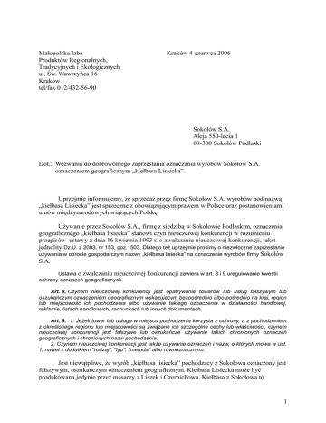 Małopolska Izba Produktów Regionalnych, Tradycyjnych i Ekologicznych ul. Św. Wawrzyńca 16 Kraków tel/fax 012/432-56-90 Kraków 4 czerwca 2006 Sokołów S.A. Aleja 550-lecia 1 08-300 Sokołów Podlaski Dot.: Wezwania do dobrowolnego zaprzestania oznaczania wyrobów Sokołów S.A. oznaczeniem geograficznym „kiełbasa Lisiecka” Uprzejmie informujemy, że sprzedaż przez firmę Sokołów S.A. wyrobów pod nazwą „kiełbasa Lisiecka” jest sprzeczne z obowiązującym prawem w Polsce oraz postanowieniami umów międzynarodowych wiążących Polskę. Używanie przez Sokołów S.A., firmę z siedzibą w Sokołowie Podlaskim, oznaczenia geograficznego „kiełbasa lisiecka” stanowi czyn nieuczciwej konkurencji w rozumieniu przepisów ustawy z dnia 16 kwietnia 1993 r. o zwalczaniu nieuczciwej konkurencji, tekst jednolity Dz.U. z 2003, nr 153, poz.1503. Dlatego też uprzejmie prosimy o niezwłoczne zaprzestanie używania w obrocie gospodarczym nazwy „kiełbasa lisiecka” na oznaczenie wyrobów firmy Sokołów S.A. Ustawa o zwalczaniu nieuczciwej konkurencji zawiera w art. 8 i 9 uregulowanie kwestii ochrony oznaczeń geograficznych. Art. 8. Czynem nieuczciwej konkurencji jest opatrywanie towarów lub usług fałszywym lub oszukańczym oznaczeniem geograficznym wskazującym bezpośrednio albo pośrednio na kraj, region lub miejscowość ich pochodzenia albo używanie takiego oznaczenia w działalności handlowej, reklamie, listach handlowych, rachunkach lub innych dokumentach. Art. 9. 1. Jeżeli towar lub usługa w miejscu pochodzenia korzysta z ochrony, a z pochodzeniem z określonego regionu lub miejscowości są związane ich szczególne cechy lub właściwości, czynem nieuczciwej konkurencji jest fałszywe lub oszukańcze używanie takich chronionych oznaczeń geograficznych i chronionych nazw pochodzenia. 2. Czynem nieuczciwej konkurencji jest także używanie oznaczeń i nazw, o których mowa w ust. 1, nawet z dodatkiem "rodzaj", "typ", "metoda" albo równoznacznym. Jest niewątpliwe, że wyrób „kiełbasa lisiecka” pochodzący z Sokołowa oznaczony jest fałszywym, oszukańczym oznaczeniem geograficznym. Kiełbasa Lisiecka może być produkowana jedynie przez masarzy z Liszek i Czernichowa. Kiełbasa z Sokołowa to 1 „kiełbasa sokołowska”, a nie „kiełbasa lisiecka”. Używanie nazwy „kiełbasa lisiecka” dla kiełbasy z Sokołowa Podlaskiego stanowi próbę wykorzystania renomy „kiełbasy Lisieckiej” budowanej przez ponad 70 lat przez masarzy z okolic Liszek i Czernichowa. Wyodrębnienie się kiełbasy lisieckiej wynikało z unikalnej receptury jej przygotowania stosowanej przez masarzy z okolic Liszek i Czernichowa. To właśnie ta receptura, utrzymywana w tajemnicy, stanowiła i stanowi o walorach smakowych i jakości Kiełbasy lisieckiej. A jakość ta była poszukiwana, bo konsument szukał kiełbasy z Liszek, kiełbasy lisieckiej. Na straży przestrzegania tradycyjnej receptury produkcji i zgodności z prawem używania nazwy „kiełbasa lisiecka” stoją masarze z Liszek i Czernichowa /ziemia lisiecka/. Dlatego też pojawienie się na rynku wyrobu „kiełbasa lisiecka” z Sołowa podlaskiego stanowi czyn nieuczciwej konkurencji firmy Sokołów S.A. wobec producentów kiełbasy z okolic Liszek i Czernichowa. Popełnienie czynu nieuczciwej konkurencji stanowi podstawę do wystąpienia na drogę sądową z roszczeniami na podstawie przypisów ustawy o zwalczaniu nieuczciwej konkurencji. Kwestię tę regulują następujące przepisy: Art. 18. 1. W razie dokonania czynu nieuczciwej konkurencji, przedsiębiorca, którego interes został zagrożony lub naruszony, może żądać: 1) zaniechania niedozwolonych działań; 2) usunięcia skutków niedozwolonych działań; 3) złożenia jednokrotnego lub wielokrotnego oświadczenia odpowiedniej treści i w odpowiedniej formie; 4) naprawienia wyrządzonej szkody, na zasadach ogólnych; 5) wydania bezpodstawnie uzyskanych korzyści, na zasadach ogólnych; 6) zasądzenia odpowiedniej sumy pieniężnej na określony cel społeczny związany ze wspieraniem kultury polskiej lub ochroną dziedzictwa narodowego - jeżeli czyn nieuczciwej konkurencji był zawiniony. 2. Sąd, na wniosek uprawnionego, może orzec również o wyrobach, ich opakowaniach, materiałach reklamowych i innych przedmiotach bezpośrednio związanych z popełnieniem czynu nieuczciwej konkurencji. W szczególności sąd może orzec ich zniszczenie lub zaliczenie na poczet odszkodowania. Art. 18a. Ciężar dowodu prawdziwości oznaczeń lub informacji umieszczanych na towarach albo ich opakowaniach lub wypowiedzi zawartych w reklamie spoczywa na osobie, której zarzuca się czyn nieuczciwej konkurencji związany z wprowadzeniem w błąd. Art. 19. 1. Z roszczeniami wymienionymi w art. 18 ust. 1 pkt 1-3 i 6 mogą wystąpić: 1) (skreślony); 2) krajowa lub regionalna organizacja, której celem statutowym jest ochrona interesów przedsiębiorców; 3) Prezes Urzędu Ochrony Konkurencji i Konsumentów, jeżeli czyn nieuczciwej konkurencji zagraża lub narusza interesy konsumentów; 4) (skreślony). W chwili obecnej oznaczenie geograficzne „kiełbasa lisiecka” podlega ochronie na podstawie art. 8 ustawy o zwalczaniu nieuczciwej konkurencji. Jednakże w dniu 29 listopada 2005 r. w Ministerstwie Rolnictwa i Rozwoju Wsi został złożony wniosek o rejestrację nazwy "kiełbasa lisiecka" jako Chronionego Oznaczenia Geograficzne zgodnie z Rozporządzenie Rady (EWG) nr 2081/92. Ministerstwo Rolnictwa i Rozwoju Wsi stwierdziło, że wniosek ten spełnia wymogi formalne i w dniu 2 grudnia 2005 r. został wpisany do rejestru wewnętrznego wniosków rejestrowanych pod nr: 1/2005/ChOG. Z chwilą uzyskania rejestracji jako Chronione Oznaczenie Geograficzne zgodnie z Rozporządzeniem Rady (EWG) nr 2081/92 ochrona oznaczenia geograficznego „kiełbasa 2 Lisiecka” ulegnie wzmocnieniu, będzie ona skuteczna nie tylko w Polsce, jak i w całej Unii Europejskiej. Ma