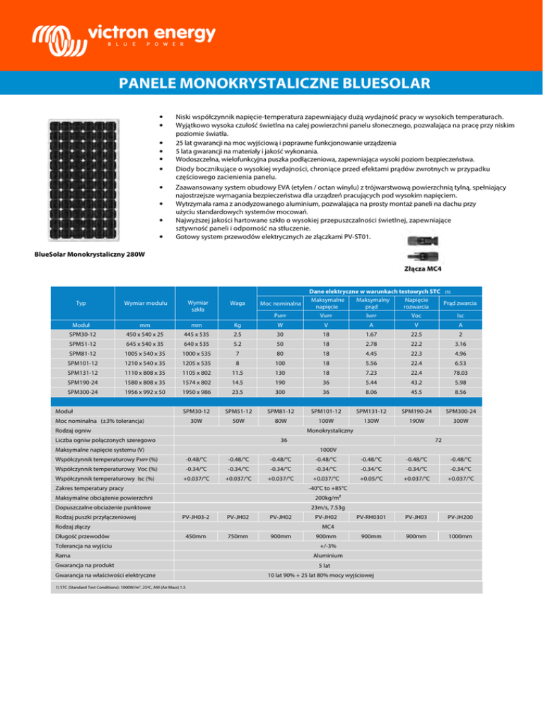 BlueSolar Monocrystalline Panels www.victronenergy.com PANELE MONOKRYSTALICZNE BLUesolAr • • • • • • • • • • Niski współczynnik napięcie-temperatura zapewniający dużą wydajność pracy w wysokich temperaturach. Wyjątkowo wysoka czułość świetlna na całej powierzchni panelu słonecznego, pozwalająca na pracę przy niskim poziomie światła. 25 lat gwarancji na moc wyjściową i poprawne funkcjonowanie urządzenia 5 lata gwarancji na materiały i jakość wykonania. Wodoszczelna, wielofunkcyjna puszka podłączeniowa, zapewniająca wysoki poziom bezpieczeństwa. Diody bocznikujące o wysokiej wydajności, chroniące przed efektami prądów zwrotnych w przypadku częściowego zacienienia panelu. Zaawansowany system obudowy EVA (etylen / octan winylu) z trójwarstwową powierzchnią tylną, spełniający najostrzejsze wymagania bezpieczeństwa dla urządzeń pracujących pod wysokim napięciem. Wytrzymała rama z anodyzowanego aluminium, pozwalająca na prosty montaż paneli na dachu przy użyciu standardowych systemów mocowań. Najwyższej jakości hartowane szkło o wysokiej przepuszczalności świetlnej, zapewniające sztywność paneli i odporność na stłuczenie. Gotowy system przewodów elektrycznych ze złączkami PV-ST01. BlueSolar Monokrystaliczny 280W Złącza MC4 Dane elektryczne w warunkach testowych STC (1) Maksymalne Maksymalny Napięcie Prąd zwarcia rozwarcia napięcie prąd Typ Wymiar modułu Wymiar szkła Waga PMPP VMPP IMPP Voc Isc Moduł mm mm Kg W V A V A SPM30-12 450 x 540 x 25 445 x 535 2.5 30 18 1.67 22.5 2 SPM51-12 645 x 540 x 35 640 x 535 5.2 50 18 2.78 22.2 3.16 4.96 Moc nominalna SPM81-12 1005 x 540 x 35 1000 x 535 7 80 18 4.45 22.3 SPM101-12 1210 x 540 x 35 1205 x 535 8 100 18 5.56 22.4 6.53 SPM131-12 1110 x 808 x 35 1105 x 802 11.5 130 18 7.23 22.4 78.03 SPM190-24 1580 x 808 x 35 1574 x 802 14.5 190 36 5.44 43.2 5.98 SPM300-24 1956 x 992 x 50 1950 x 986 23.5 300 36 8.06 45.5 8.56 SPM30-12 SPM51-12 SPM81-12 SPM101-12 SPM131-12 SPM190-24 SPM300-24 30W 50W 80W 100W 130W 190W 300W Moduł Moc nominalna (±3% tolerancja) Rodzaj ogniw Monokrystaliczny Liczba ogniw połączonych szeregowo 36 Maksymalne napięcie systemu (V) 72 1000V Współczynnik temperaturowy PMPP (%) -0.48/°C -0.48/°C -0.48/°C -0.48/°C -0.48/°C -0.48/°C Współczynnik temperaturowy Voc (%) -0.34/°C -0.34/°C -0.34/°C -0.34/°C -0.34/°C -0.34/°C -0.34/°C Współczynnik temperaturowy Isc (%) +0.037/°C +0.037/°C +0.037/°C +0.037/°C +0.05/°C +0.037/°C +0.037/°C PV-RH0301 PV-JH03 PV-JH200 900mm 900mm 1000mm Zakres temperatury pracy -40°C to +85°C Maksymalne obciążenie powierzchni 200kg/m² Dopuszczalne obciażenie punktowe 23m/s, 7.53g Rodzaj puszki przyłączeniowej -0.48/°C PV-JH03-2 PV-JH02 PV-JH02 Rodzaj złączy Długość przewodów PV-JH02 MC4 450mm Tolerancja na wyjściu Rama Gwarancja na produkt Gwarancja na właściwości elektryczne 1) STC (Standard Test Conditions): 1000W/m2, 25ºC, AM (Air Mass) 1.5 Victron Energy B.V. | De Paal 35 | 1351 JG Almere | The Netherlands General phone: +31 (0)36 535 97 00 | Fax: +31 (0)36 535 97 40 E-mail: [email protected] | www.victronenergy.com 750mm 900mm 900mm +/-3% Aluminium 5 lat 10 lat 90% + 25 lat 80% mocy wyjściowej BlueSolar Polycrystalline Panels www.victronenergy.com PANELE POLIKRYSTALICZNE bluesolAr • • • • • • • • • • Niski współczynnik napięcie-temperatura zapewniający dużą wydajność pracy w wysokich temperaturach. Wyjątkowo wysoka czułość świetlna na całej powierzchni panelu słonecznego, pozwalająca na pracę przy niskim poziomie światła. 25 lat gwarancji na moc wyjściową i poprawne funkcjonowanie urządzenia 5 lata gwarancji na materiały i jakość wykonania. Wodoszczelna, wielofunkcyjna puszka podłączeniowa, zapewniająca wysoki poziom bezpieczeństwa. Diody bocznikujące o wysokiej wydajności, chroniące przed efektami prądów zwrotnych w przypadku częściowego zacienienia panelu. Zaawansowany system obudowy EVA (etylen / octan winylu) z trójwarstwową powierzchnią tylną, spełniający najostrzejsze wymagania bezpieczeństwa dla urządzeń pracujących pod wysokim napięciem. Wytrzymała rama z anodyzowanego aluminium, pozwalająca na prosty montaż paneli na dachu przy użyciu standardowych systemów mocowań. Najwyższej jakości hartowane szkło o wysokiej przepuszczalności świetlnej, zapewniające sztywność paneli i odporność na stłuczenie. Gotowy system przewodów elektrycznych ze złączkami PV-ST01. BlueSolar Polikrystaliczny 130W Złącze MC4 Typ Wymiar modułu Wymiar szkła Waga Moc nominalna PMPP Dane elektryczne w warunkach testowych STC (1) Maksymalne Maksymalny Napięcie Prąd zwarcia rozwarcia napięcie prąd VMPP IMPP Voc Moduł mm mm Kg W V A V A SPP30-12 735x350x25 730x345 5.2 30 18 1.72 22.5 1.85 SPP51-12 540x670x35 535x665 5.3 50 18 2.85 22.2 3.09 SPP81-12 915x670x35 910x665 8 80 18 4.6 21.6 5.06 SPP101-12 1005x670x35 1000x665 9 100 18 5.75 21.6 6.32 SPP140-12 1480x670x35 1474x664 12.5 140 18 8.05 21.6 8.85 SPP280-24 1956x992x50 1950x986 24 280 36 7.7 44.06 8.26 Moduł Moc nominalna (±3% tolerancja) Isc SPP30-12 SPP51-12 SPP81-12 SPP101-12 SPP140-12 SPP280-24 30W 50W 80W 100W 140W 280W Polikrystaliczne Rodzaj ogniw Liczba ogniw połączonych szeregowo 36 Maksymalne napięcie systemu (V) 72 1000V Współczynnik temperaturowy PMPP (%) -0.47/°C -0.48/°C -0.48/°C -0.48/°C -0.48/°C Współczynnik temperaturowy Voc (%) -0.34/°C -0.34/°C -0.34/°C -0.34/°C -0.35/°C -0.34/°C Współczynnik temperaturowy Isc (%) +0.045/°C +0.037/°C +0.037/°C +0.037/°C +0.037/°C +0.045/°C PV-JH02 PV-JH200 Zakres temperatury pracy -40°C to +85°C Maksymalne obciążenie powierzchni 200kg/m² Dopuszczalne obciażenie punktowe 23m/s, 7.53g Rodzaj puszki przyłączeniowej PV-JH03-2 PV-JH02 Rodzaj złączy Długość przewodów -0.47/°C PV-JH02 PV-JH02 MC4 450mm Tolerancja na wyjściu Rama Gwarancja na produkt Gwarancja na wł