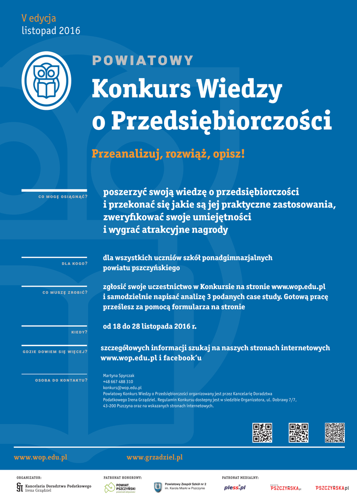 V edycja listopad 2016 P O W IATO WY Konkurs Wiedzy o Przedsiębiorczości Przeanalizuj, rozwiąż, opisz! C O MOG ę OS I Ą G N Ą Ć ? D L A KO G O ? C O MU SZĘ Z RO B I Ć ? KIEDY? G D ZIE DOW I e M SI Ę W I Ę C E J ? osoba do kontak tu ? www.wop.edu.pl ORGANIZATOR: poszerzyć swoją wiedzę o przedsiębiorczości i przekonać się jakie są jej praktyczne zastosowania, zweryfikować swoje umiejętności i wygrać atrakcyjne nagrody dla wszystkich uczniów szkół ponadgimnazjalnych powiatu pszczyńskiego zgłosić swoje uczestnictwo w Konkursie na stronie www.wop.edu.pl i samodzielnie napisać analizę 3 podanych case study. Gotową pracę prześlesz za pomocą formularza na stronie od 18 do 28 listopada 2016 r. szczegółowych informacji szukaj na naszych stronach internetowych www.wop.edu.pl i facebook’u Martyna Spyrczak +48 667 488 310 [email protected] Powiatowy Konkurs Wiedzy o Przedsiębiorczości organizowany jest przez Kancelarię Doradztwa Podatkowego Irena Grządziel. Regulamin Konkursu dostepny jest w siedzibie Organizatora, ul. Dobrawy 7/7, 43-200 Pszczyna oraz na wskazanych stronach internetowych. www.grzadziel.pl PATRONAT HONOROWY: PATRONAT MEDIALN Y: Powiatowy Zespół Szkół nr 2 im. Karola Miarki w Pszczynie
