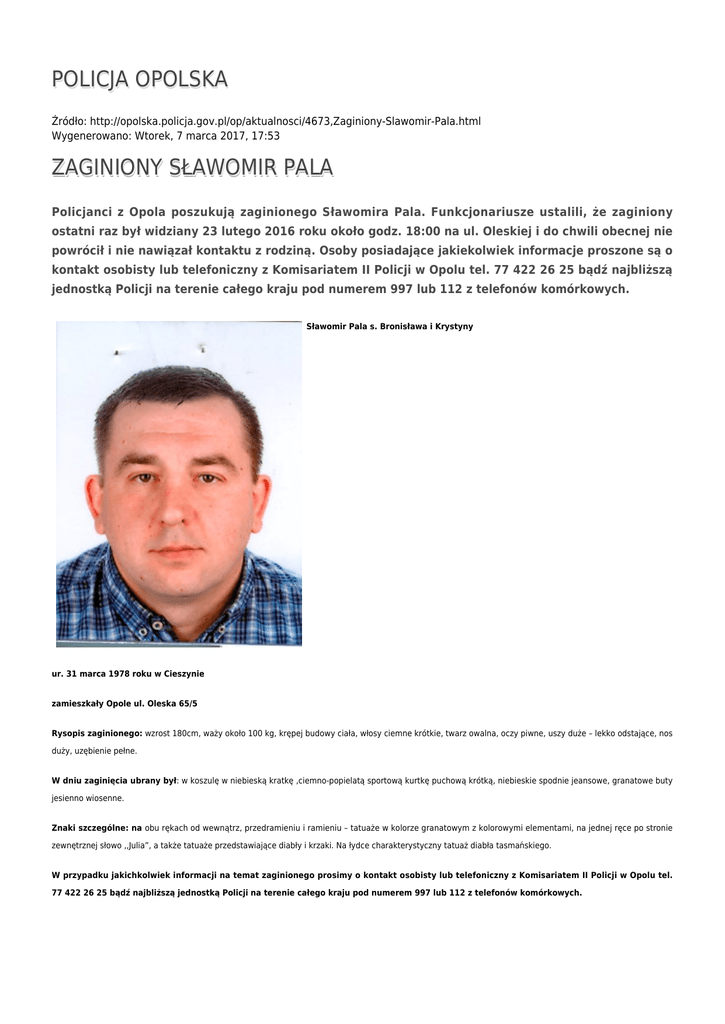 POLICJA OPOLSKA Źródło: http://opolska.policja.gov.pl/op/aktualnosci/4673,Zaginiony-Slawomir-Pala.html Wygenerowano: Wtorek, 7 marca 2017, 17:53 ZAGINIONY SŁAWOMIR PALA Policjanci z Opola poszukują zaginionego Sławomira Pala. Funkcjonariusze ustalili, że zaginiony ostatni raz był widziany 23 lutego 2016 roku około godz. 18:00 na ul. Oleskiej i do chwili obecnej nie powrócił i nie nawiązał kontaktu z rodziną. Osoby posiadające jakiekolwiek informacje proszone są o kontakt osobisty lub telefoniczny z Komisariatem II Policji w Opolu tel. 77 422 26 25 bądź najbliższą jednostką Policji na terenie całego kraju pod numerem 997 lub 112 z telefonów komórkowych. Sławomir Pala s. Bronisława i Krystyny ur. 31 marca 1978 roku w Cieszynie zamieszkały Opole ul. Oleska 65/5 Rysopis zaginionego: wzrost 180cm, waży około 100 kg, krępej budowy ciała, włosy ciemne krótkie, twarz owalna, oczy piwne, uszy duże – lekko odstające, nos duży, uzębienie pełne. W dniu zaginięcia ubrany był: w koszulę w niebieską kratkę ,ciemno-popielatą sportową kurtkę puchową krótką, niebieskie spodnie jeansowe, granatowe buty jesienno wiosenne. Znaki szczególne: na obu rękach od wewnątrz, przedramieniu i ramieniu – tatuaże w kolorze granatowym z kolorowymi elementami, na jednej ręce po stronie zewnętrznej słowo ,,Julia”, a także tatuaże przedstawiające diabły i krzaki. Na łydce charakterystyczny tatuaż diabła tasmańskiego. W przypadku jakichkolwiek informacji na temat zaginionego prosimy o kontakt osobisty lub telefoniczny z Komisariatem II Policji w Opolu tel. 77 422 26 25 bądź najbliższą jednostką Policji na terenie całego kraju pod numerem 997 lub 112 z telefonów komórkowych. Ocena: 0/5 (0) Tweetnij zaginiony, poszukiwania