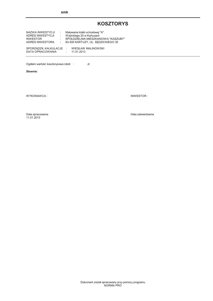 kosztorys - Spółdzielnia Mieszkaniowa Kaszuby