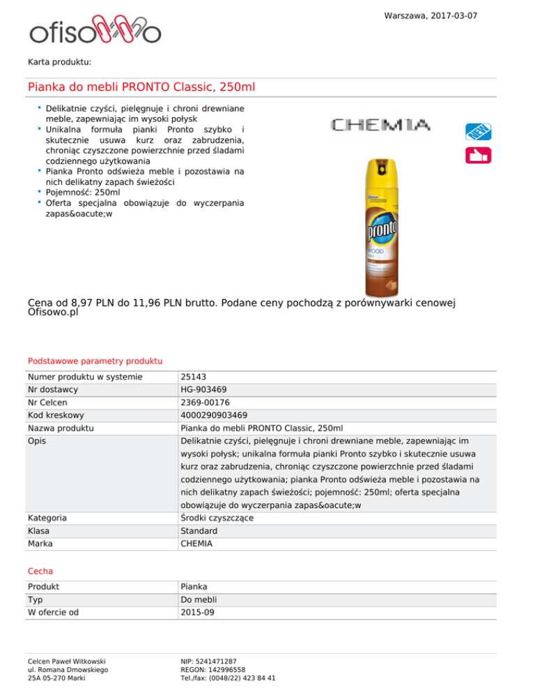 Warszawa, 2017-03-07 Karta produktu: Pianka do mebli PRONTO Classic, 250ml Delikatnie czyści, pielęgnuje i chroni drewniane meble, zapewniając im wysoki połysk Unikalna formuła pianki Pronto szybko i skutecznie usuwa kurz oraz zabrudzenia, chroniąc czyszczone powierzchnie przed śladami codziennego użytkowania Pianka Pronto odświeża meble i pozostawia na nich delikatny zapach świeżości Pojemność: 250ml Oferta specjalna obowiązuje do wyczerpania zapasów Cena od 8,97 PLN do 11,96 PLN brutto. Podane ceny pochodzą z porównywarki cenowej Ofisowo.pl Podstawowe parametry produktu Numer produktu w systemie 25143 Nr dostawcy HG-903469 Nr Celcen 2369-00176 Kod kreskowy 4000290903469 Nazwa produktu Pianka do mebli PRONTO Classic, 250ml Opis Delikatnie czyści, pielęgnuje i chroni drewniane meble, zapewniając im wysoki połysk; unikalna formuła pianki Pronto szybko i skutecznie usuwa kurz oraz zabrudzenia, chroniąc czyszczone powierzchnie przed śladami codziennego użytkowania; pianka Pronto odświeża meble i pozostawia na nich delikatny zapach świeżości; pojemność: 250ml; oferta specjalna obowiązuje do wyczerpania zapasów Kategoria Środki czyszczące Klasa Standard Marka CHEMIA Cecha Produkt Pianka Typ Do mebli W ofercie od 2015-09 Celcen Paweł Witkowski ul. Romana Dmowskiego 25A 05-270 Marki NIP: 5241471287 REGON: 142996558 Tel./fax: (0048/22) 423 84 41 Warszawa, 2017-03-07 Karta katalogowa produktu cd. Pianka do mebli PRONTO Classic, 250ml Wymiary Pojemność (ml) 250 Certyfikaty Hit Hit Nowy produkt w ofercie Standard Wspólny słownik zamówień CPV 39830000-9 Serdecznie zapraszamy do współpracy zespół. Ofisowo.pl Celcen Paweł Witkowski ul. Romana Dmowskiego 25A 05-270 Marki NIP: 5241471287 REGON: 142996558 Tel./fax: (0048/22) 423 84 41