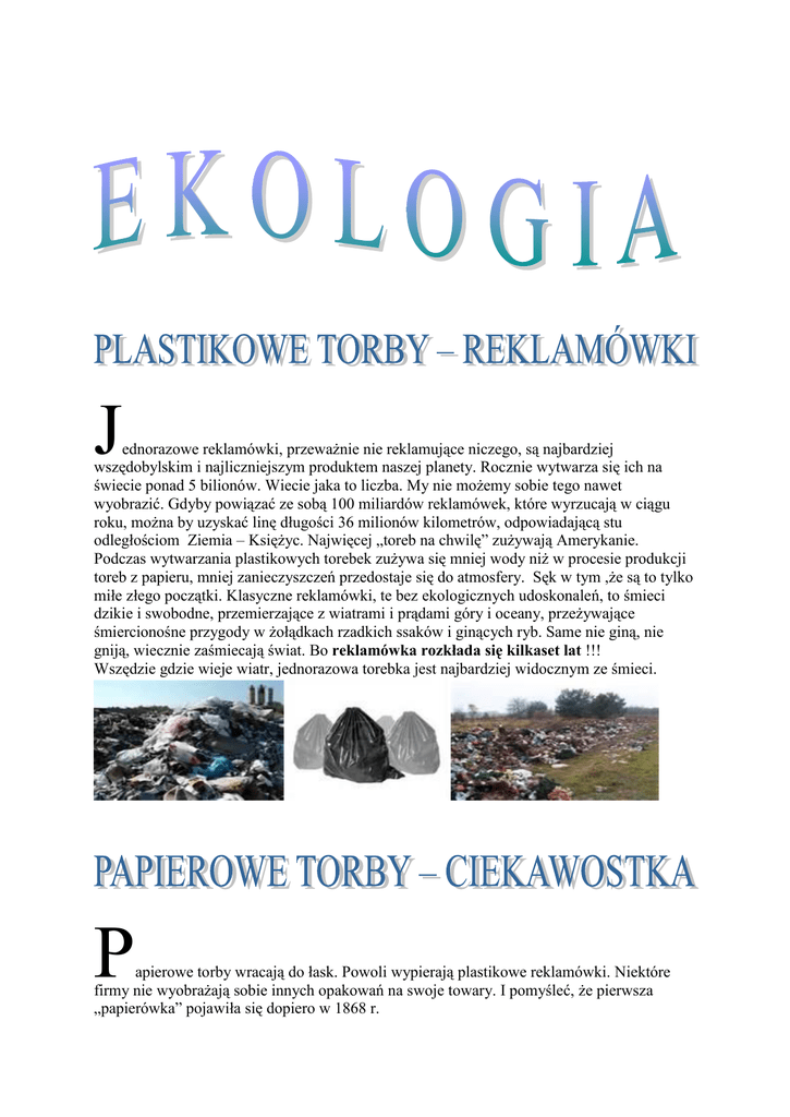 J ednorazowe reklamówki, przeważnie nie reklamujące niczego, są najbardziej wszędobylskim i najliczniejszym produktem naszej planety. Rocznie wytwarza się ich na świecie ponad 5 bilionów. Wiecie jaka to liczba. My nie możemy sobie tego nawet wyobrazić. Gdyby powiązać ze sobą 100 miliardów reklamówek, które wyrzucają w ciągu roku, można by uzyskać linę długości 36 milionów kilometrów, odpowiadającą stu odległościom Ziemia – Księżyc. Najwięcej „toreb na chwilę” zużywają Amerykanie. Podczas wytwarzania plastikowych torebek zużywa się mniej wody niż w procesie produkcji toreb z papieru, mniej zanieczyszczeń przedostaje się do atmosfery. Sęk w tym ,że są to tylko miłe złego początki. Klasyczne reklamówki, te bez ekologicznych udoskonaleń, to śmieci dzikie i swobodne, przemierzające z wiatrami i prądami góry i oceany, przeżywające śmiercionośne przygody w żołądkach rzadkich ssaków i ginących ryb. Same nie giną, nie gniją, wiecznie zaśmiecają świat. Bo reklamówka rozkłada się kilkaset lat !!! Wszędzie gdzie wieje wiatr, jednorazowa torebka jest najbardziej widocznym ze śmieci. P apierowe torby wracają do łask. Powoli wypierają plastikowe reklamówki. Niektóre firmy nie wyobrażają sobie innych opakowań na swoje towary. I pomyśleć, że pierwsza „papierówka” pojawiła się dopiero w 1868 r. Najpierw był papier. Zwykły, najzwyklejszy. Owijano w niego produkty kupowane w sklepach. Potem ktoś, dziś już nie wiadomo kto, wpadł na pomysł, żeby z papieru robić rulony – tutki ( do dziś używane w Niemczech np. do pakowania cukierków ). Upychało się w nie wszystko, co upchnąć się dało. I tak było aż do czasu Margaret Knight, pomysłowej amerykańskiej nastolatki. Dziewczyna pracowała w fabryce papieru i zamiast spotykać się z rówieśnikami, wolała zabawę z papierem. Marzeniem Margaret było wynalezienie torby, która mogłaby stać. Margaret, korzystając z finansowej pomocy rodziny, utworzyła własną firmę - EASTERN PAPER BAG COMPANY. Firma istnieje do dziś i wciąż wytwarza papierowe opakowania, z różnymi rodzajami dna”. Stojące torby przeznaczone są na poszczególne produkty: na przykład na owoce, pieczywo, a każdy rodzaj był z innego papieru i inaczej klejony. Króliczek i Myszka P ojemnik koloru niebieskiego: papier, czyli gazety, czasopisma, torebki papierowe, książki w miękkich okładkach, papier pakowy, kartony, tekturę oraz papier szkolny i biurowy. Czego nie powinniśmy wrzucać: artykułów higienicznych typu pampers, brudnego i tłustego papieru, kartonów po mleku i napojach, worków po cemencie oraz tapet. Należy przy wrzucaniu papieru pamiętać o tym, że przed wrzuceniem należy usunąć zszywki, folię oraz plastikowe opakowania. P ojemnik koloru żółtego: butelki po napojach i płynach do mycia, plastikowe reklamówki, woreczki, korki od butelek a także metalowe kapsle, puszki po napojach i konserwach a także drobny złom. Nie powinno się znaleźć w tym koszu takich rzeczy: opakowań po lekach, styropianu, zabawek, sprzętu AGD, butelek po olejach, butelek i pojemników z zawartością inną niż plastikowa, baterii oraz opakowań po aerozolach. Przed wrzuceniem również należy pamiętać o tym, że butelki i puszki gnieciemy, żeby zajmowały mniej miejsca oraz żeby wrzucać czyste opakowania. K osze na szkło są dwa: zielony i biały. Białe są do szkła białego, a zielone do kolorowego. Do obu tych pojemników wrzucamy butelki i słoiki po napojach, alkoholach i żywności a także szklane butelki po kosmetykach. A czego nie wrzucamy? Porcelany i ceramiki, żarówek wszelkiego rodzaju, szkła okiennego, luster, ekranów i lamp telewizyjnych oraz szkła z okularów Pamiętajmy przed wrzucaniem, aby nie tłuc wrzucanych przedmiotów oraz o tym aby były one czyste Słodka żaba
