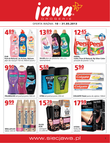 OFERTA WAŻNA: 10 – 31.05.2013 489 1389 1245 PUR Pure & Natural, 3x Action, Balsam płyn do naczyń 750 ml, 900ml (asort.) SILAN płyn do płukania 1,8 L, 2 L (asortyment) PERSIL Color, Pure & Natural, By Silan Color proszek do prania 1,2 kg 990 559 PALMOLIVE żel pod prysznic 500 ml STR8 żel pod prysznic 250 ml 590 COLGATE Total pasta do zębów 100ml 999 1579 1799 WELLAFLEX lakier 250 ml GLISS KUR szampon 2 x 250 ml SYOSS farba do włosów www.siecjawa.pl 1 449 1039 MARION Natura Styl farba do włosów LONDA farba do włosów 559 749 589 MARION Termoochrona do włosów: mleczko 150 ml, serum 30 ml, mgiełka 130 ml, spray 130 ml 499 749 499 2699 2399 LADY SPEED STICK dezodoranty ALEXANDER OF PARIS deo damski 150 ml RIMMEL Wake Me Up podkład 845 1049 249 3545 499 AA Technologia Wieku maseczka 10 ml LOREAL Revitalift Laser 3 krem na dzień 50ml, pod oczy 15 ml, serum 30 ml CELIA Kolagen krem 50 ml 1199 659 RIMMEL Match Perfection podkład 1399 RIMMEL Stay Matte podkład JOANNA Rzepa szampon 200 ml (dostępna również odżywka) NIVEA szampon 250 ml, odżywka 200 ml SALON Professional lakier 265 ml, pianka 225 ml DOVE deo spray 150 ml (asortyment) NIVEA Pure Effect kremy, żele do mycia twarzy, tonik 399 699 699 499 399 1299 LUKSJA Creamy, Fruity mydło w płynie dozownik 450 ml LUKSJA płyn do kąpieli 1L NIVEA żele pod prysznic damskie / męskie 250 ml OB tampony a’8 AQUAFRESH In Between, Clean & Flex szczoteczka do zębów LISTERINE płyn do jamy ustnej 500 ml 155 169 549 3599 289 1499 1499 949 VEET plastry do depilacji z woskiem a’10, a’12 SCHOLL Odour Control do butów oraz do stóp 150 ml GILLETTE Mach 3 wkład a’1 NIVEA mydło w kostce 90 g 2 BOBAS mydło 100 g PAMPERS chusteczki a’56, a’64 BELLA Happy pieluszki a’46, a’54, a’64 DISCREET wkładki higieniczne a’16, a’20 SENSODYNE Proszkliwo pasta do zębów 75 ml BLEND-A-MED 3D White, Complete7, pasta do zębów 100 ml 3 789 589 669 599 DOSIA proszek do prania do białego, do koloru 1,5 kg ARIEL proszek do prania 400 g KOMFORT, ALGA płyn do prania ręcznego 1 L GLOBAL Sofin koncentrat do płukania 1 L + 500 ml Gratis 1159 299 1699 799 CALGON 500 g LUDWIK płyn do naczyń 500 g LUDWIK Ultimate Power tabletki a’30 KRET aktywny żel do udrożniania rur 700 g 1099 559 629 369 SIDOLUX Expert Ochrona i nabłyszczanie 750 ml SILUX żel do WC 1 L GLADE BY BRISE odświeżacz deo 300 ml, żel 150 ml SOFT & EASY chusteczki higieniczne 150 szt. 1149 339 999 1099 MOLA Giant XXL ręcznik papierowy 1 szt. VELVET ręcznik kuchenny biały 3 szt. LAMBI papier toaletowy biały, różowy 8 szt. VELVET papier toaletowy biały 16 szt. Baza 10 Oferta aktualna do wyczerpania zapasów. Ceny podane za 1 sztukę. Wygląd produktów na zdjęciach w ulotce może odbiegać od znajdujących się w sprzedaży. Firma nie ponosi odpowiedzialności za błędy w druku. 4