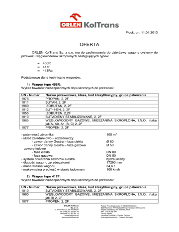 Płock, dn. 11.04.2013 OFERTA ORLEN KolTrans Sp. z o.o. ma do zaoferowania do dzierżawy wagony cysterny do przewozu węglowodorów skroplonych następujących typów: • • • 456R 417F 413Ra Podstawowe dane techniczne wagonów: 1) Wagon typu 456R: Wykaz towarów niebezpiecznych dopuszczonych do przewozu: UN - Numer 1978 1011 1969 1012 1055 1010 1965 1077 Nazwa przewozowa, klasa, kod klasyfikacyjny, grupa pakowania PROPAN, 2, 2F BUTAN, 2, 2F IZOBUTAN, 2, 2F BUT-1-EN, 2, 2F IZOBUTEN, 2,2F BUTADIENY STABILIZOWANE, 2, 2F WĘGLOWODORY GAZOWE, MIESZANINA SKROPLONA, I.N.O., (taka jak A, A0, A1, B, C) 2, 2F PROPEN, 2, 2F - pojemność zbiornika - układ załadunkowo – rozładowczy: - zawór denny Gestra – faza ciekła - zawór denny Gestra – faza gazowa zawory kulowe - faza ciekła - faza gazowa - system otwierania zaworów Gestra - długość wagonu ze zderzakami - masa własna wagonu - maksymalna prędkość w stanie ładownym 105 m3 Ø 80 Ø 50 DN 80 DN 50 hydrauliczny 17290 mm 34,6 t. 100 km/h 2) Wagon typu 417F: Wykaz towarów niebezpiecznych dopuszczonych do przewozu: UN - Numer 1010 1965 1077 Nazwa przewozowa, klasa, kod klasyfikacyjny, grupa pakowania BUTADIENY STABILIZOWANE, 2, 2F WĘGLOWODORY GAZOWE, MIESZANINA SKROPLONA, I.N.O., (taka jak B) 2, 2F PROPEN, 2, 2F ORLEN KolTrans Sp. z o.o. ul. Chemików 7, 09-411 Płock tel. (+48 24) 256 64 44 fax (+48 24) 367 90 14 [email protected] www.orlenkoltrans.pl Rejestr Przedsiębiorców Nr KRS 0000028251 Sąd Rejonowy XIV Wydział Gospodarczy w Warszawie Kapitał zakładowy: 40.859.000,00 zł NIP: 774-26-58-299 Zarząd Spółki: Jarosław Szaliński – Prezes Zarządu Andrzej Łobodziński – Członek Zarządu Dodatkowo część wagonów typu 417F posiada rozszerzoną listę towarów o następujące towary: UN - Numer 1011 1012 1027 1055 1969 1978 Nazwa przewozowa, klasa, kod klasyfikacyjny, grupa pakowania BUTAN BUT-1-EN lub cis-BUT-2-EN lub trans-BUT-2-EN lub BUTENY, MIESZANINA CYKLOPROPAN IZOBUTEN IZOBUTAN PROPAN - pojemność zbiornika - układ załadunkowo – rozładowczy: - zawór denny Gestra – faza ciekła - zawór denny Gestra – faza gazowa zawory kulowe - faza ciekła - faza gazowa - system otwierania zaworów Gestra - długość wagonu ze zderzakami - masa własna wagonu - maksymalna prędkość w stanie ładownym 108 m3 Ø 80 Ø 50 DN 80 DN 50 mechaniczny 18340 mm 35 t. 100 km/h 3) Wagon typu 413Ra: Wykaz towarów niebezpiecznych dopuszczonych do przewozu: UN - Numer 1010 1965 1077 Nazwa przewozowa, klasa, kod klasyfikacyjny, grupa pakowania BUTADIENY STABILIZOWANE, 2, 2F WĘGLOWODORY GAZOWE, MIESZANINA SKROPLONA, I.N.O., (taka jak B) 2, 2F PROPEN, 2, 2F - pojemność zbiornika - układ załadunkowo – rozładowczy: - zawór denny Gestra – faza ciekła - zawór denny Gestra – faza gazowa zawory kulowe - faza ciekła - faza gazowa - system otwierania zaworów Gestra - długość wagonu ze zderzakami - masa własna wagonu - maksymalna prędkość w stanie ładownym 90 m3 Ø 80 Ø 50 DN 80 DN 50 mechaniczny 17040 mm 38 t. 100 km/h Zapytania prosimy przesyłać na adres: [email protected] Po otrzymaniu zapytania przygotujemy, oraz prześlemy kompleksową ofertę. Termin ważności oferty do dnia 09.05.2013 ORLEN KolTrans Sp. z o.o. ul. Chemików 7, 09-411 Płock tel. (+48 24) 256 64 44 fax (+48 24) 367 90 14 [email protected] www.orlenkoltrans.pl Rejestr Przedsiębiorców Nr KRS 0000028251 Sąd Rejonowy XIV Wydział Gospodarczy w Warszawie Kapitał zakładowy: 40.859.000,00 zł NIP: 774-26-58-299 Zarząd Spółki: Jarosław Szaliński – Prezes Zarządu Andrzej Łobodziński – Członek Zarządu