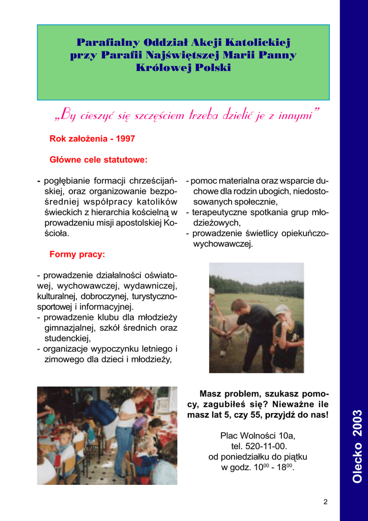 Parafialny Oddzia³ Akcji Katolickiej przy Parafii Najwiêtszej Marii Panny Królowej Polski By cieszyæ siê szczêciem trzeba dzieliæ je z innymi Rok za³o¿enia - 1997 G³ówne cele statutowe: - pog³êbianie formacji chrzecijañ- - pomoc materialna oraz wsparcie duskiej, oraz organizowanie bezpochowe dla rodzin ubogich, niedostoredniej wspó³pracy katolików sowanych spo³ecznie, wieckich z hierarchia kocieln¹ w - terapeutyczne spotkania grup m³oprowadzeniu misji apostolskiej Kodzie¿owych, cio³a. - prowadzenie wietlicy opiekuñczowychowawczej. Formy pracy: Masz problem, szukasz pomocy, zagubi³e siê? Niewa¿ne ile masz lat 5, czy 55, przyjd do nas! Plac Wolnoci 10a, tel. 520-11-00. od poniedzia³ku do pi¹tku w godz. 1000 - 1800. 2 Olecko 2003 - prowadzenie dzia³alnoci owiatowej, wychowawczej, wydawniczej, kulturalnej, dobroczynej, turystycznosportowej i informacyjnej. - prowadzenie klubu dla m³odzie¿y gimnazjalnej, szkó³ rednich oraz studenckiej, - organizacje wypoczynku letniego i zimowego dla dzieci i m³odzie¿y,